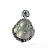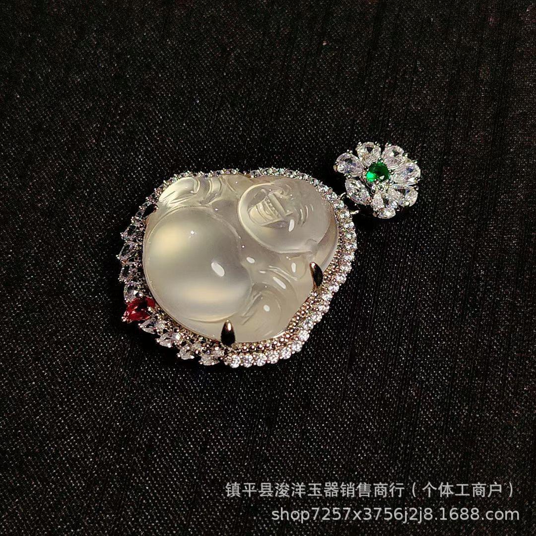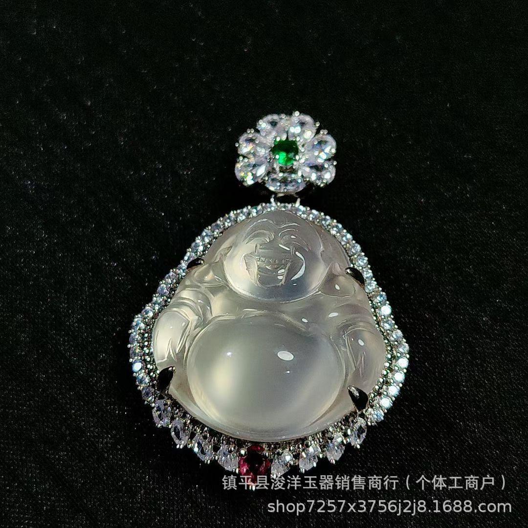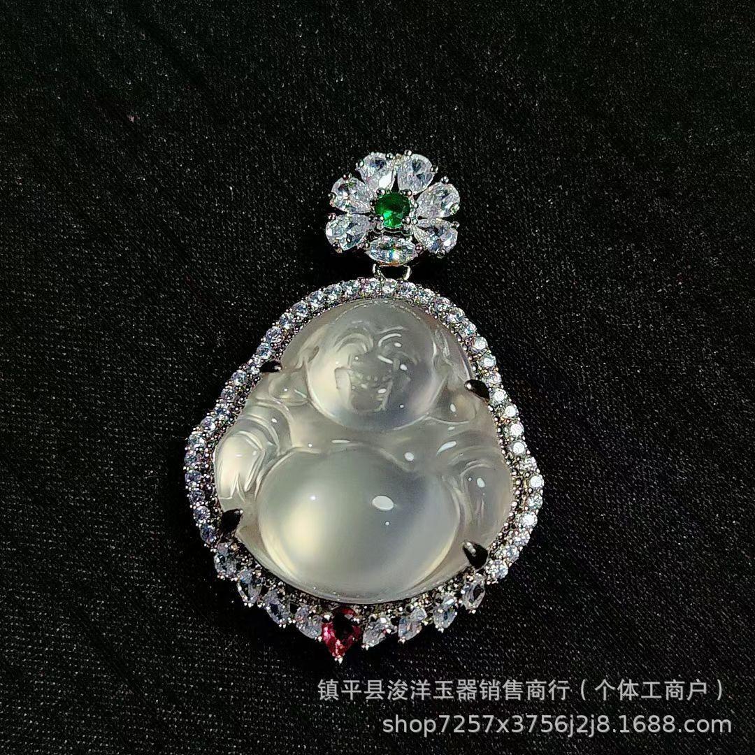 Colgante de calcedonia blanca bañado en plata de hielo alto al por mayor, Buda Maitreya, Buda sonriente, colgante de jade y ágata blanca, regalo