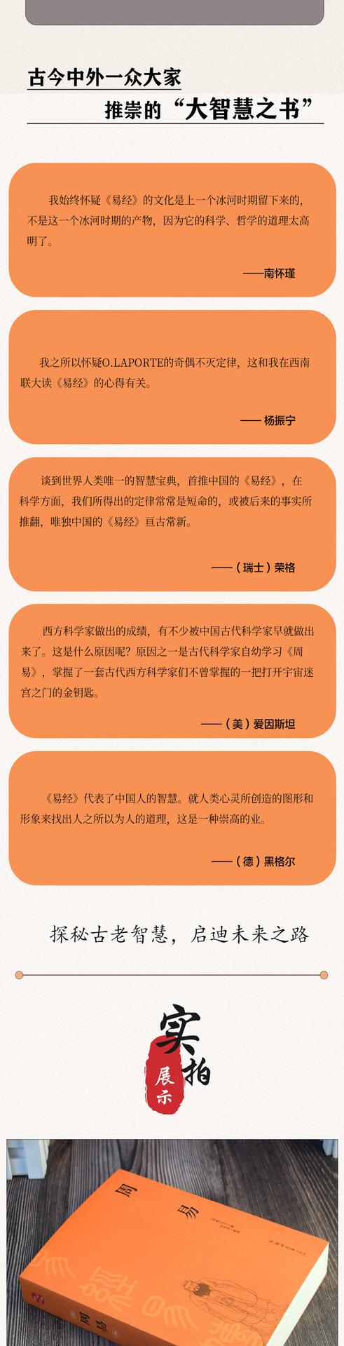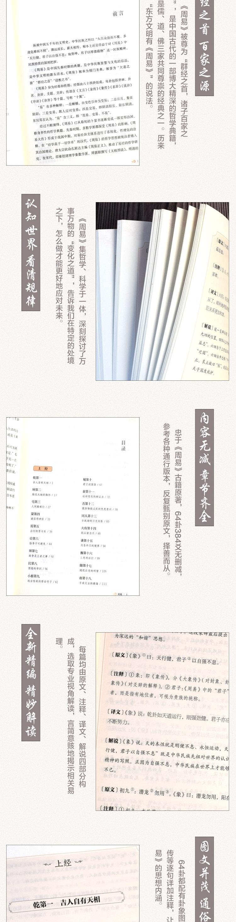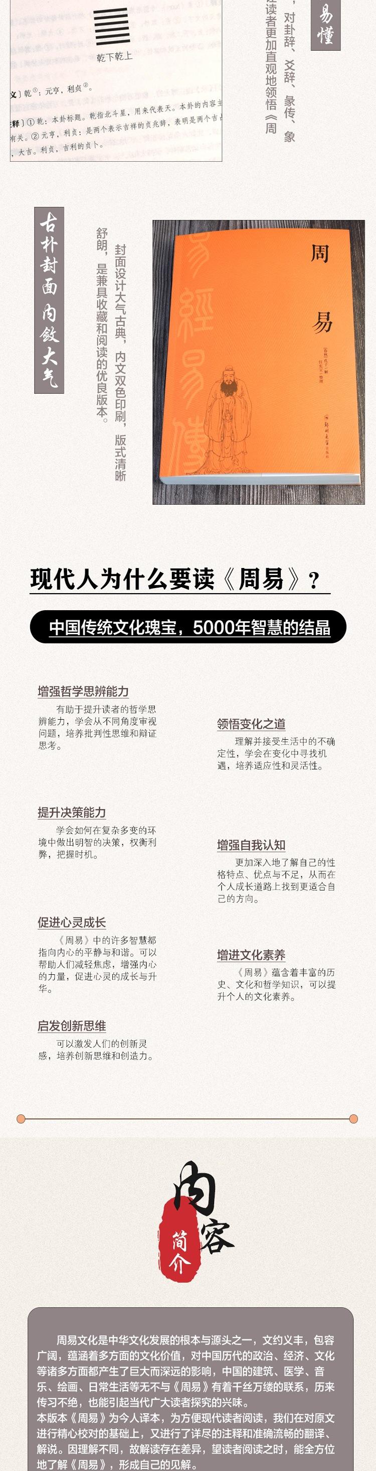 Esta versión del Zhouyi es una traducción moderna. Para facilitar a los lectores modernos, hemos revisado cuidadosamente el texto original y proporcionado anotaciones detalladas, traducción y explicación precisas y fluidas. Debido a diferentes entendimientos, existen diferencias en la interpretación. Esperamos que los lectores puedan comprender plenamente el Zhouyi y formar sus propias opiniones al leerlo.