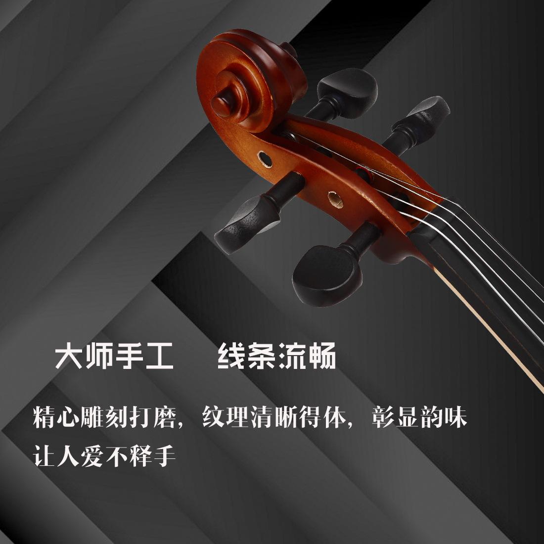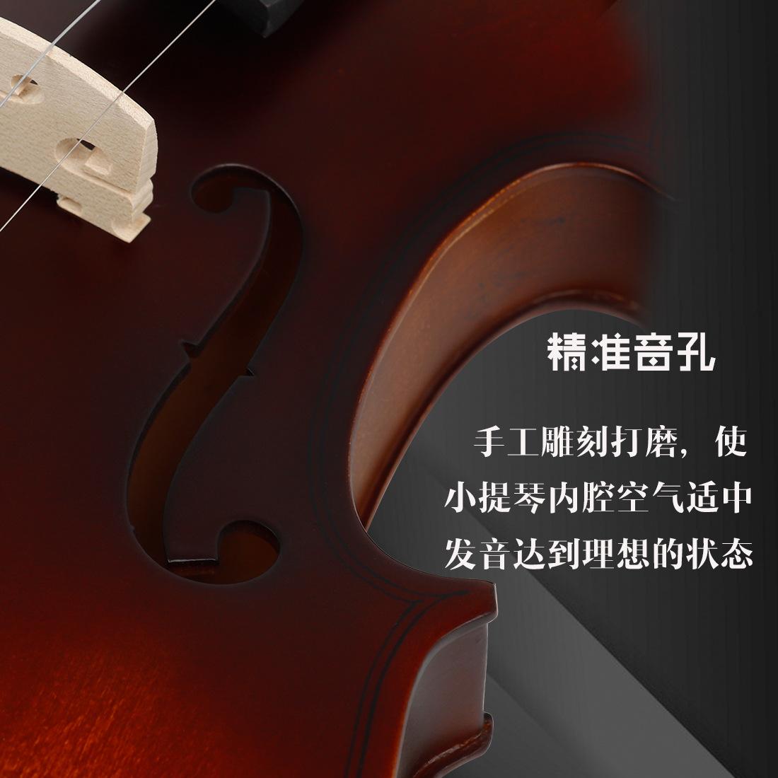 Punto de venta: Maestría artesanal, líneas suaves, cuidadosamente tallado y pulido, textura clara, mostrando encanto, haciendo que la gente lo ame, orificios de sonido precisos, tallados y pulidos a mano, haciendo que el aire interno del violín sea moderado, logrando el estado ideal de sonido, mentonera de ébano, conforme al diseño ergonómico, ajustándose a la cara, suave y uniforme, cómodo de tocar, fileteado puramente hecho a mano, previniendo eficazmente que el violín se agriete debido a la expansión y contracción térmica, realzando el efecto artístico |