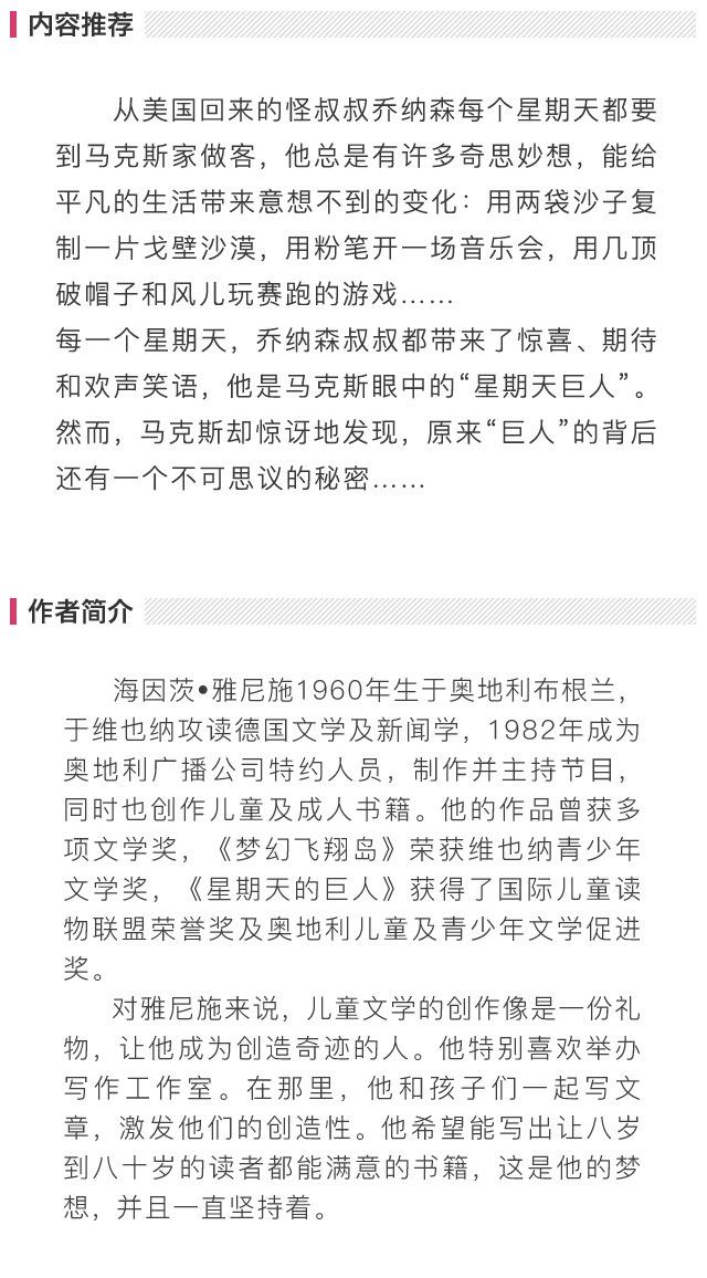 El tío Jonathan, que regresó de los Estados Unidos, visitaba la casa de Max todos los domingos. Siempre tenía muchas ideas maravillosas que podían traer cambios inesperados a la vida ordinaria: usar dos sacos de arena para replicar un Desierto de Gobi, usar tiza para celebrar un concierto, usar unos sombreros rotos para jugar una carrera con el viento... Cada domingo, el tío Jonathan traía sorpresas, expectativas y risas. Era el "Gigante del Domingo" a los ojos de Max. Sin embargo, Max se sorprendió al descubrir que había un secreto increíble detrás del "Gigante"...