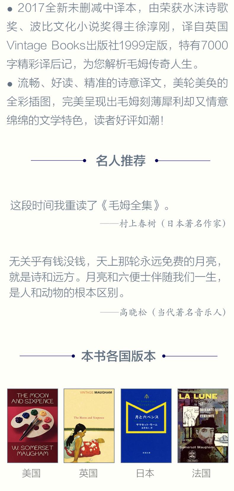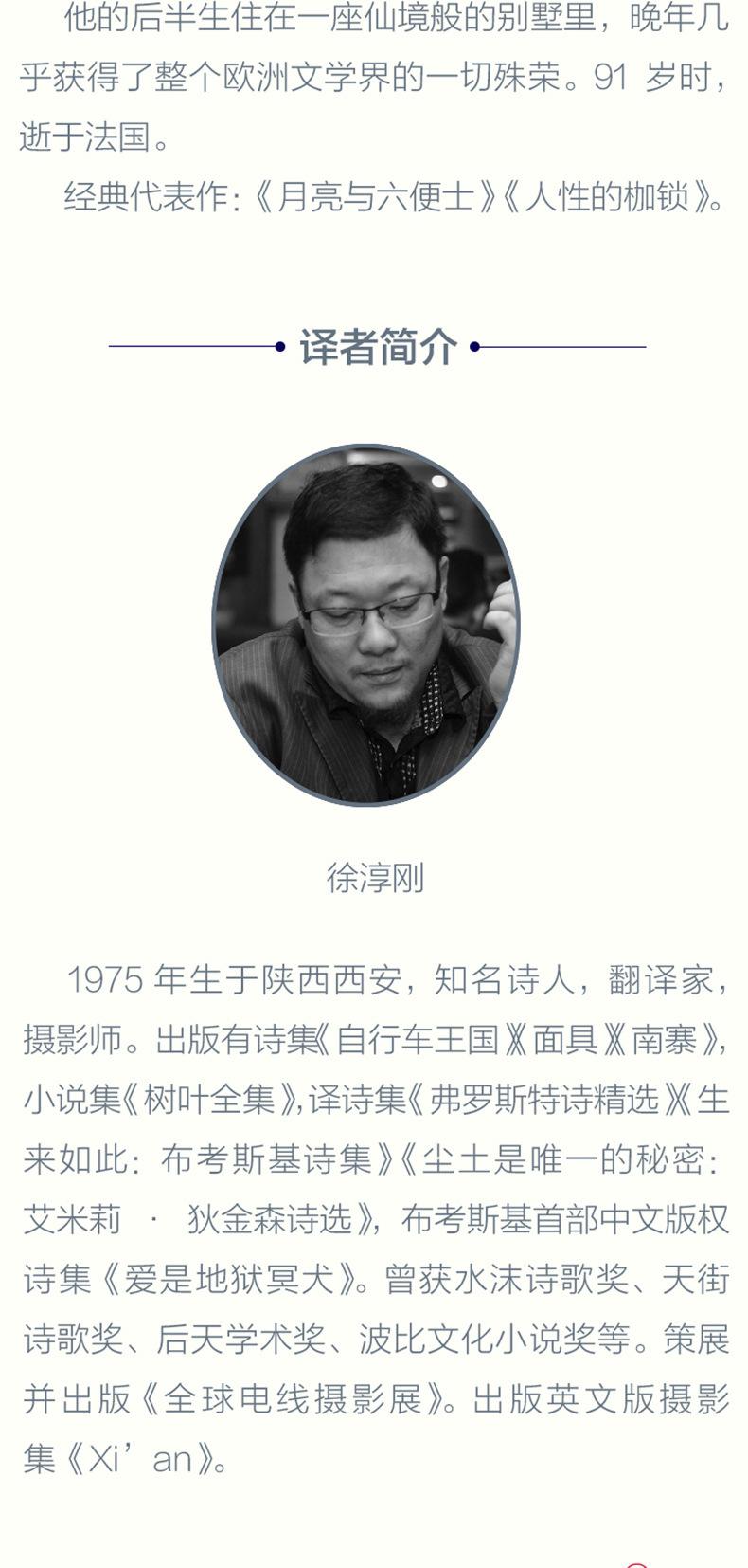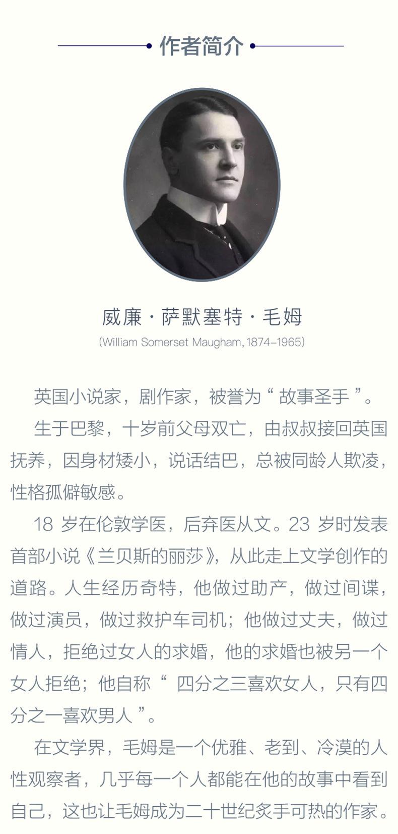 Maugham (1874-1965) es un famoso novelista, dramaturgo y ensayista británico. Entre sus obras más representativas se encuentran "De la esclavitud humana", "La luna y seis peniques" y "El filo de la navaja". Sus obras, especialmente sus novelas, se basan en una amplia gama de materiales, poseen una profunda comprensión de la naturaleza humana, un estilo sencillo, un contexto claro, personajes distintivos y giros argumentales. Es conocido como "el mejor narrador" y cuenta con un número considerable de lectores de todos los ámbitos. Sus obras han sido traducidas a varios idiomas y muchas de sus novelas han sido adaptadas al cine. Es uno de los escritores más populares de la primera mitad del siglo XX.