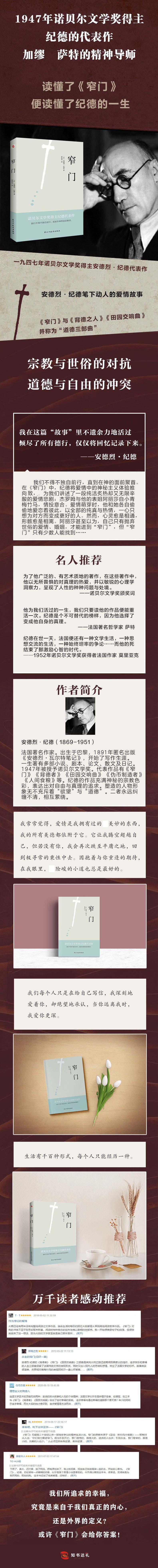 Breve introducción al autor André Gide (1869-1951), escritor francés. Nacido en París, inició su carrera literaria de forma anónima en 1891 con la publicación de «El Manual de Verde». A lo largo de su vida escribió numerosas novelas, obras de teatro, ensayos y diarios. Fue galardonado con el Premio Nobel de Literatura en 1947. Entre sus obras más representativas se encuentran «La puerta estrecha», «El idiota», «Sinfonía pastoral», «El creador» y «El alimento del mundo». Las obras de Gide, impregnadas de misterio, expresan la búsqueda de la libertad y la verdad. Sus personajes están llenos de anhelo y moralidad, conceptos que se entrelazan constantemente. Perfil del traductor: Tian Weihua, nacido en 1979 y graduado de la Universidad de Estudios Internacionales de Xi'an, cuenta con una amplia trayectoria en la traducción. Entre sus principales obras traducidas se encuentran "Walden", "El Principito", "El crisantemo y el cuchillo", "La luna y seis peniques", "El velo", "La espada", etc.