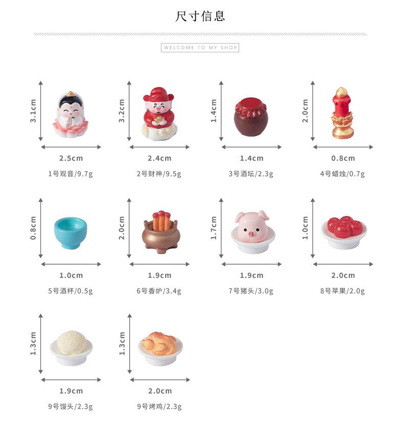 Guanyin no. 1, God of wealth no. 2, Wine altar no. 3, Candle no. 4, No. 6 incense burner, No. 7 pig head, Appl...