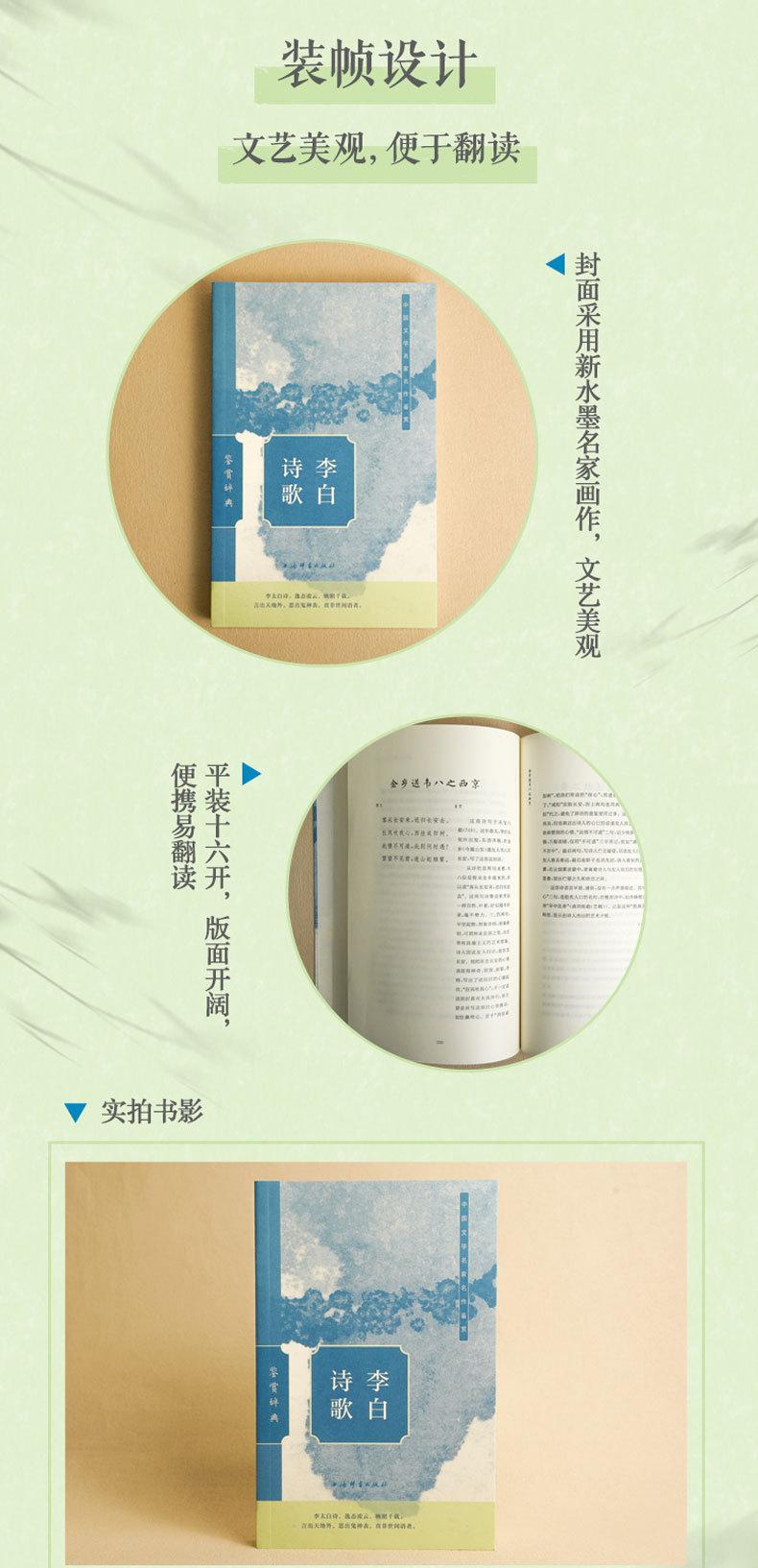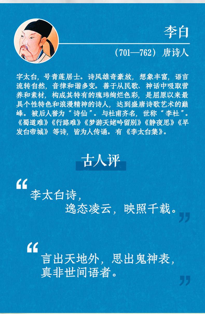 Las famosas obras recopiladas en el "Diccionario de Apreciación de la Poesía de Li Bai" abarcan diversas categorías, incluyendo poemas, letras y ensayos, que reflejan exhaustivamente los logros literarios de Li Bai. Los artículos de apreciación están escritos por maestros contemporáneos como Ma Maoyuan y Liu Xuekai. Son fáciles de entender, fluidos y vívidos. No solo analizan en profundidad los méritos de las obras maestras de Li Bai, sino que también permiten al lector común apreciar la rima y la belleza emocional de las mismas.