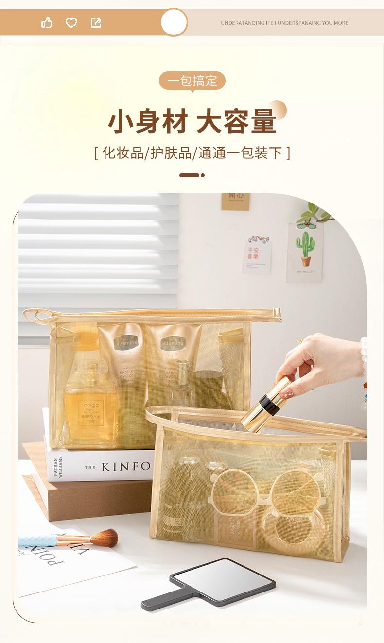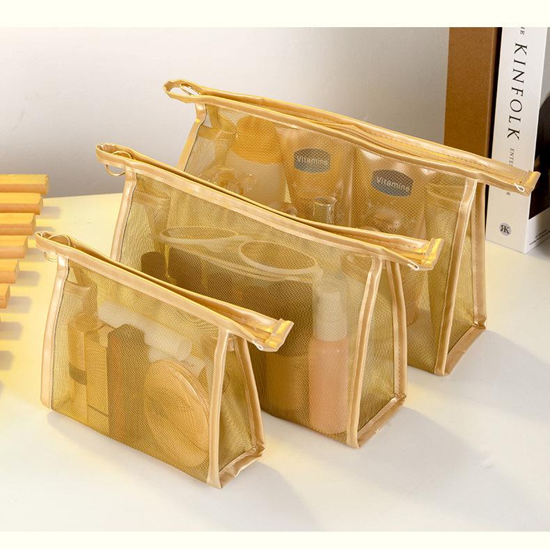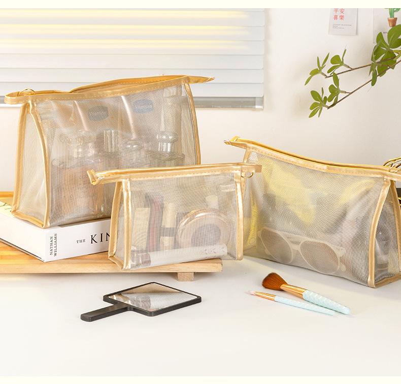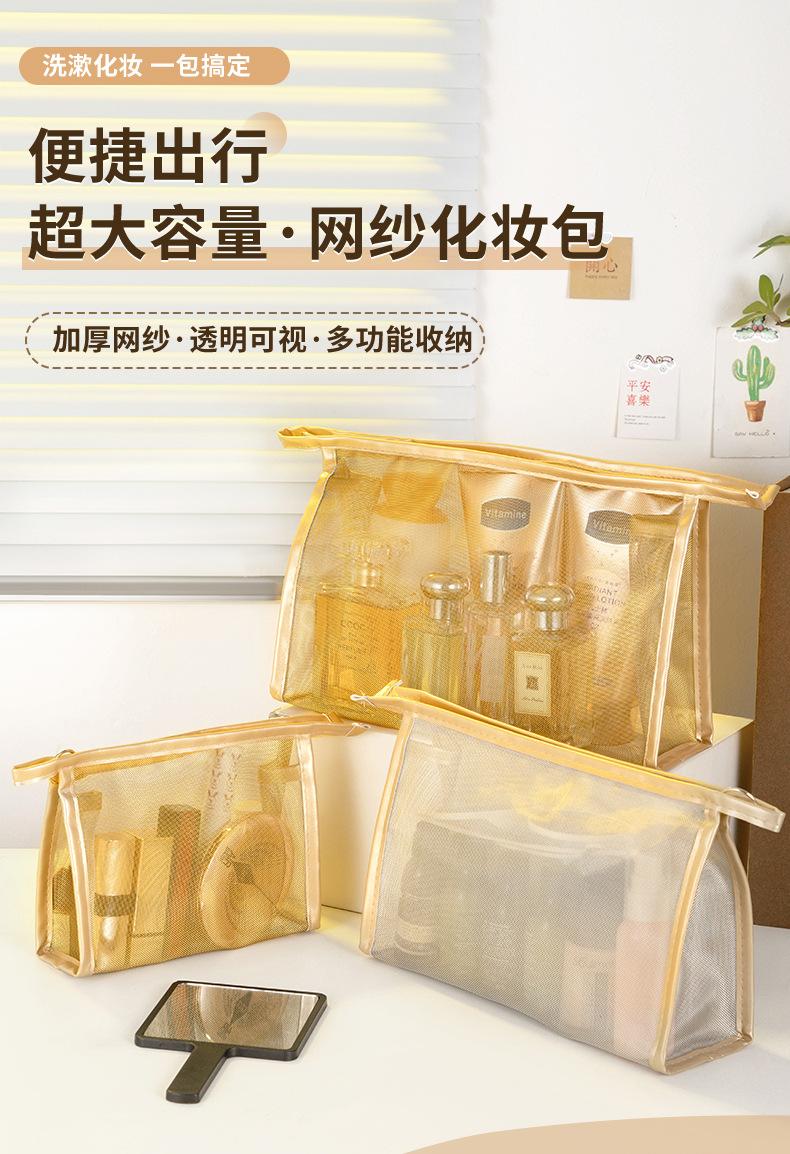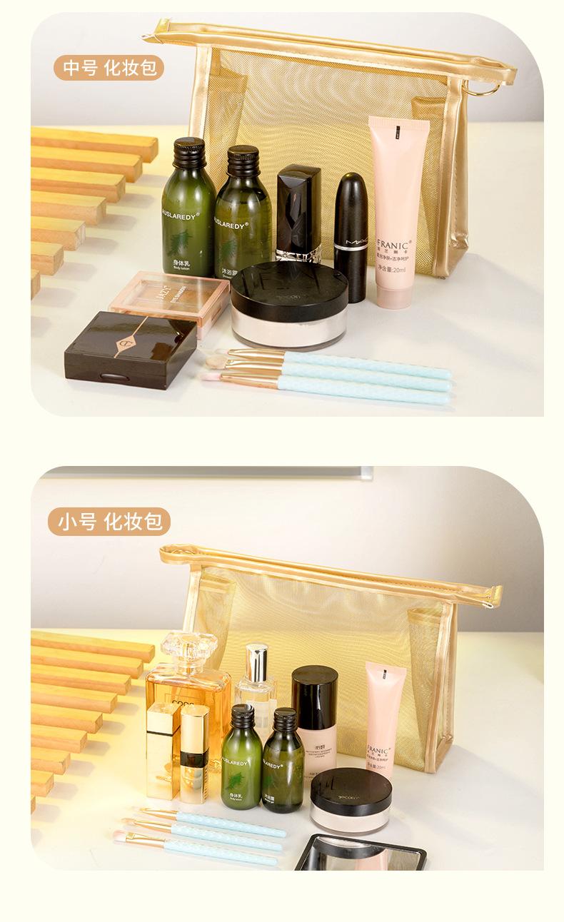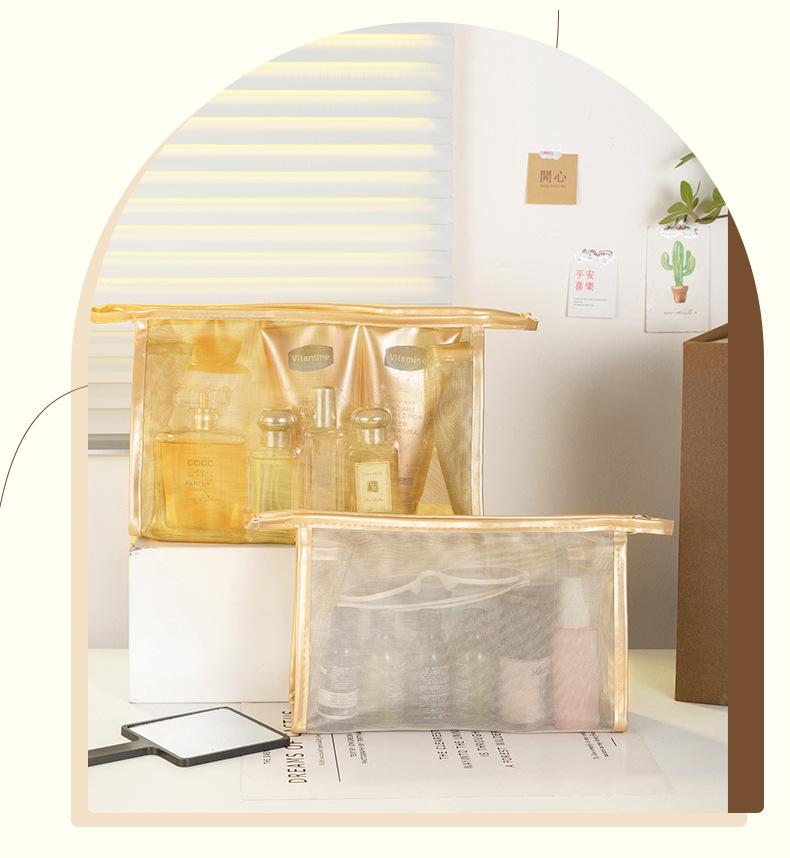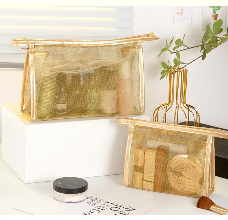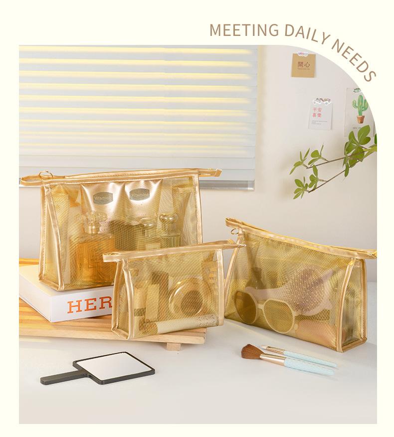 Bolsa de maquillaje de malla estéreo, bolsa de viaje multifuncional, bolsa grande para guardar pintalabios y cuidado de la piel, bolsa de cosméticos dorada.