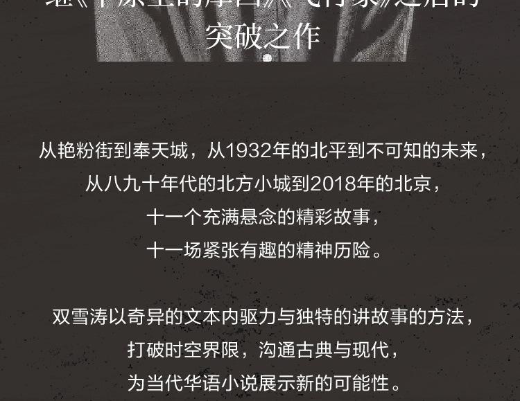 La nueva colección de cuentos de Shuang Xuetao consta de once novelas. A diferencia de "Moisés en la llanura" y "El aviador", que tienen un fuerte sabor regional del noreste, esta es abierta y libre en términos de temas creativos y métodos narrativos. Hay cinco historias sobre pueblos pequeños en el norte, dos sobre la historia de la República de China y cuatro sobre la vida en Beijing. La línea temporal va desde Beiping en la República de China hasta el presente en 2018 y el futuro lleno de ciencia ficción. Once historias, cada una es un mundo independiente, con sentimientos espaciales y temporales y ritmos atmosféricos completamente diferentes. El autor escribe sobre la situación de las personas en la vida diaria en historias legendarias, y busca y construye el mundo espiritual perteneciente a los individuos en la situación de la gente común. No importa el tiempo y el espacio, esta cualidad espiritual que pertenece a uno mismo no puede ser privada por nadie. No importa cuán grandes sean el viento y las olas, debes apretar el timón. Esta colección de novelas trata sobre gente común, sobre gente valiente, sobre el deseo y sobre la compasión.