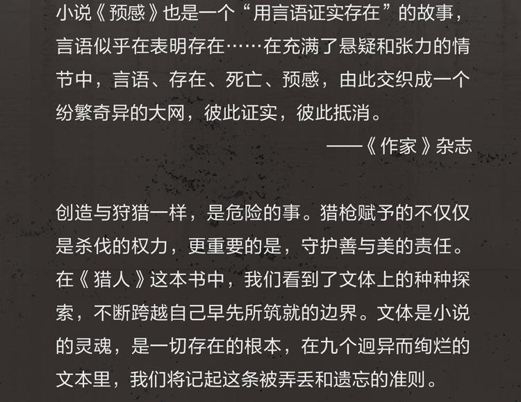 ◎ Recomendado para listar literatura y novelas◎ Código de barras◎ Prólogo a extractos de libro nuevo Las once novelas actuales fueron básicamente escritas en los últimos quince meses. Mi plan original era escribir una novela al mes a partir de principios de 2018, con cada novela de unas 10,000 palabras. Para finales de año, debería poder guardar doce novelas, ponerlas en una bolsa, agitarlas y escuchar sus voces. De hecho, no lo logré. El número fue menor de lo que pensaba, y el tiempo fue relativamente largo. Sucedieron muchas cosas este año, fuera de la literatura, y dentro de la literatura. Soy una persona ansiosa, pero nunca he estado muy triste. Este año aprendí a estar triste, y también aprendí a estar inquieto, perdido, indefenso, y cada uno tiene su propio destino. Así que ahora, solo tengo once novelas en mis manos. La última no se terminó hasta marzo de 2019. Algunas tienen un poco más de 10,000 palabras, y algunas menos. La más corta tiene más de 5,000 palabras, y fue escrita antes. Las miré e intenté ordenarlas de principio a fin, pero descubrí que no me quedaban fuerzas. Resultó que había usado todas mis fuerzas al escribirlas, de modo que no puedo hablar de ellas ahora y las estoy olvidando. Si las novelas del pasado eran como las obras de un tornero apoyado en el torno, entonces estas novelas son como el trigo que los agricultores cortan con hoces. Nunca podría imaginar que en mi escritura hasta ahora, me he convertido en un cosechador de trigo.