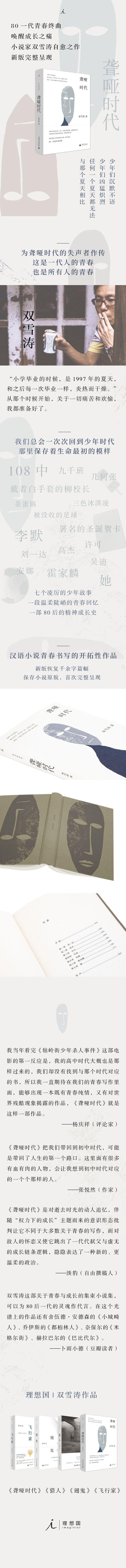 Shuang Xuetao, nacido en la década de 1980 en Shenyang, es novelista. Ganador del primer premio del primer Chinese World Film and Novel Award, "Joven Escritor del Año" del tercer One-way Street Bookstore Literary Award, y Personalidad del Año de GQ. Sus obras publicadas incluyen "Fantasma Alado", "La Era de la Sordera", "Notas de Tengo" y las colecciones de cuentos "Moisés en las Llanuras" y "El Aviador".