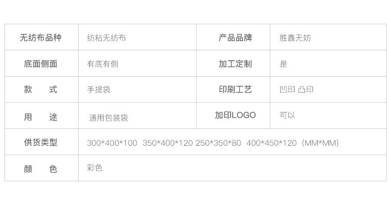 Foshan Shengxin Nonwoven Products Co., Ltd. lleva muchos años prestando atención a la protección del medio ambiente y se compromete a crear un entorno de vida limpio y confortable. Shengxin es un fabricante profesional de bolsas no tejidas y ofrece servicios personalizados. Con una larga experiencia en producción, satisface las necesidades de producción a gran escala y de alta calidad, equipos completos de preimpresión y posimpresión, flujos de proceso diversificados y ofrece a los clientes una variedad de opciones de impresión. Sus principales productos son: bolsas no tejidas, bolsas ecológicas, bolsas portátiles no tejidas, bolsas plegables no tejidas, bolsas perforadas no tejidas, bolsas de compra, bolsas de regalo, bolsas publicitarias, delantales publicitarios, bolsas tridimensionales no tejidas, bolsas Oxford, bolsas de algodón, diversos tipos de bolsas para ropa y vino, y otros productos de embalaje ecológicos. El producto está fabricado con tela no tejida spunbond de polipropileno, que es resistente a la humedad, transpirable, flexible, incombustible y de fácil descomposición. La gestión de la integridad es nuestra base, y el servicio atento es la base de nuestro desarrollo. ¡Les damos la más cordial bienvenida a sus consultas y a su compra!