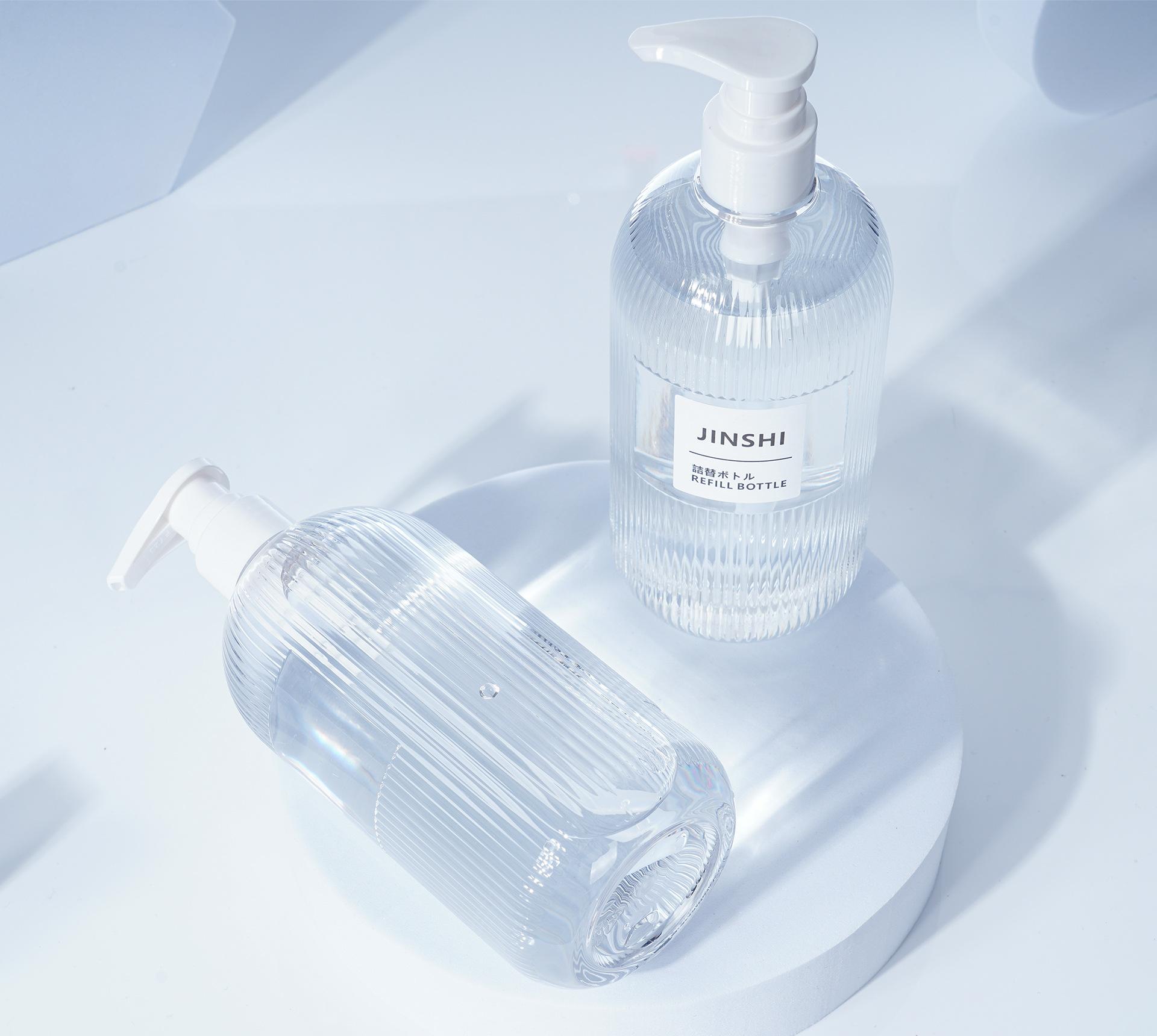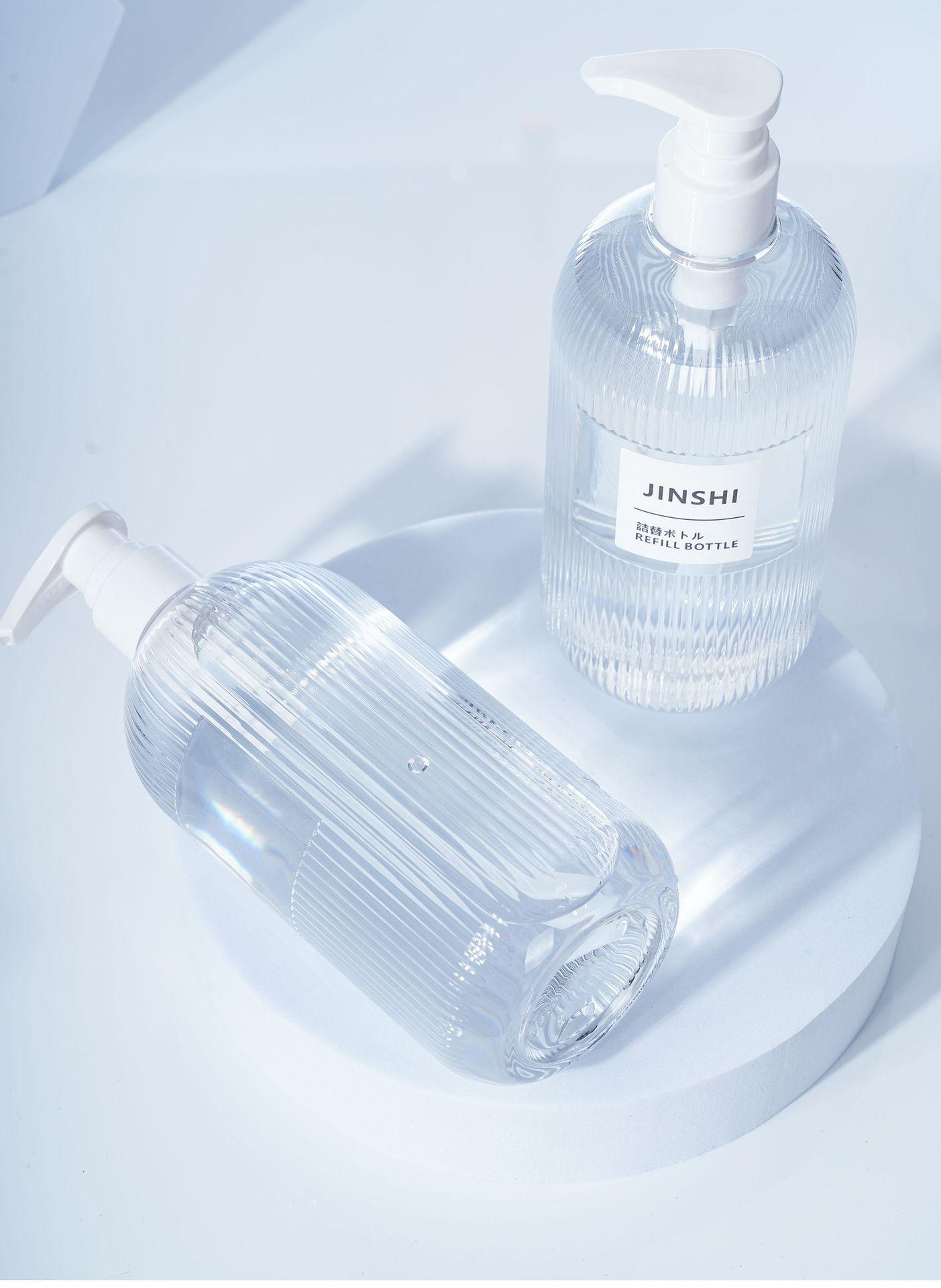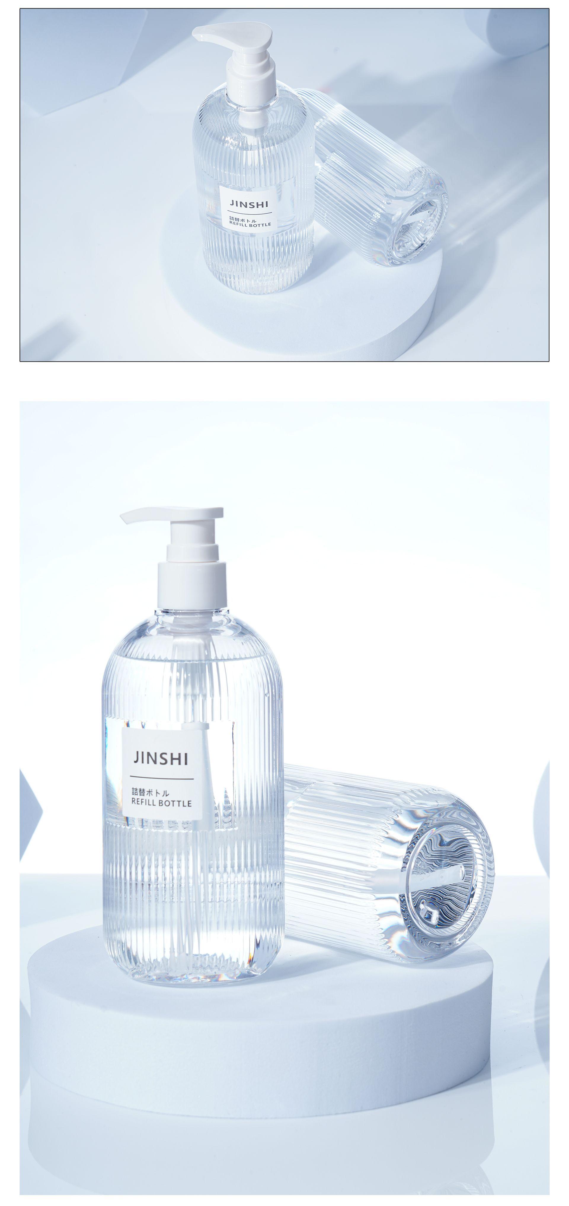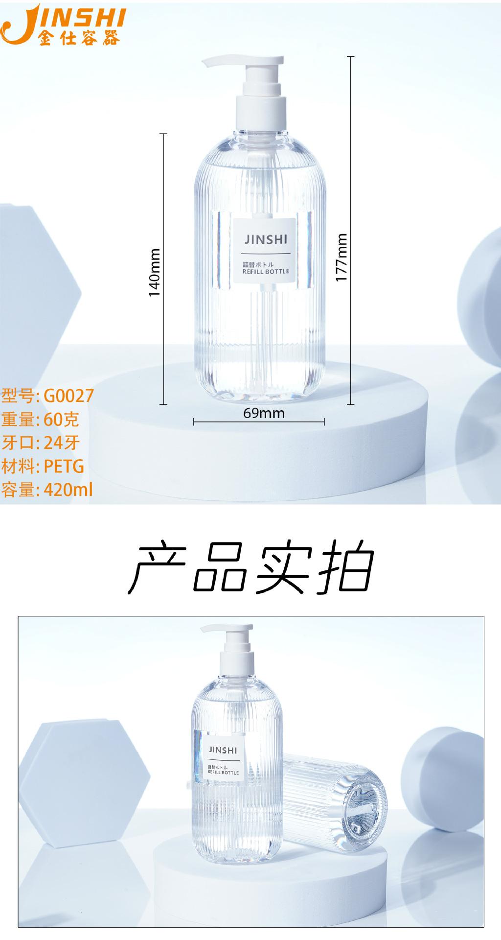 Botella de prensa de 420 ml de fábrica de origen, subembalaje de plástico PET de alta calidad para lavado y protección, botella redonda rayada de PETG, botella de champú de alta gama