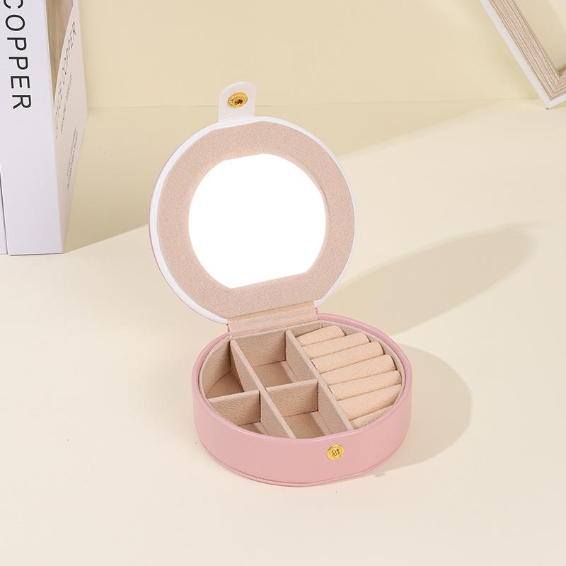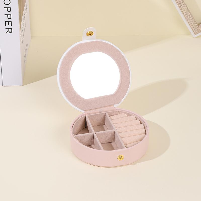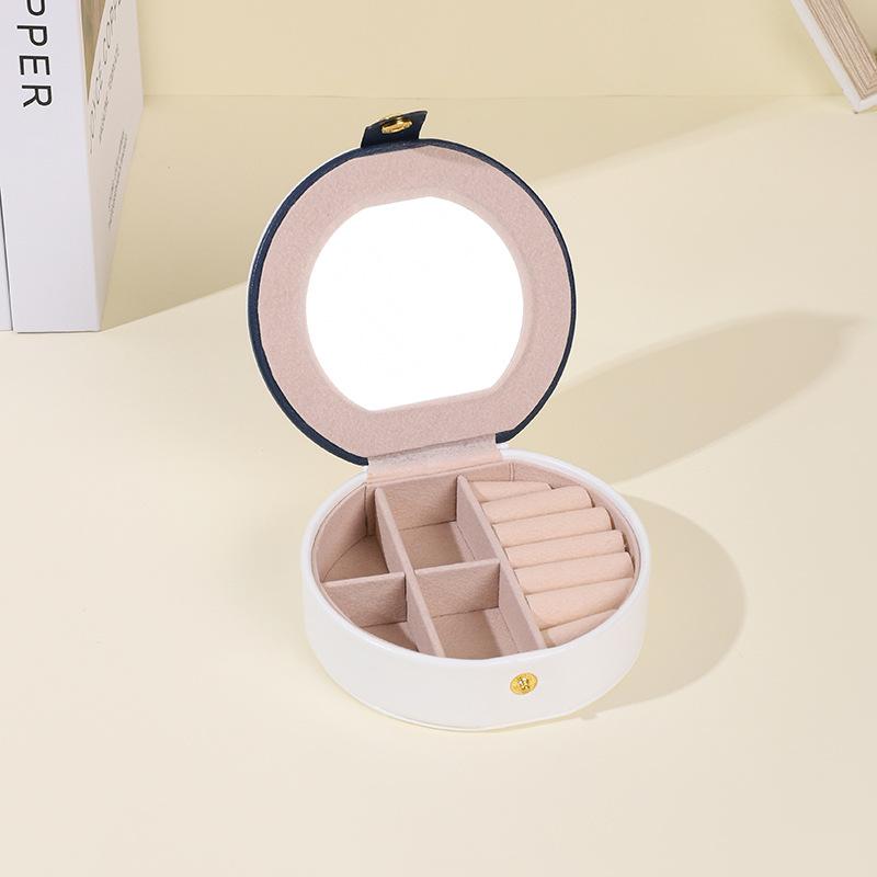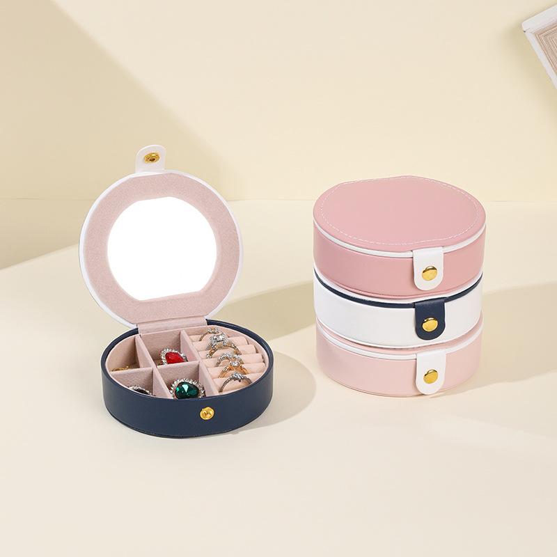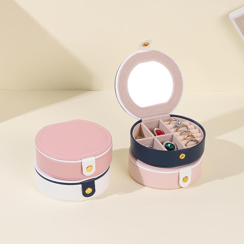 2024 Nueva Caja de Joyería Redonda de Cuero PU con Hebilla Espejo Joyería Joyería Anillo Pendientes Caja de Almacenamiento