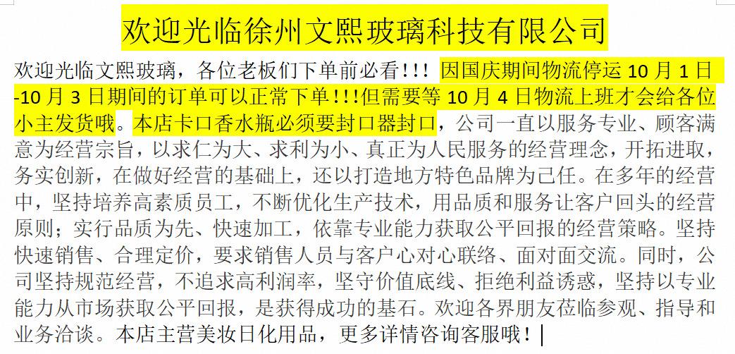 Tamaño del producto botella vacía de 100 ml: altura 10.7 cm, diámetro 7.3 cm, grosor 3.1 cm (medición manual, puede haber un error de 1-2 mm)Material del producto: botella de vidrio blanco cristalinoColor del producto: tapa negra, botella transparente Tipo de producto: botella vacía Impresión de logotipo LOGO: alta temperatura, baja temperatura, serigrafía, estampado en caliente, etiquetado Proceso: esmerilado, pulverización, impresión Uso del producto: embalaje de productos químicos diarios, cuidado personal Tiempo de entrega: 48 horas en stock, 30-45 días para pedidos Método de embalaje: cartón/algodón de embalaje Método de transporte: expreso/logística (elija el método de transporte adecuado para usted) Recordatorio cálido: Todos los productos se producen en masa, y es inevitable que haya algunos productos defectuosos. Si hay algún problema de calidad con el producto, comuníquese con nosotros lo antes posible y lo resolveremos a tiempo. Por favor, no haga comentarios negativos maliciosos, gracias.