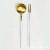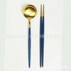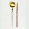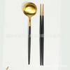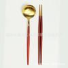 | Juego de vajilla occidental de acero inoxidable 304 con cuchillo, tenedor, cuchara y palillos, con revestimiento de titanio rojo portugués negro y dorado. |
