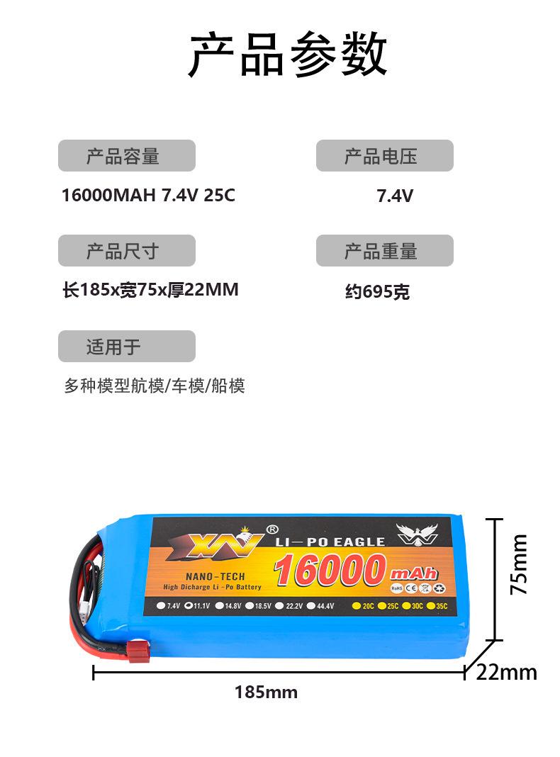 Batería de litio de alta capacidad Eagle King 2S 7,4 V 16000 MAH 25 C, modelo UAV de ala fija, modelo de coche, modelo de barco