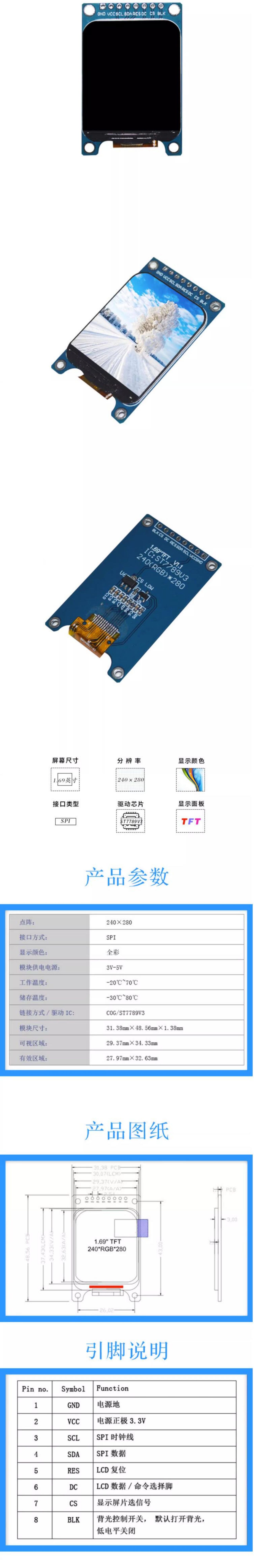 Módulo de Pantalla LCD TFT IPS de 1.69 pulgadas Interfaz SPI Resolución 240x280 Controlador ST7789V