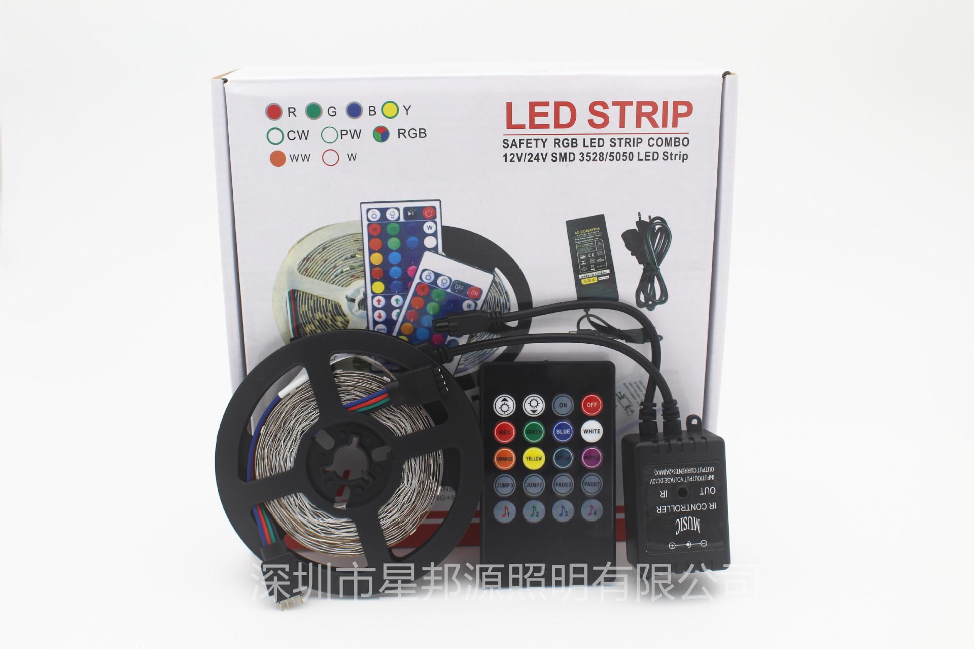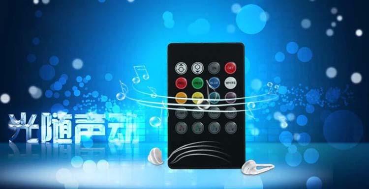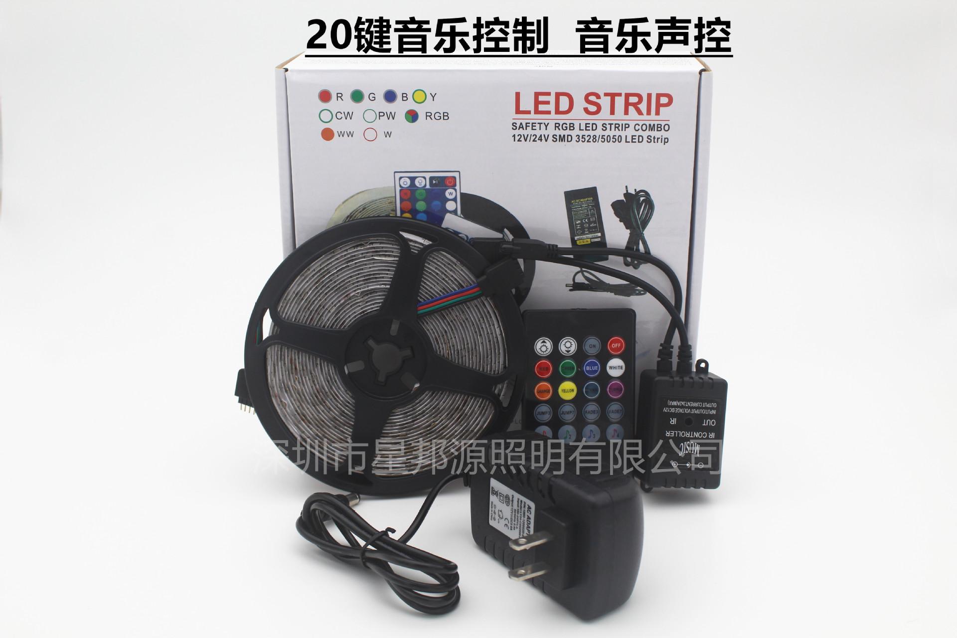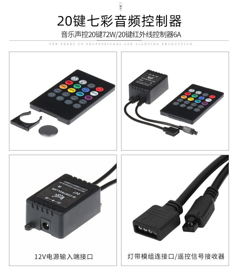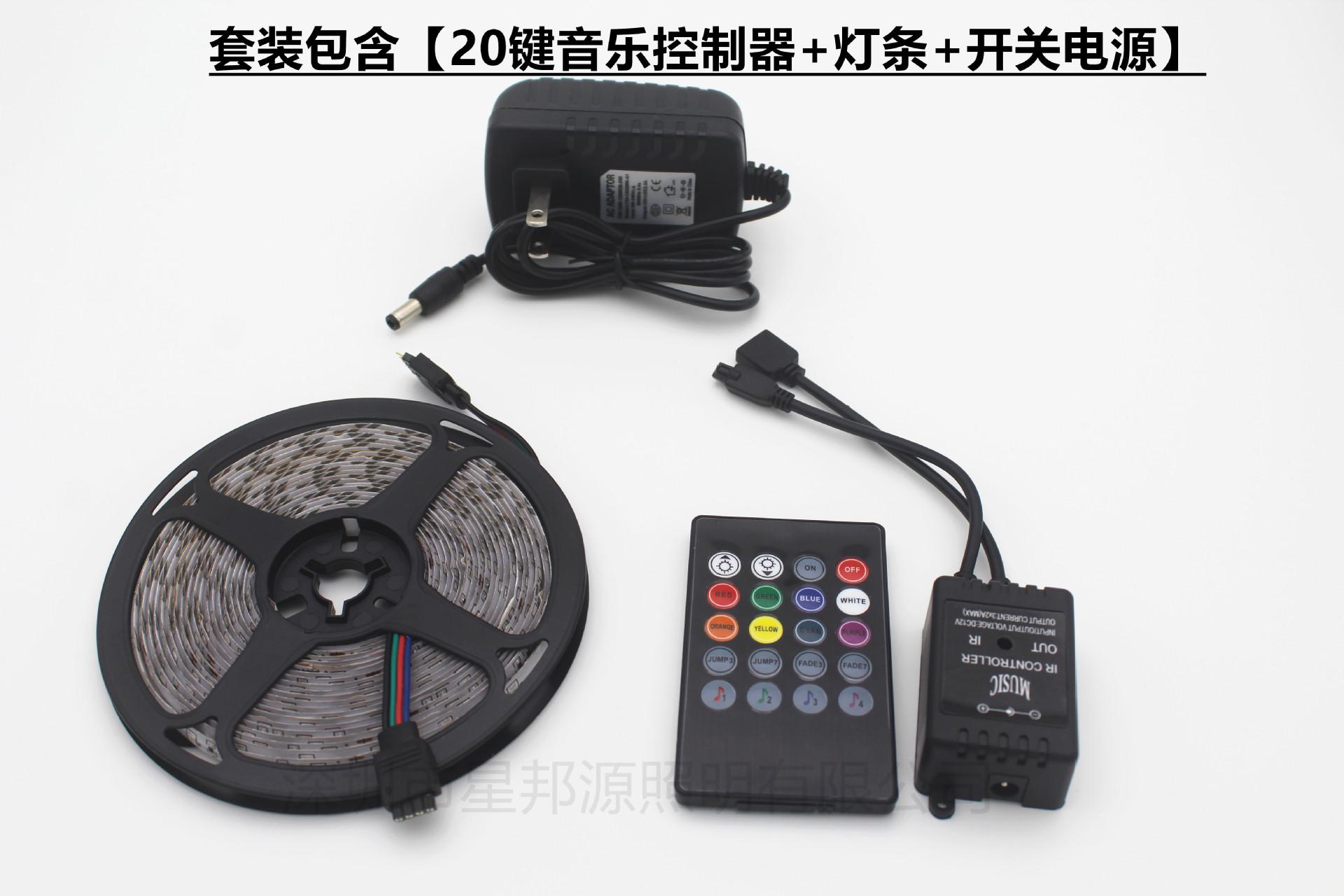 El conjunto incluye [tira de luz de 5 m + controlador de música de 20 teclas + adaptador de corriente de 2 A + caja de embalaje a color]
