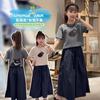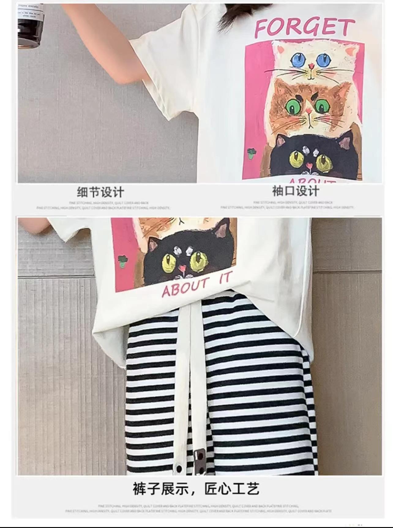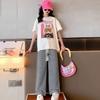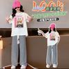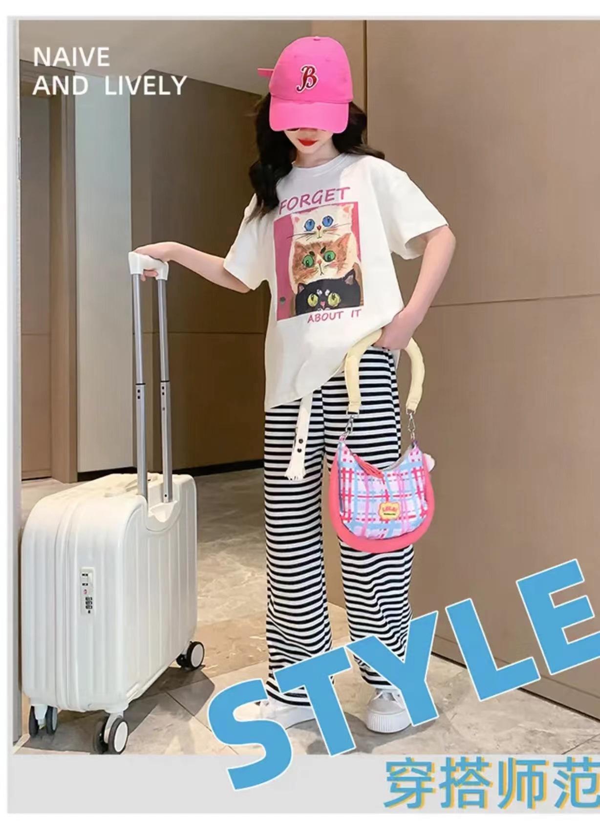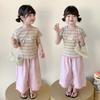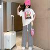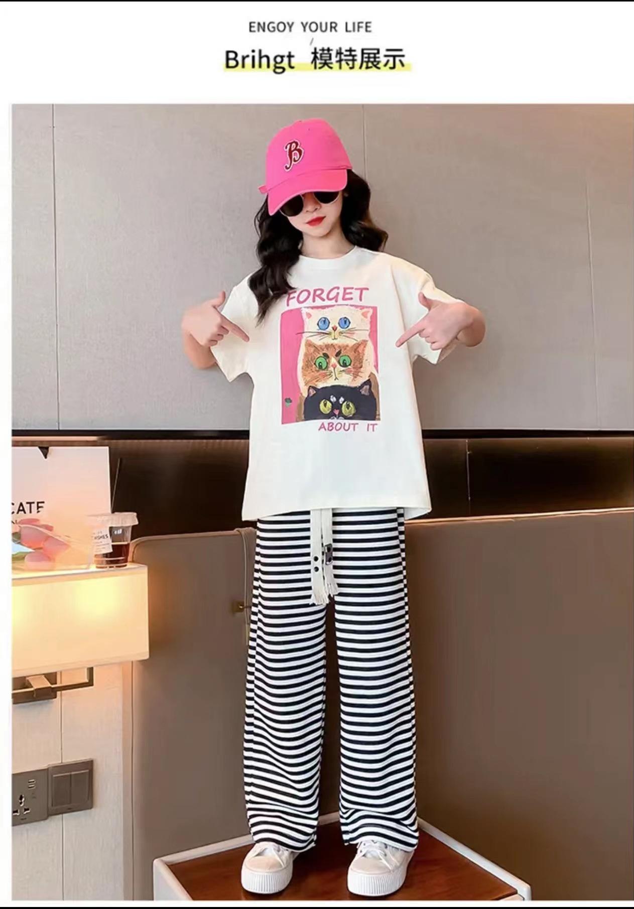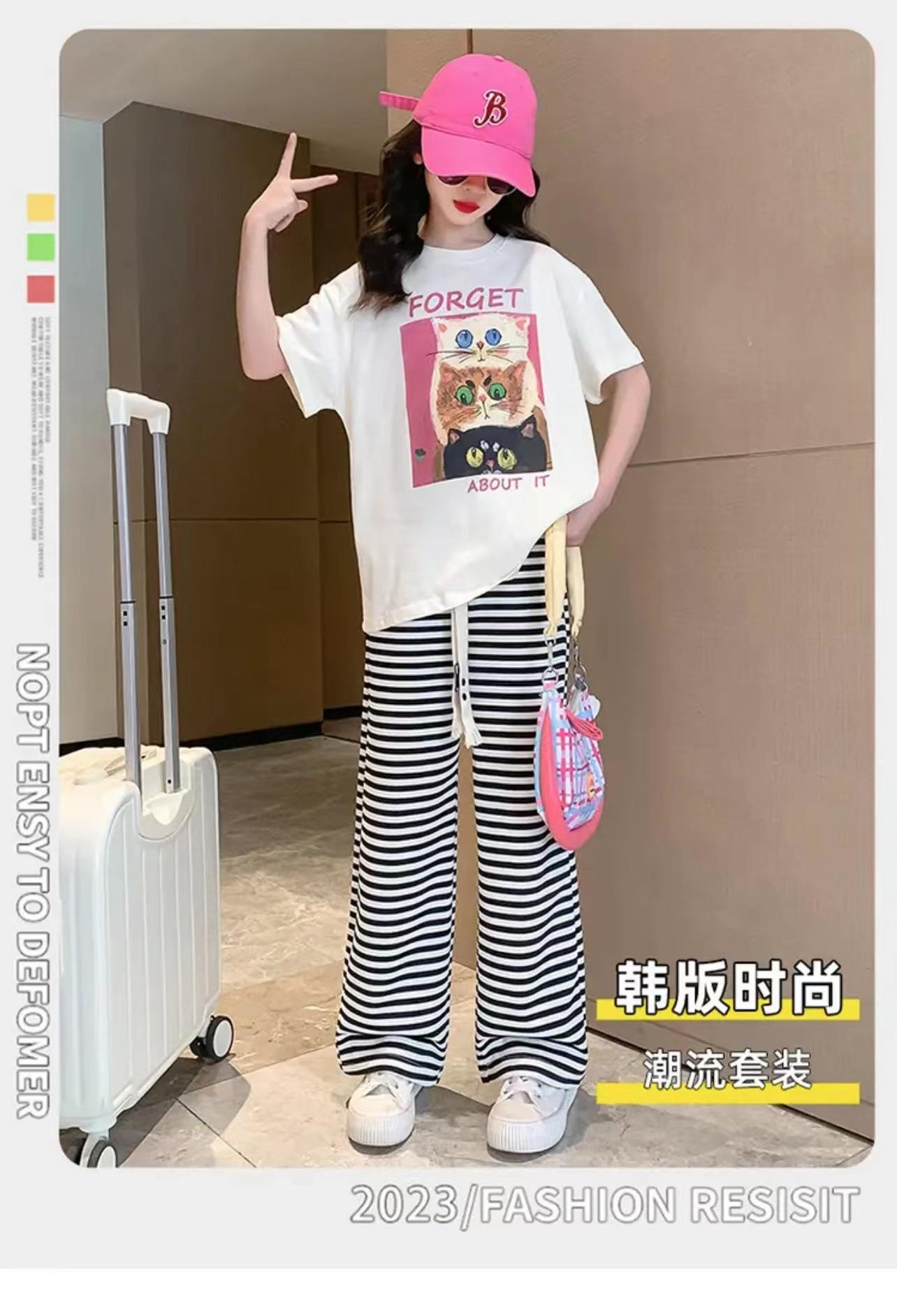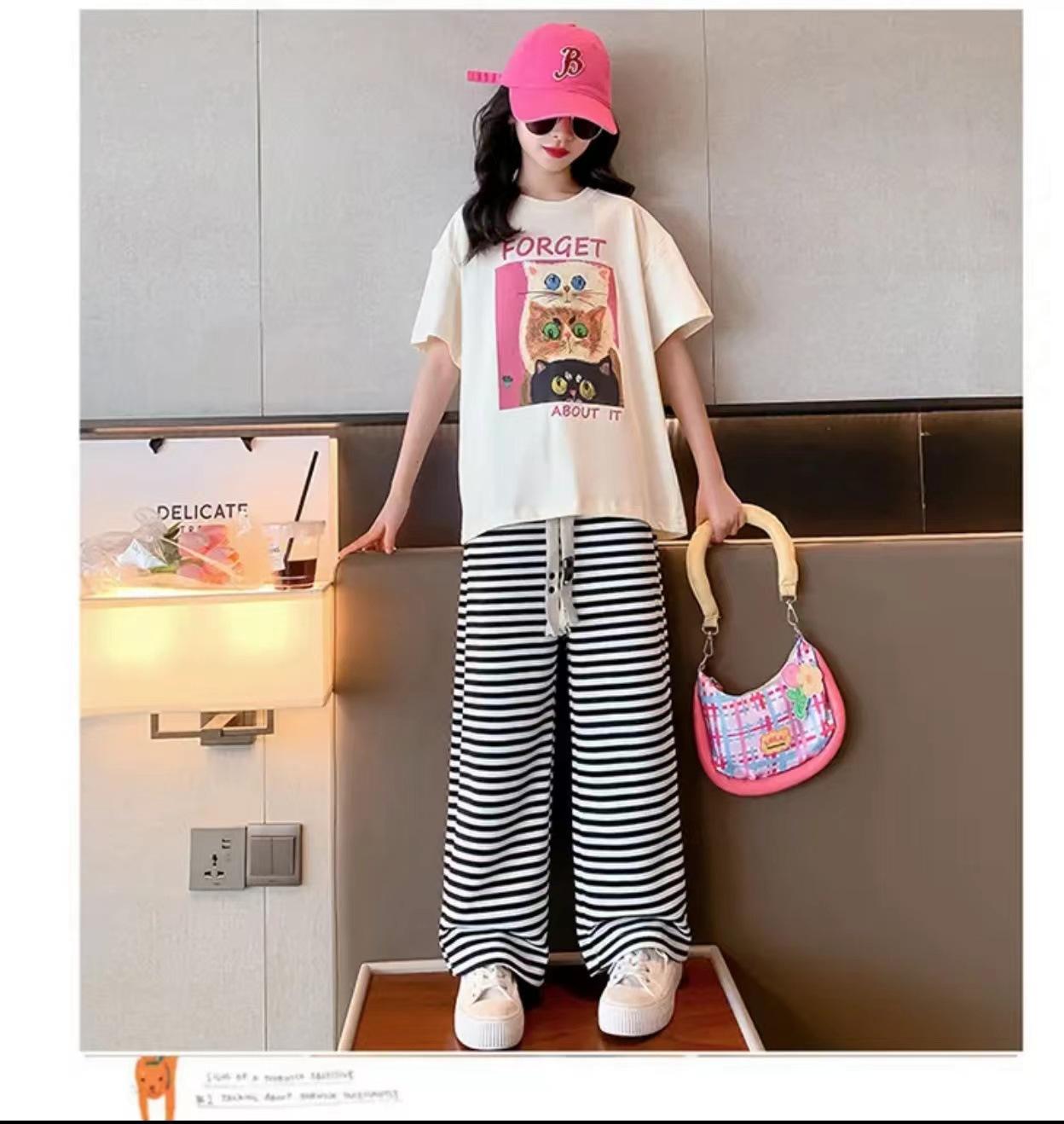 Traje de pantalón a rayas de verano para niña, novedad de 2024, camiseta de dibujos animados para niños grandes, pantalón, traje informal coreano de dos piezas