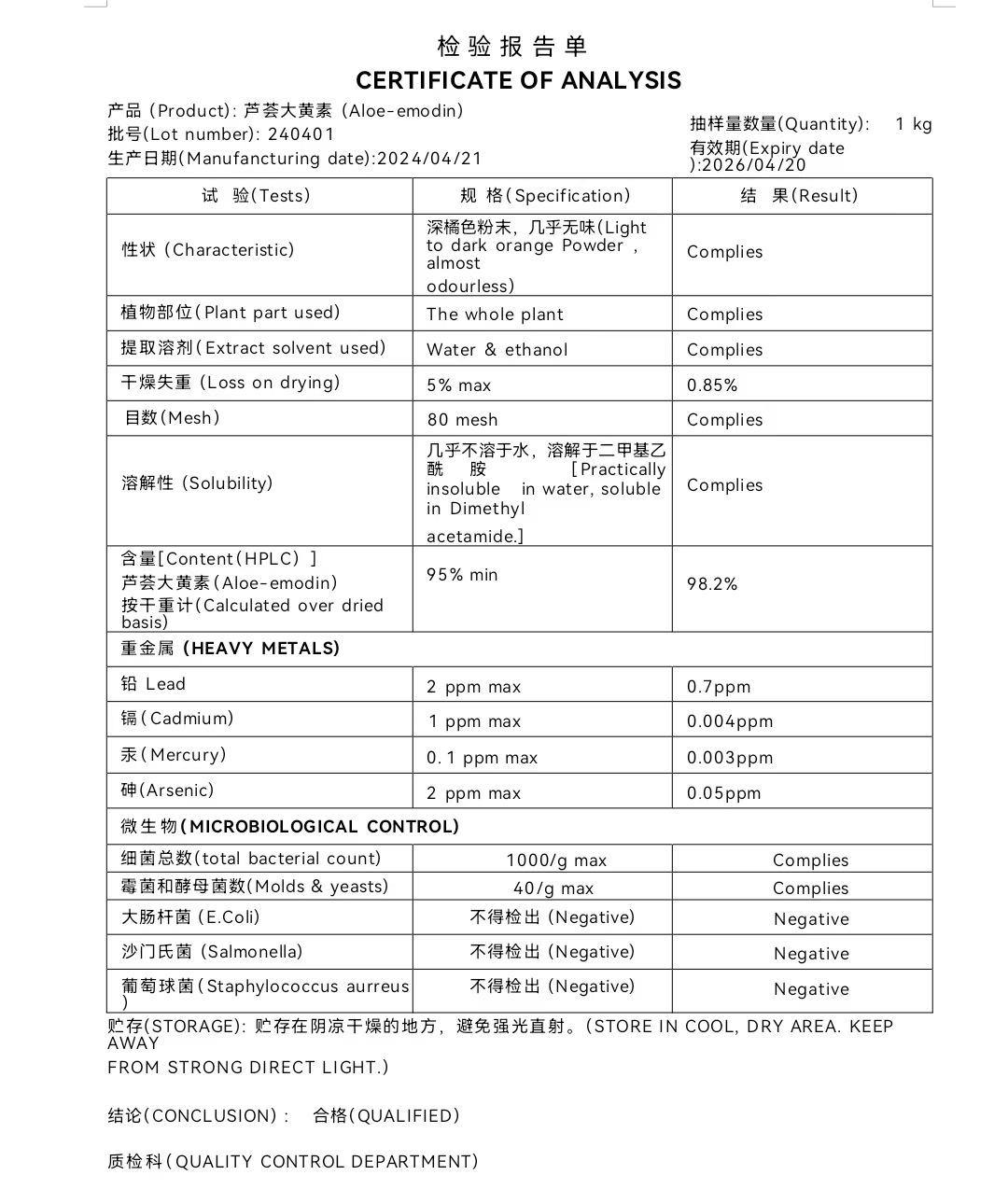 Aloe-emodina 95% HPLC en suministro de stock apoya la detección por terceros de polvo de aloe-emodina grande favorablemente