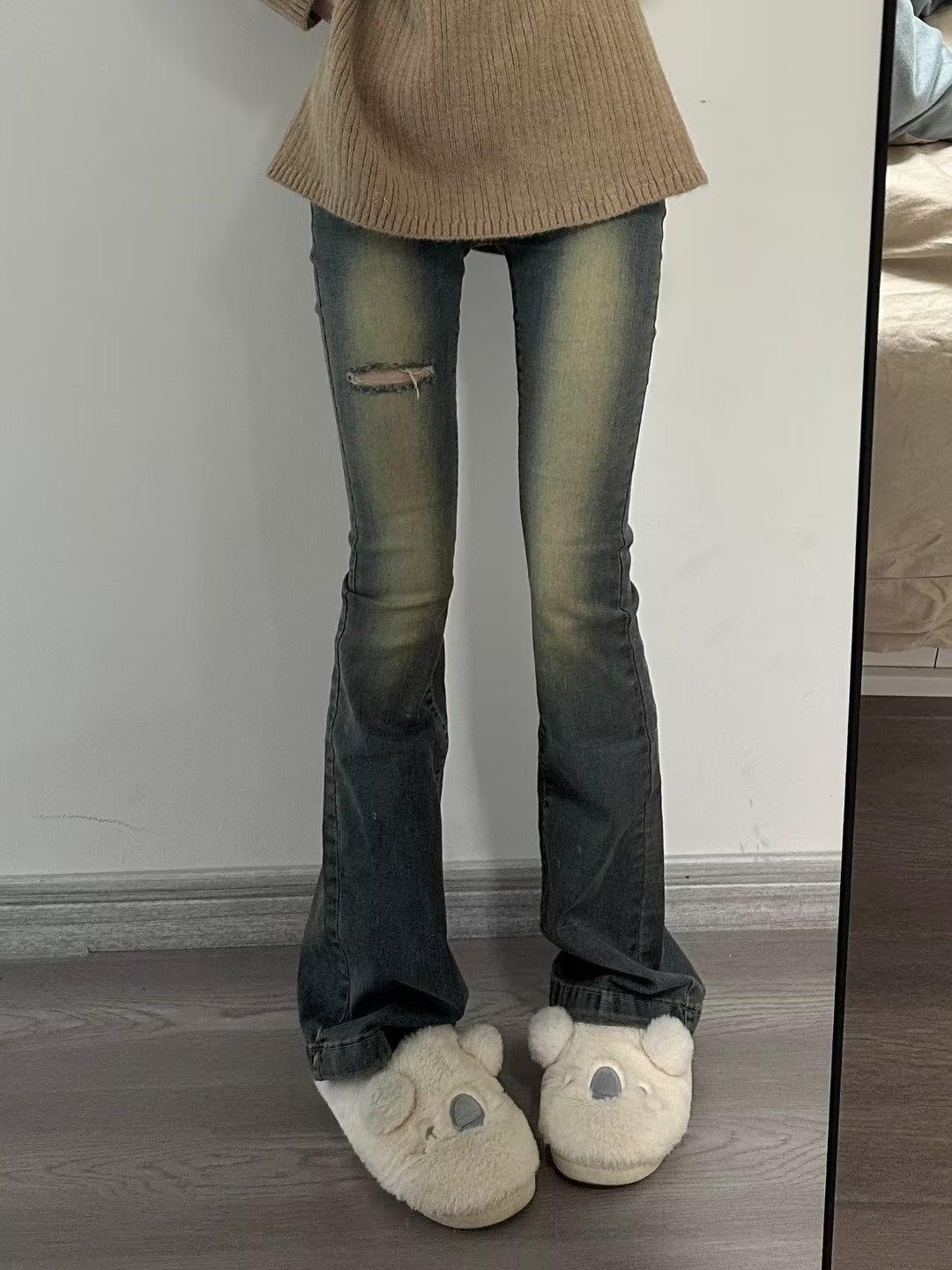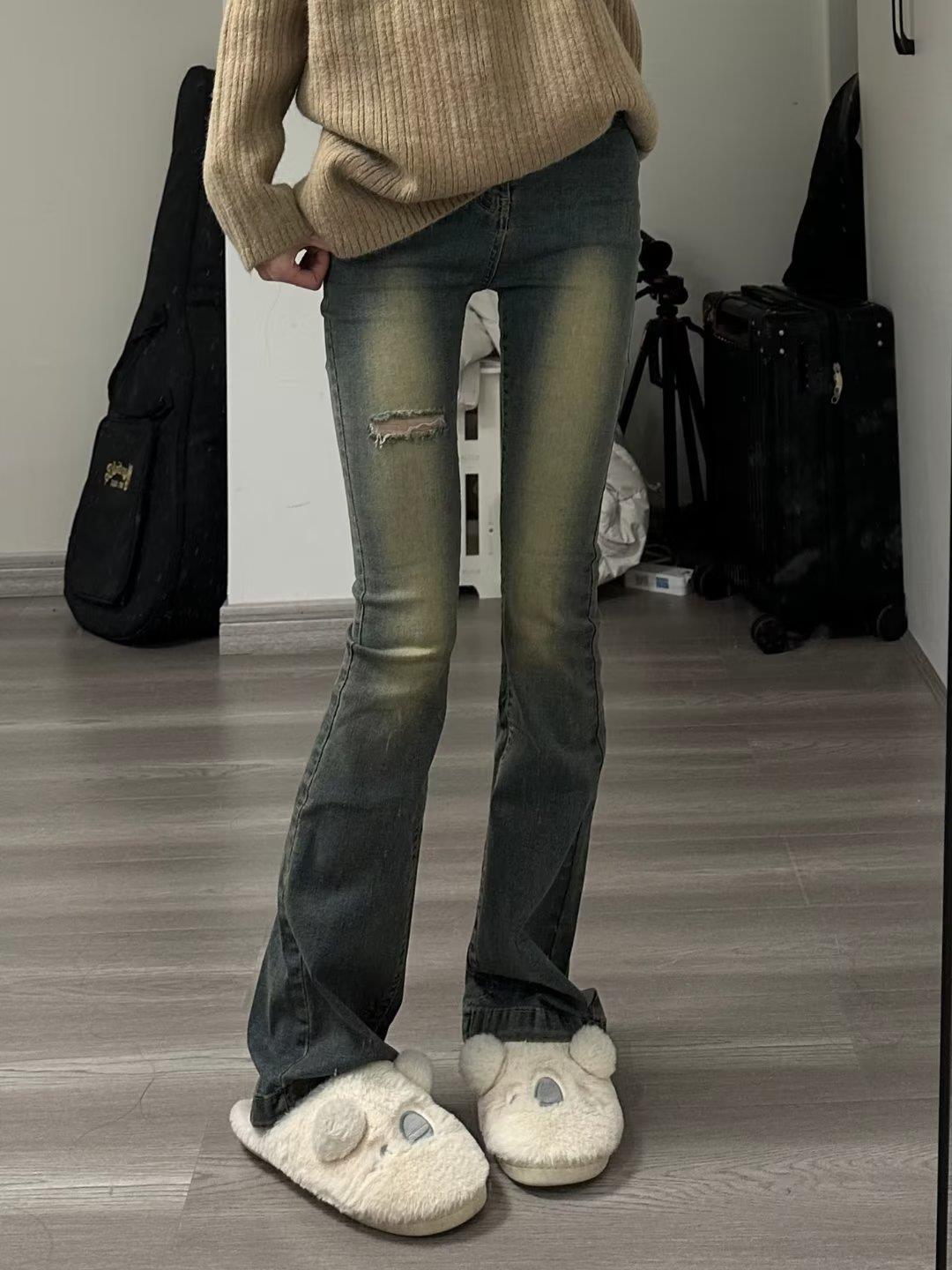 Jeans acampanados rotos para mujer verano nuevo retro cintura alta ajustados elásticos delgados rectos hasta el suelo pantalones de moda