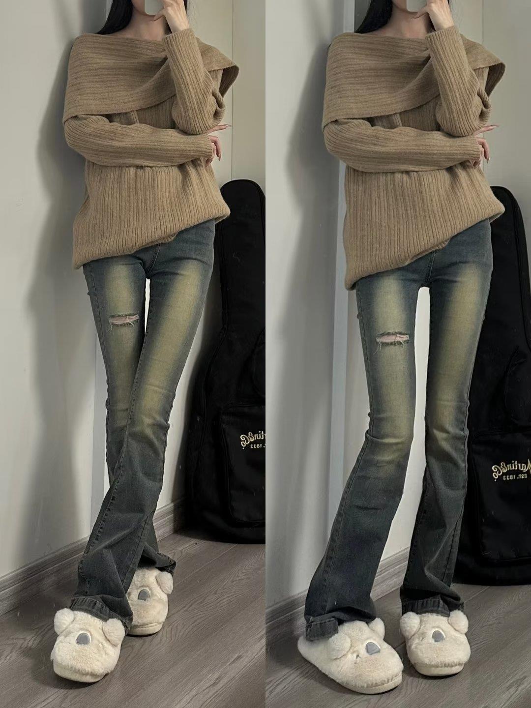 Jeans Acampanados Adelgazantes para Mujer, Estilo Nuevo de Primavera 2025, Rotos de Cintura Alta Retro con Caída hasta el Piso