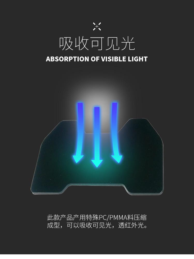 Este producto está hecho de moldeo por compresión de material especial PC/PMMA, que puede absorber la luz visible y transmitir la luz infrarroja.