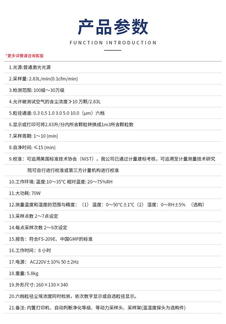 Contador láser de partículas de polvo CLJ-D (pantalla LED) Los indicadores técnicos de esta serie de instrumentos cumplen los requisitos de las regulaciones de verificación JJF1190-2008 emitidas por la Administración General de Metrología. La máquina completa utiliza tecnología de procesamiento de microcomputadora estadounidense y tecnología de empaquetado de parches de chip SMT y sensores y bombas de aire, y puede imprimir directamente los resultados de la prueba. Tiene las características de múltiples funciones, alta precisión de medición, velocidad rápida, fácil de transportar y operación simple. El muestreo del instrumento puede medir simultáneamente el número de partículas de polvo de varios tamaños de partícula, y puede elegir observar el número de partículas de un cierto tamaño de partícula y sus cambios, lo cual es muy conveniente para la investigación, detección y evaluación de diversos entornos limpios. El diseño de rendimiento y la calidad de esta serie de instrumentos son estables y confiables. Esta serie de productos ha sido ampliamente utilizada en pruebas de salas limpias; detección in situ de filtros y detección de fugas; puede monitorear bancos de trabajo limpios, gabinetes biológicos, sistemas HVAC, salas de computadoras, entornos de envasado de bebidas, entornos de producción de equipos médicos, quirófanos limpios, entornos de pulverización automotriz, microelectrónica, productos farmacéuticos, productos bioquímicos, productos químicos finos, maquinaria y aeroespacial y otros departamentos de producción e investigación científica, y es un instrumento para que las empresas farmacéuticas y sus departamentos de supervisión y gestión implementen las especificaciones GMP y las empresas de producción electrónica.