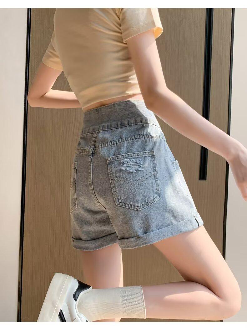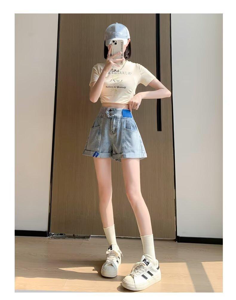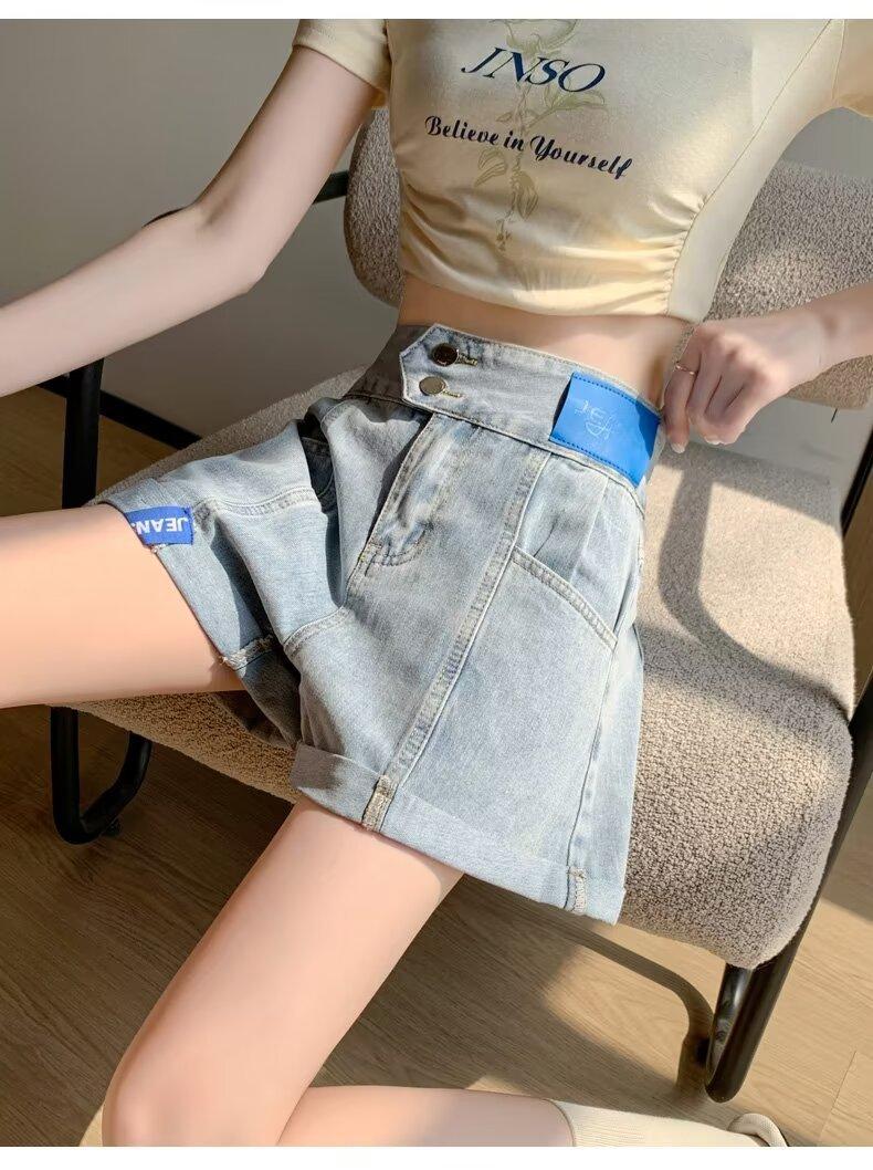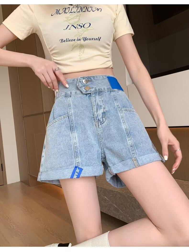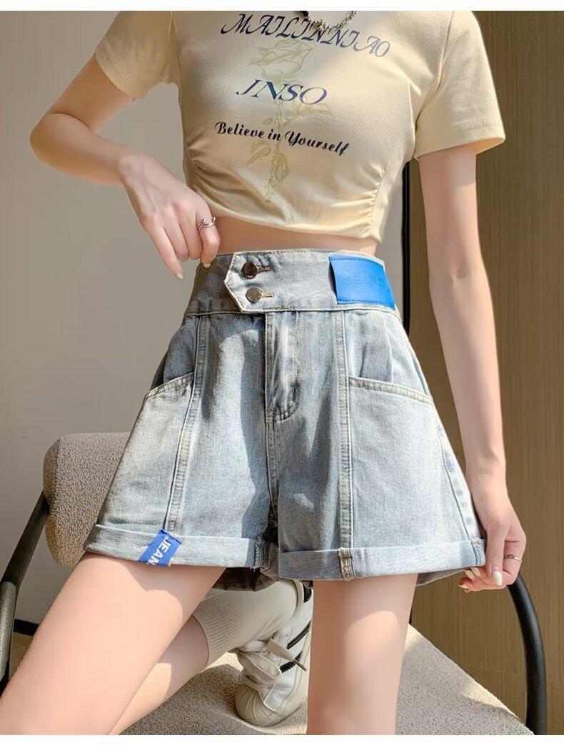 Pantalones cortos de mezclilla de cintura alta para mujer, nuevos pantalones cortos de verano estilo retro americano que buscan una personalidad esbelta, pantalones cortos de pierna ancha con forma de A.