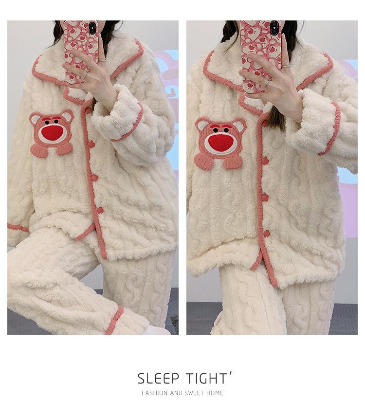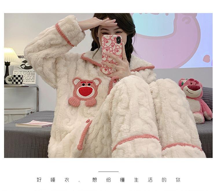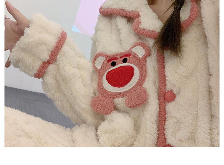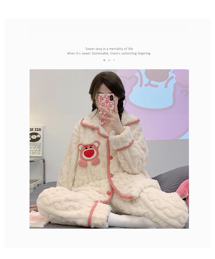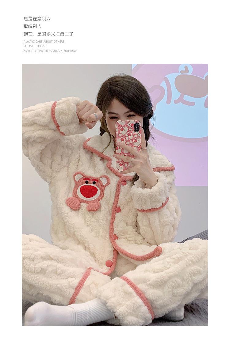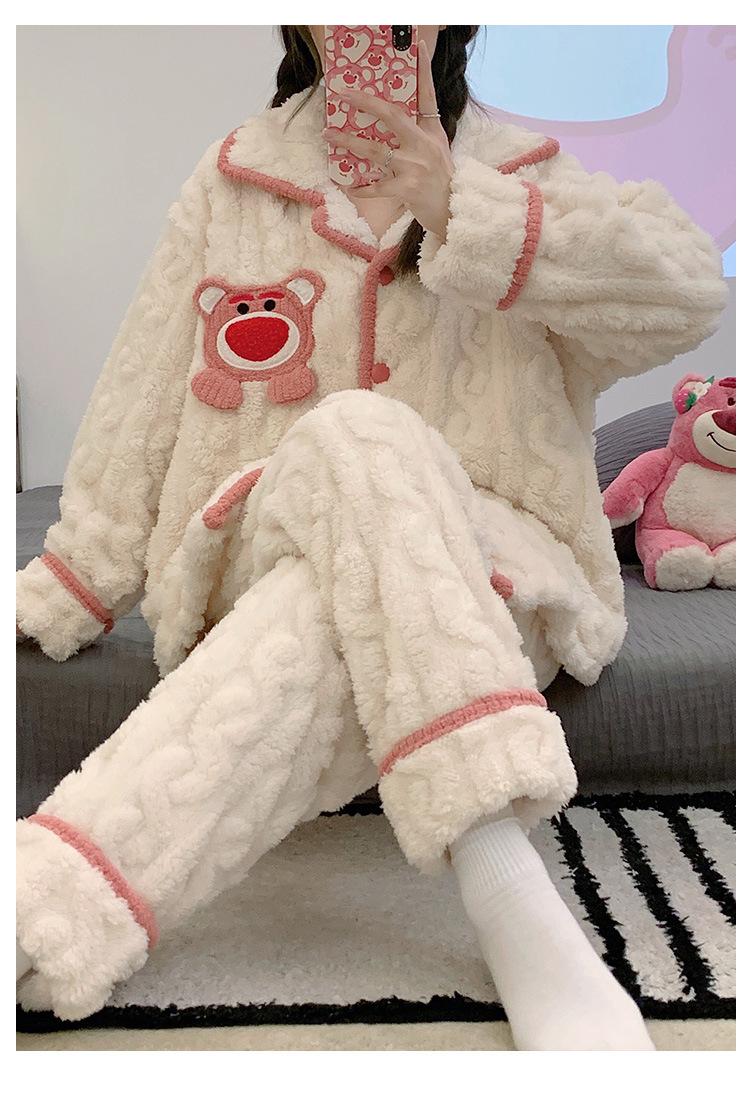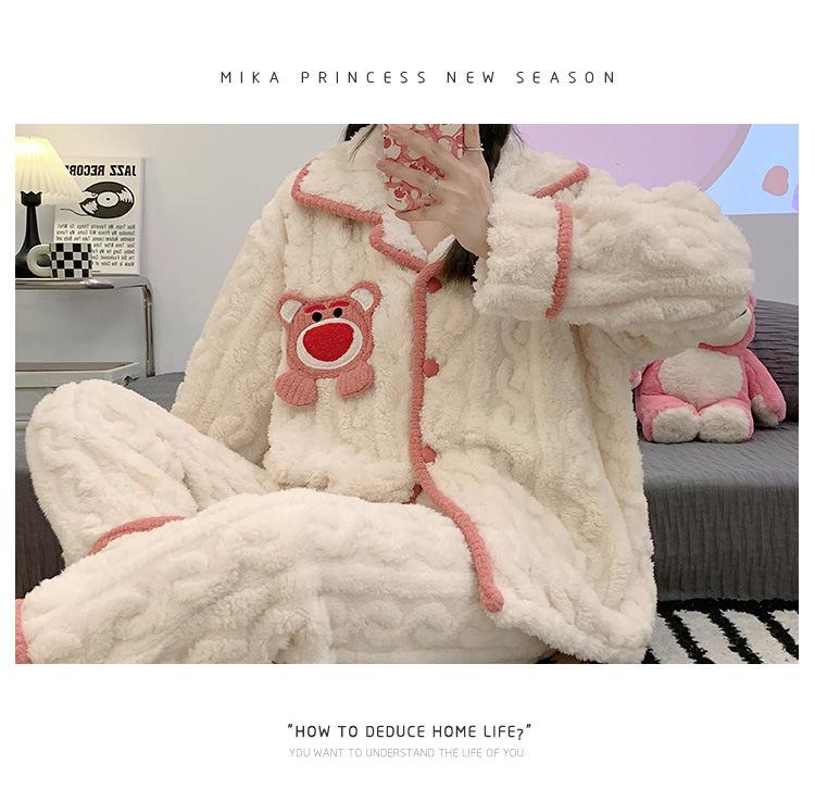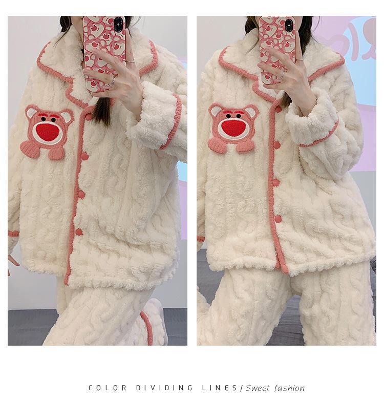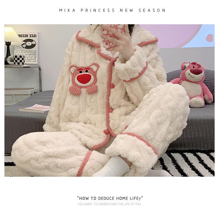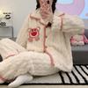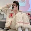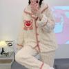 Pijama de lana coral para mujer, cárdigan grueso de invierno, pantalones de manga larga, traje de casa con forro polar de dibujos animados dulces, se puede usar al aire libre