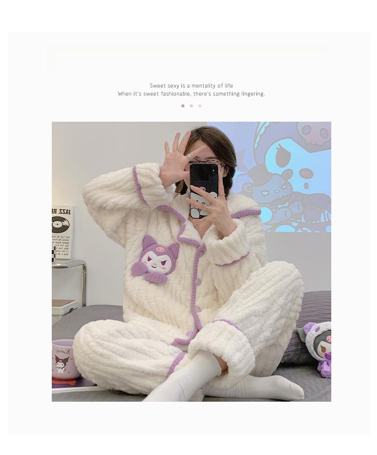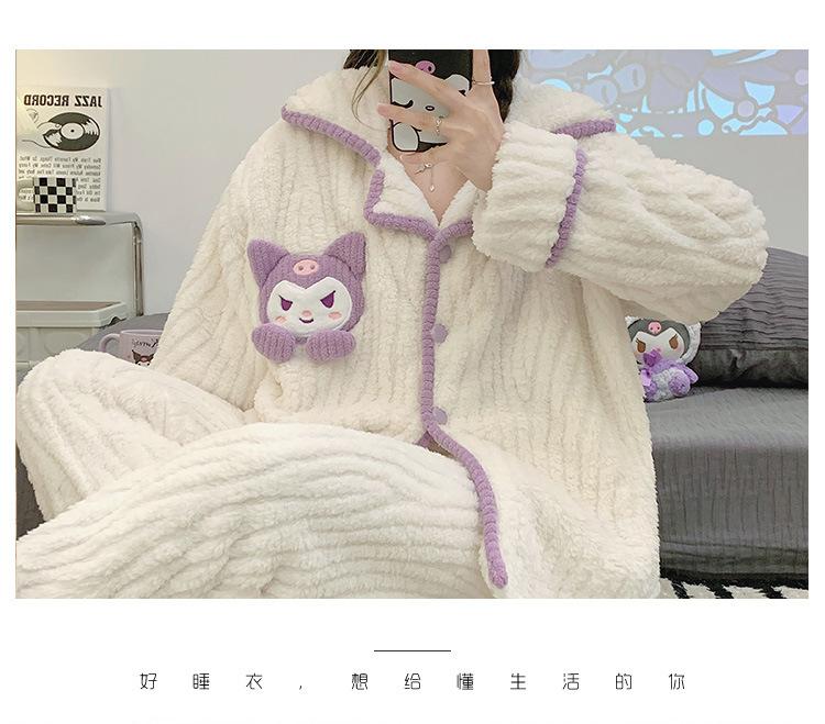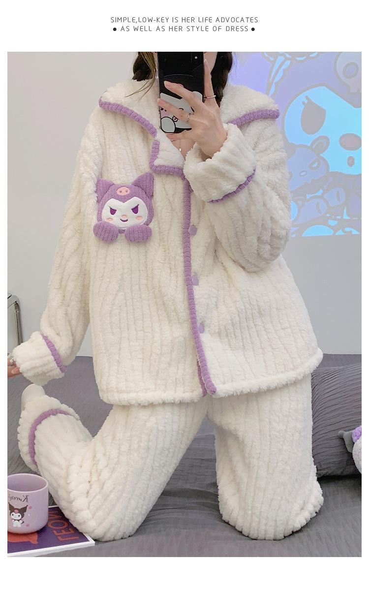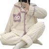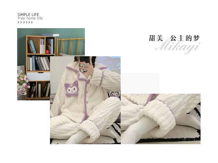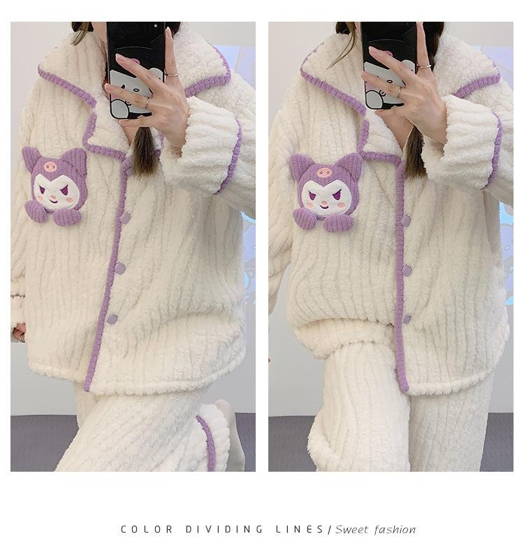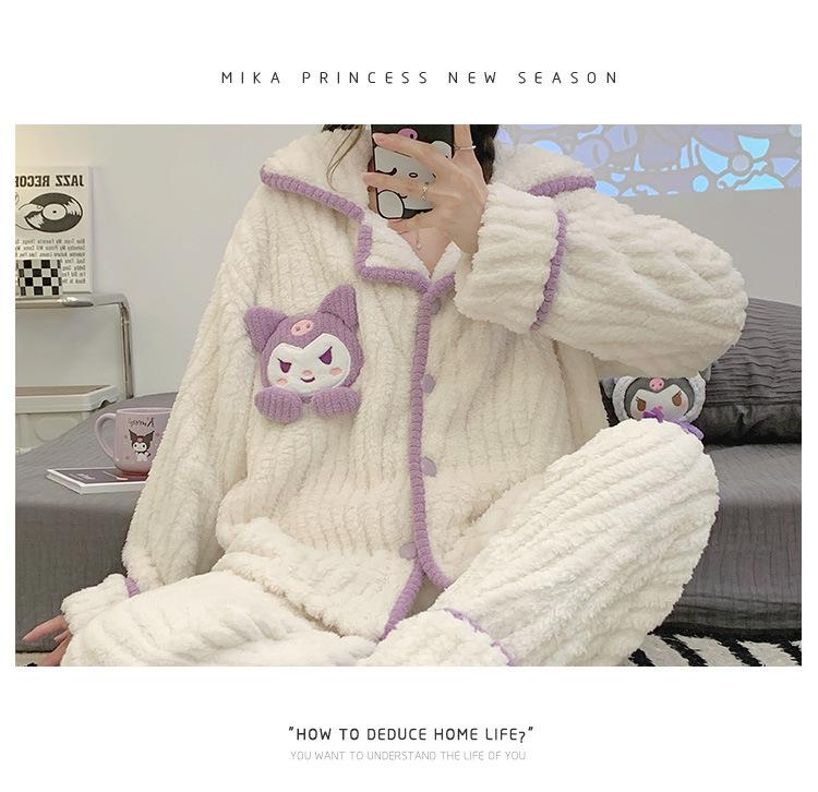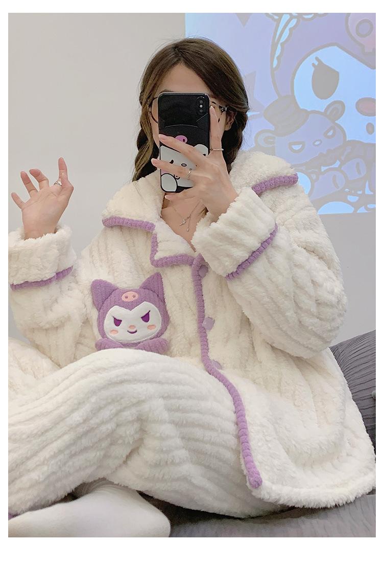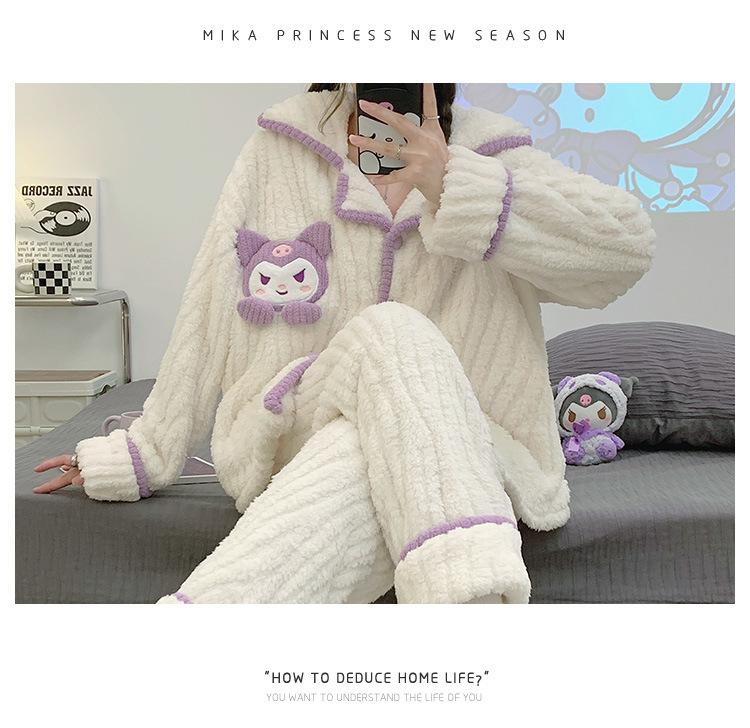 Pijama de lana coral para mujer, cárdigan grueso de invierno, pantalones de manga larga, traje de casa con forro polar de dibujos animados dulces, se puede usar al aire libre