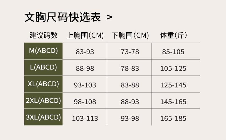 M code 34/75BCD, L code 36/80BCD, XL code 38/85BCD, 2XL Code 40/90BCD, Code 3XL 42/95BCD