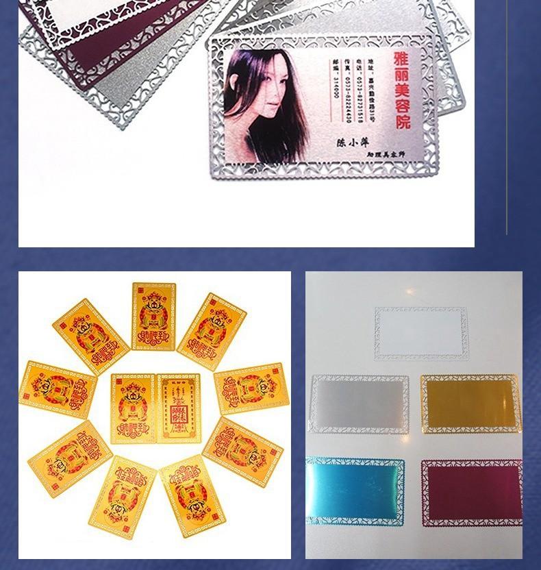 Consumibles metálicos de transferencia térmica (grado especial) referencia detalladaNombre del producto:Personalización de Tarjetas de MetalParámetros del producto:1. Categoría de producto Tarjeta de Aleación Dios de la Riqueza 8. Embalaje del producto 100 piezas/caja de plástico 2. Número de producto YB-J001 9. Grosor de la tarjeta de presentación 0.22-0.45 mm opcional 3. Marca del producto YBER 10. Grado del producto rociado con revestimiento importado 4. Origen del producto Zhejiang/Yiwu 11. Personas aplicables Adulto 5. Tamaño del producto se puede personalizar 12. Forma del producto rectangular 6. Tipo de material aleación de aluminio 13. Función del producto resistencia a altas temperaturas/protección ambiental/patrón imprimible/ 7. Tecnología de superficie impresión por transferencia térmica 14. Impresión de LOGO esÁmbito de aplicación:Adecuado para regalos de empresa, suministros promocionales, suministros para conferencias, souvenirs, suministros para graduación, propiedades residenciales, televisores, equipos electrónicos montados en vehículos, escuelas, hospitales, lugares públicos, propiedades residenciales y otras industriasDescripción del Producto:Esta tarjeta de presentación es una nueva tarjeta de presentación de metal impresa por transferencia de calor desarrollada por nuestros desarrolladores. ¡La selección de materiales, el proceso, el revestimiento, etc. adoptan el proceso de producción más avanzado del mundo! Las tarjetas de presentación personalizadas pueden transferir cualquier imagen y texto en la computadora a láminas de metal especiales. Las placas de metal son procesadas con la tecnología de revestimiento especial de nuestra fábrica, y luego se utilizan con tintas especiales de transferencia de calor. Se pueden transferir como fotos impresas digitalmente, brillantes y reales. No solo es un recuerdo y una obra de arte, sino también muy práctico. Es un buen regalo. Tarjetas de presentación de metal: material de cobre puro, tan delgadas como el papel, tan resistentes como el acero y muy flexibles. Hay muchos colores como oro, plata, blanco perla, etc. También hay tipo encaje hueco, éxito de taquilla lujoso, tipo dama exquisita. ¡Cada estilo es novedoso, personalizado, magnífico!Embalaje del producto:1. Cantidad/peso neto 100 piezas/caja/0.5 kg 2. Tamaño de la caja exterior 15×9×10cm 1. Cantidad/peso neto 20 cajas/caja/10 kg 2. Tamaño de la caja exterior 41×28×38cm El embalaje anterior adopta: caja de plástico transparente PP + separador de papel corrugado + caja de embalaje de papel corrugado de cinco capas para garantizar la seguridad del producto;Ciclo de prueba:Normalmente, el proceso de fabricación tarda de 1 a 2 días. Si está en stock, la muestra se fabrica en solo 1 día aproximadamente. Si no está en stock, la fabricación tardará más. Puede consultarnos para obtener más detalles en ese momento.Ciclo de entrega:Generalmente, el plazo de entrega es de 2 a 3 días. El plazo de entrega depende de factores como el programa de producción, la cantidad del pedido y si es un pedido rutinario. Por favor, confirme con nuestro equipo de ventas antes de realizar un pedido para evitar retrasos en la entrega.Precauciones:A excepción del método de entrega especificado por el cliente, todos nuestros productos se envían a través de logística de carga y se recogen a su llegada. Los productos metálicos son artículos frágiles y las cajas exteriores están etiquetadas con las etiquetas especiales de fragilidad de nuestra empresa. Sin embargo, debido a una colocación inadecuada o a una fuerza externa durante la logística, nuestra empresa no se hace responsable de ningún daño al producto causado por extrusión. Si tiene algún requisito, póngase en contacto con el personal de ventas para flejar la caja de madera para garantizar que el producto no se dañe y llegue de forma segura.