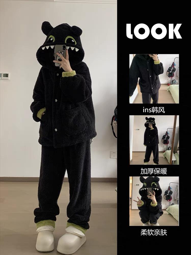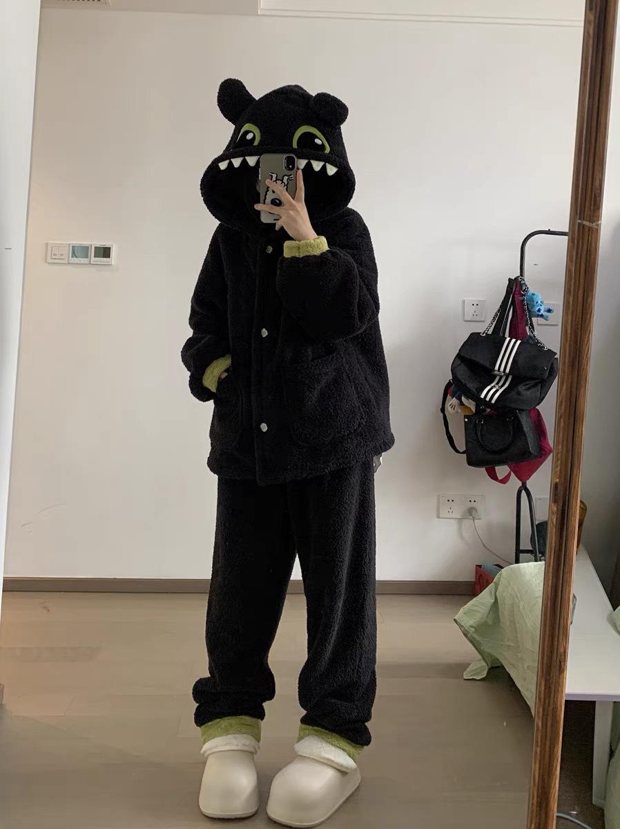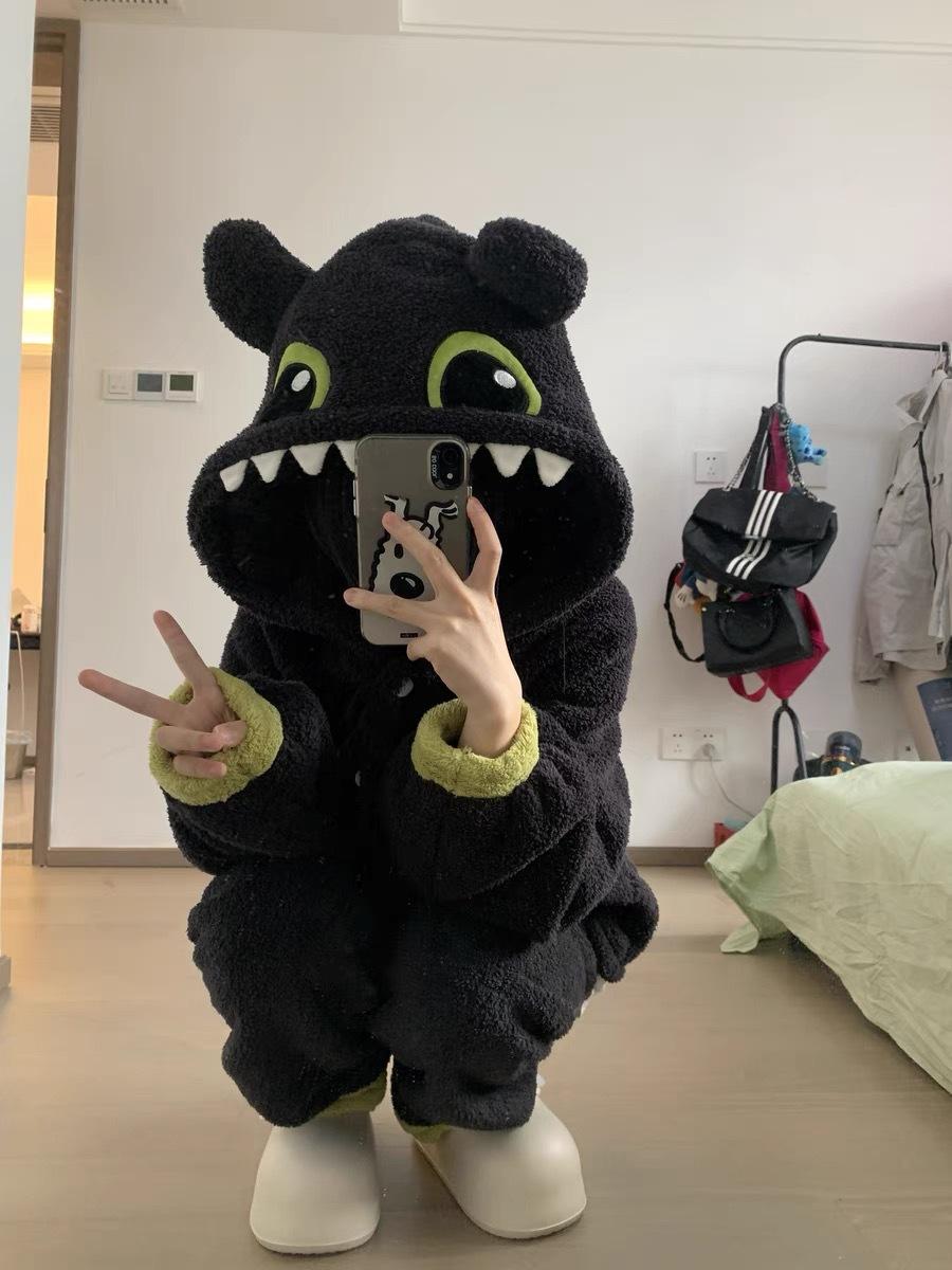 Pijama de Forro Polar Coral con Capucha de Monstruito Lindo para Mujer Invierno con Forro Polar Franela Gruesa Ropa para el Hogar Traje de Talla Grande Invierno