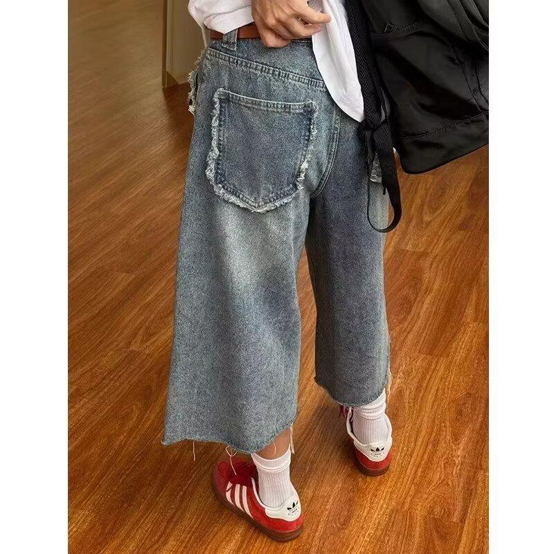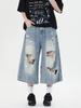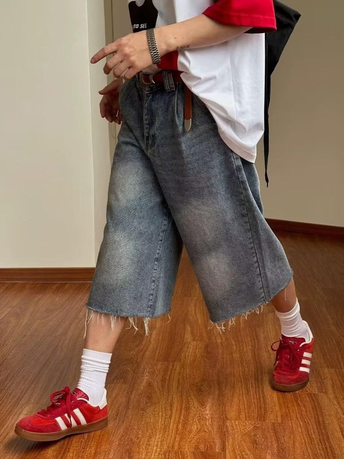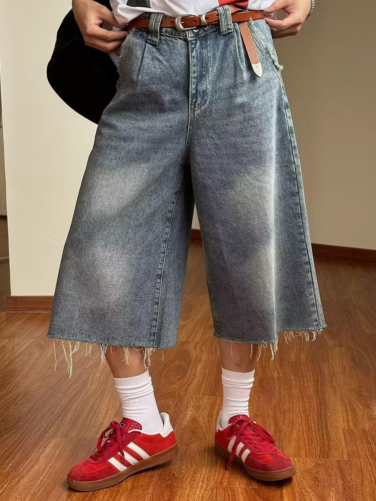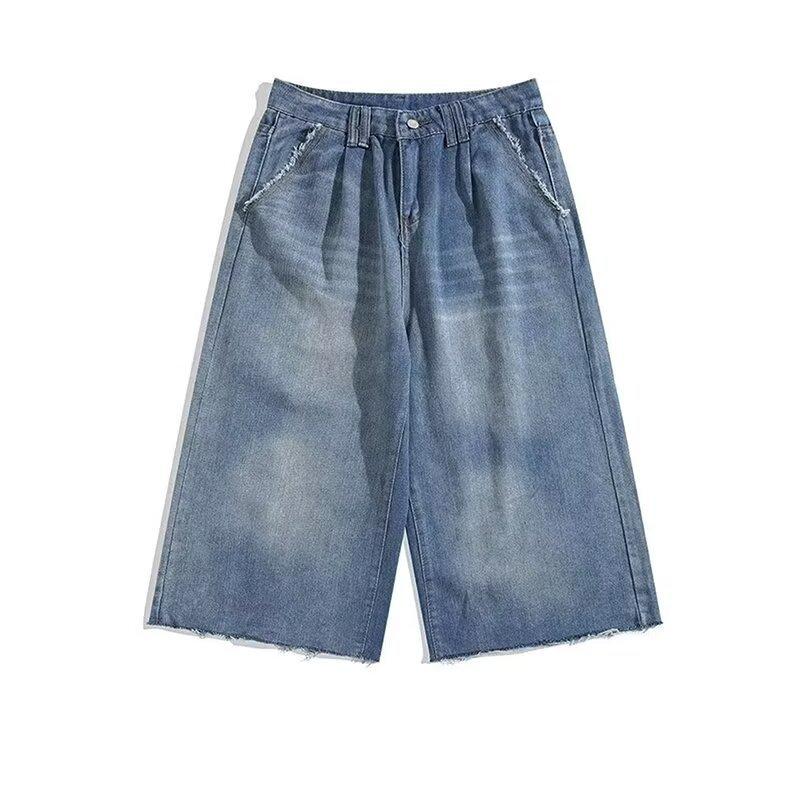 Pantalones cortos de mezclilla para hombre y mujer de verano populares sueltos retro de pierna ancha con diseño de borde áspero desgastado estilo americano