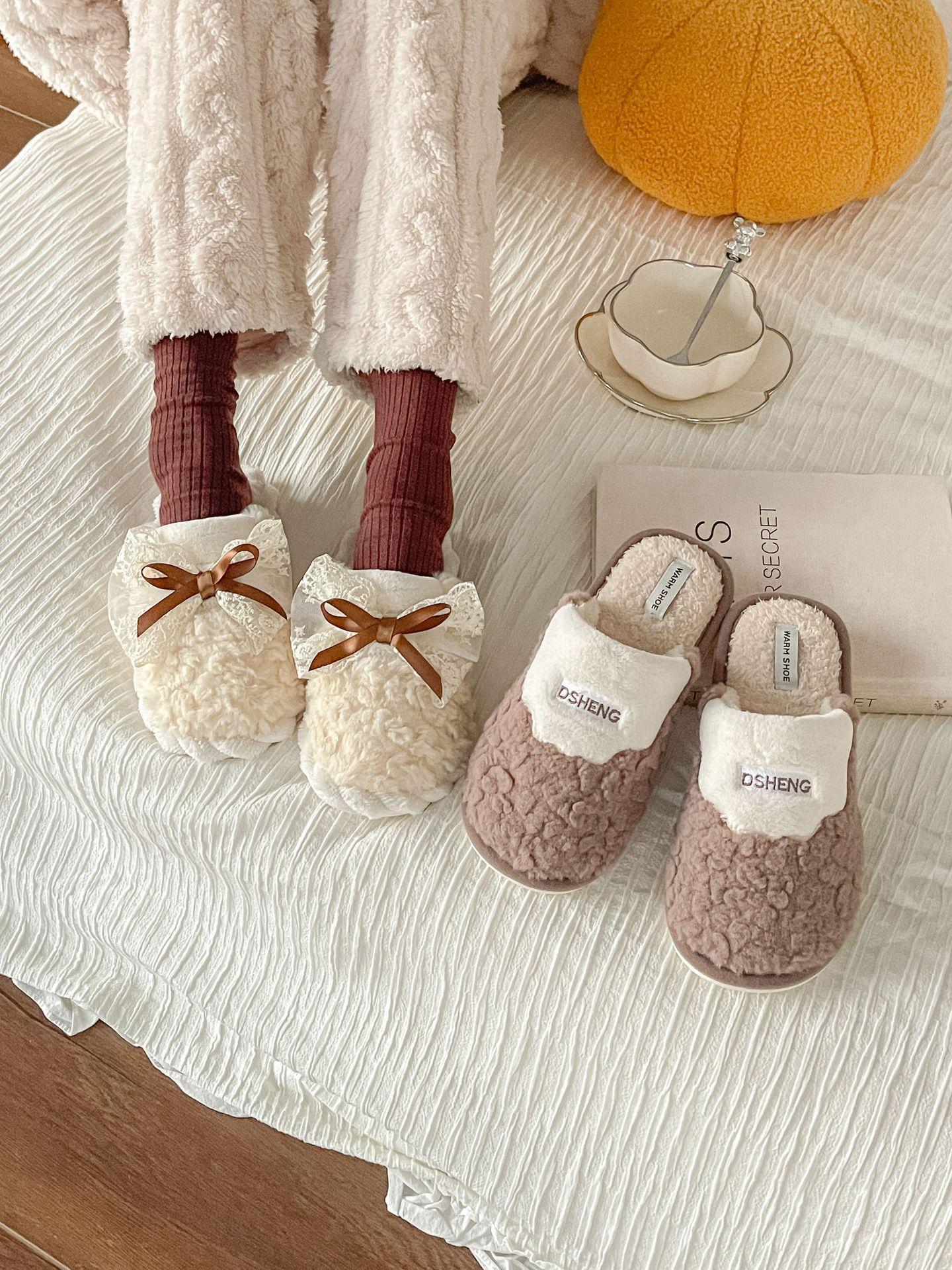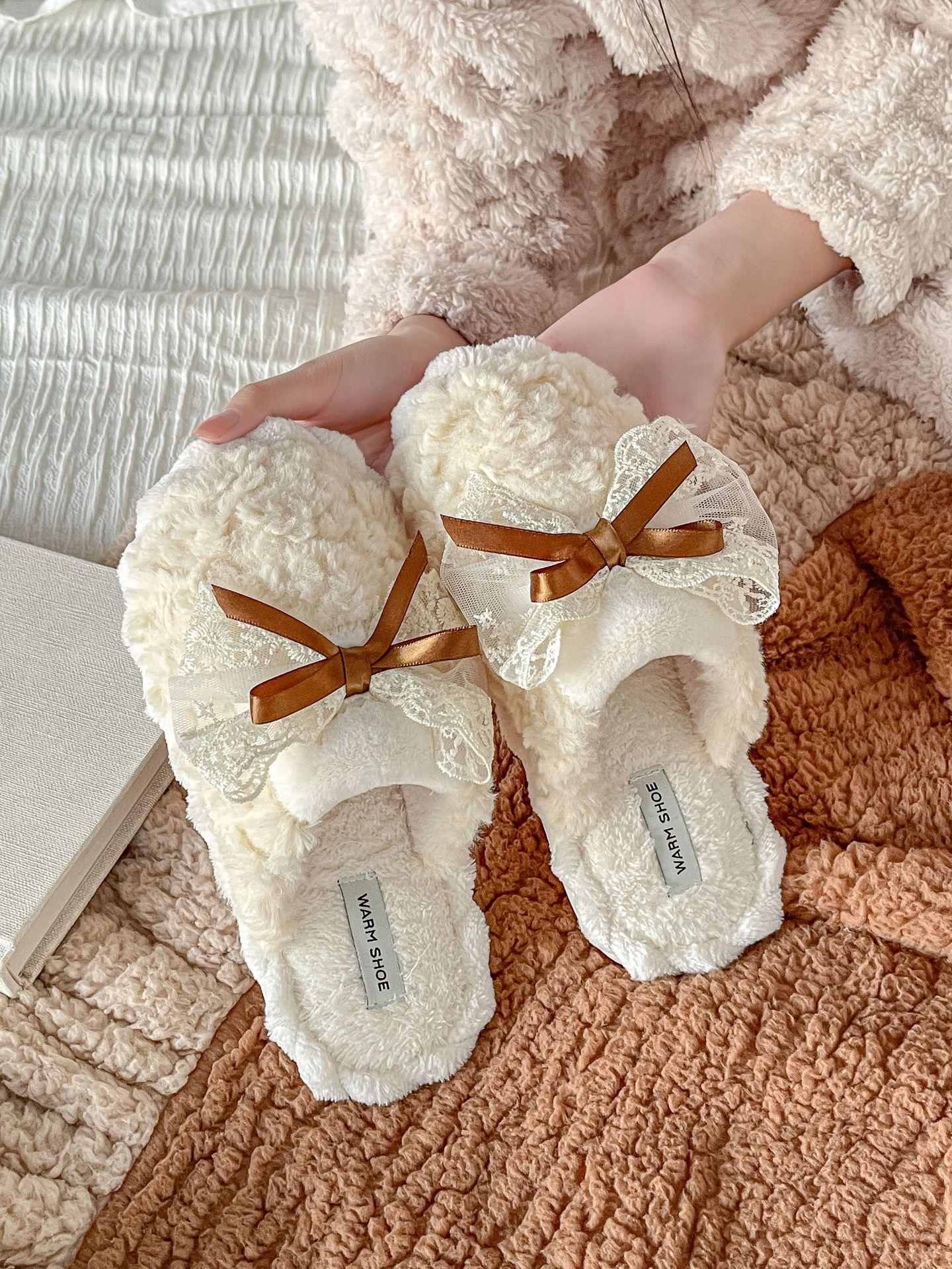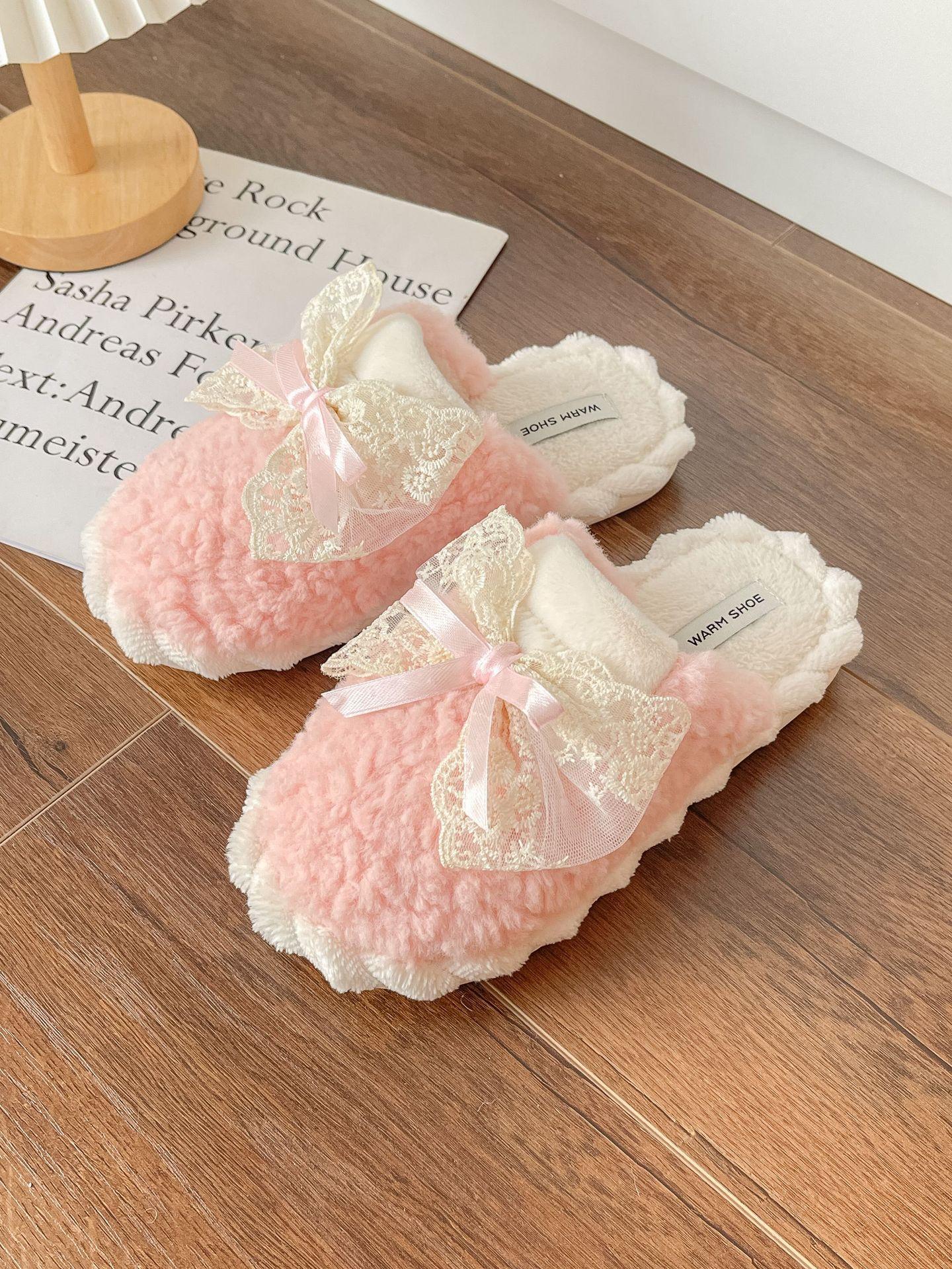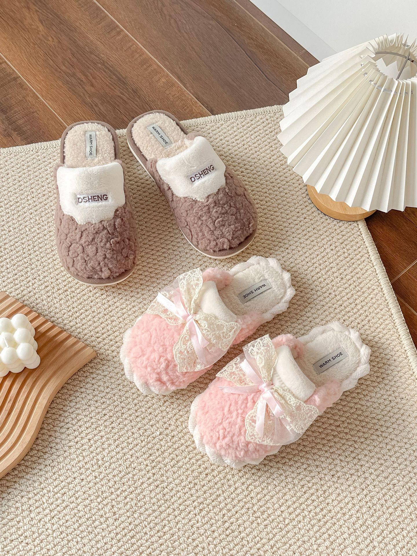 Pantuflas de algodón de invierno con lazo estilo coreano de hadas, lindas y peludas para el hogar, antideslizantes, cálidas y acogedoras para parejas.