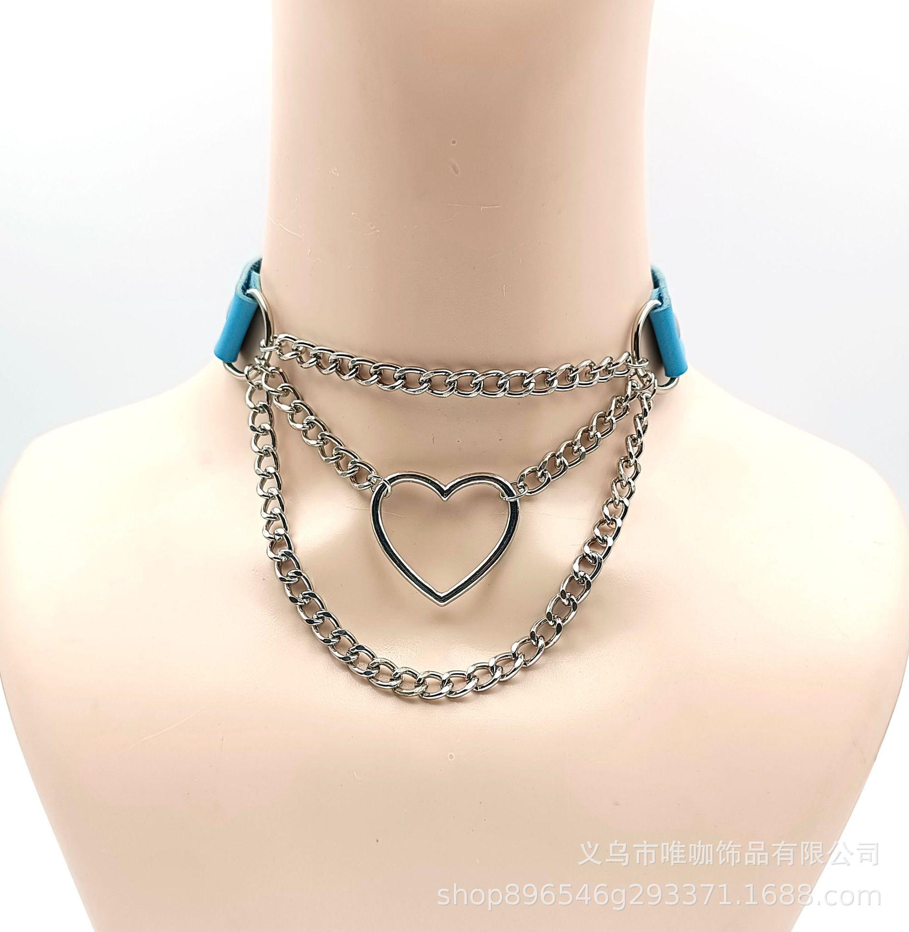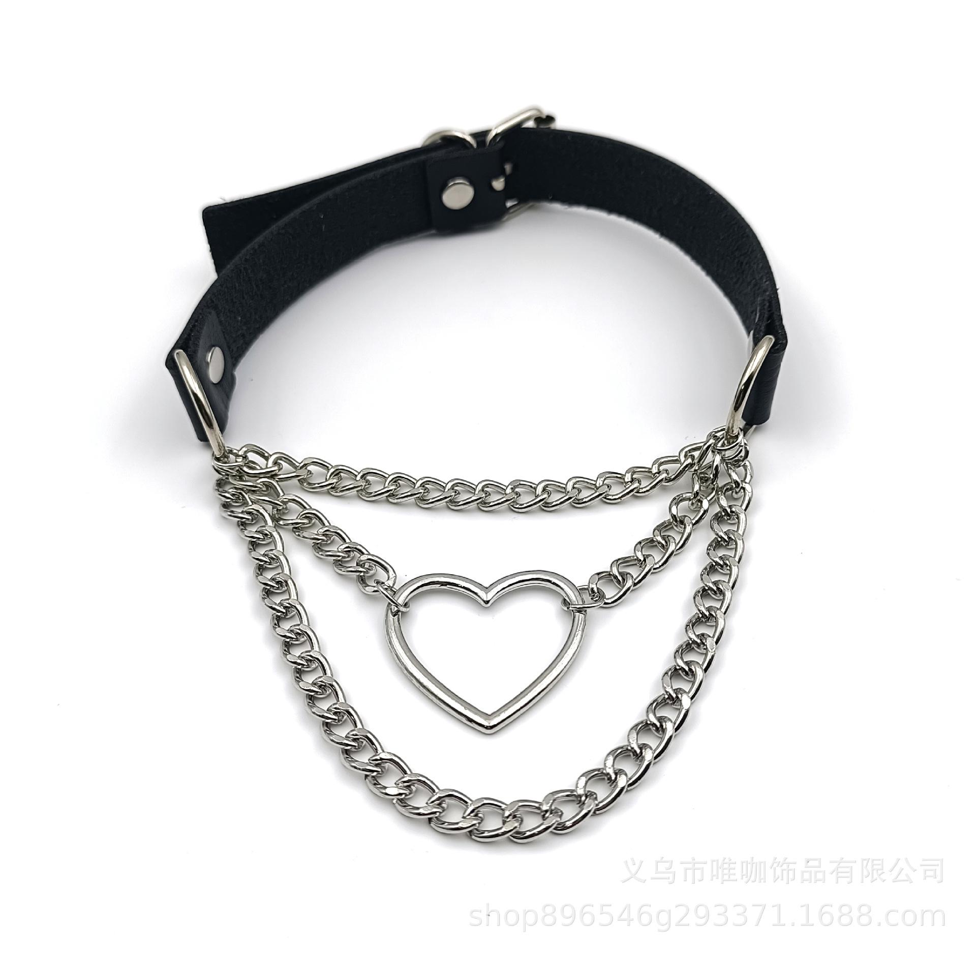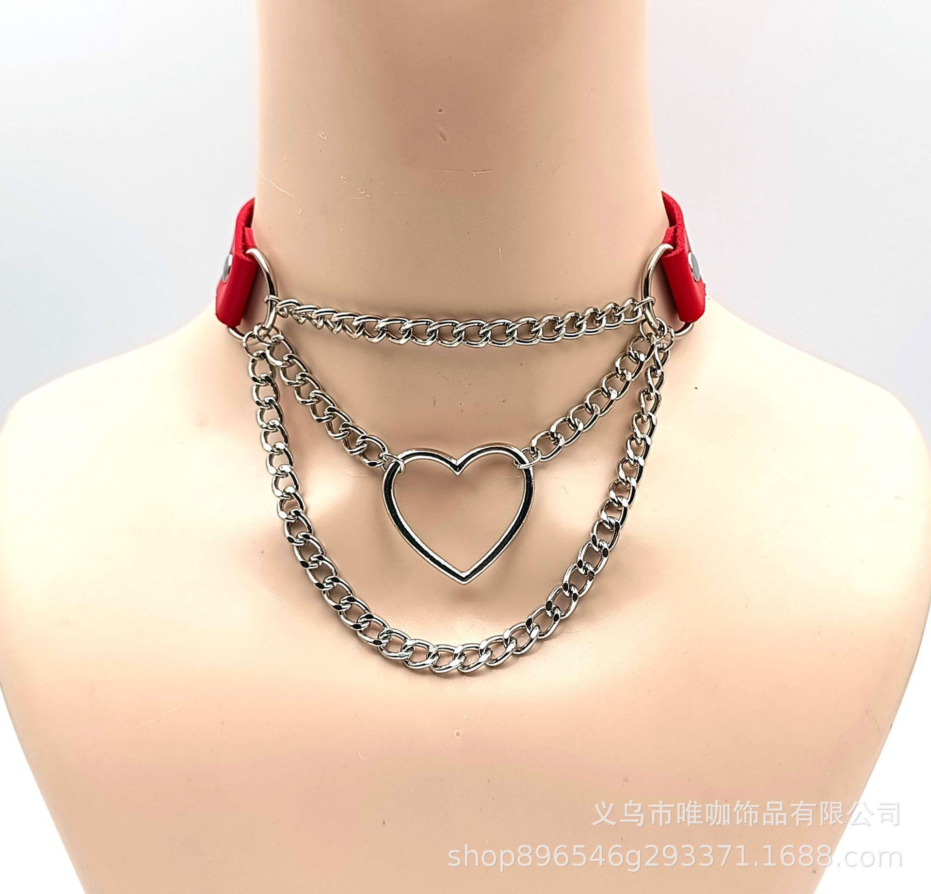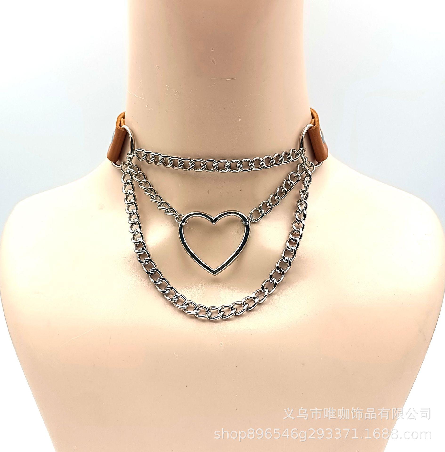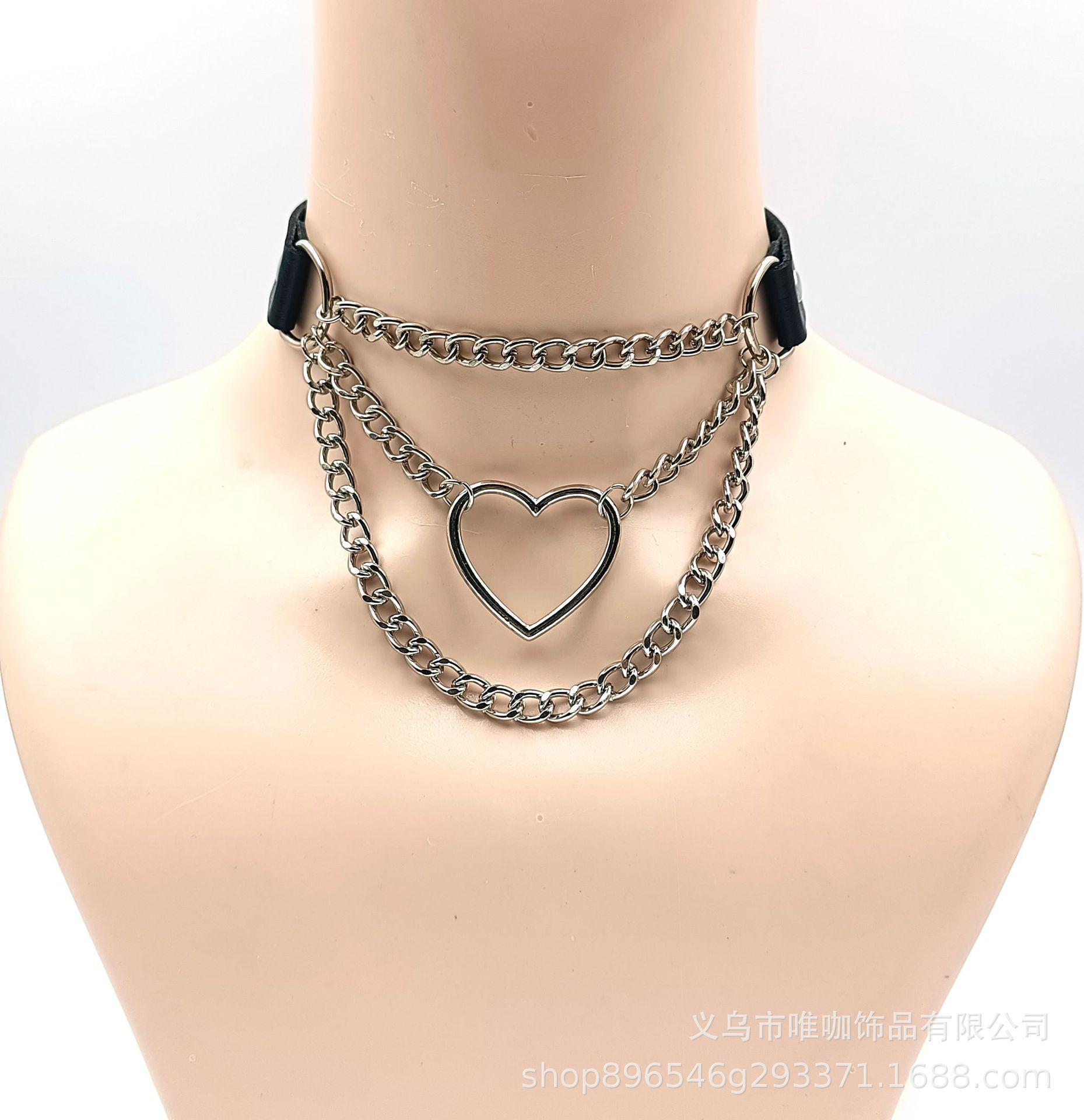 Cadena Multicapa en Forma de Corazón Europea y Americana Transfronteriza Gargantilla de Cuero con Cadena Múltiple de Corazón de Personalidad de Moda Dulce Cool Punk Collar Gargantilla