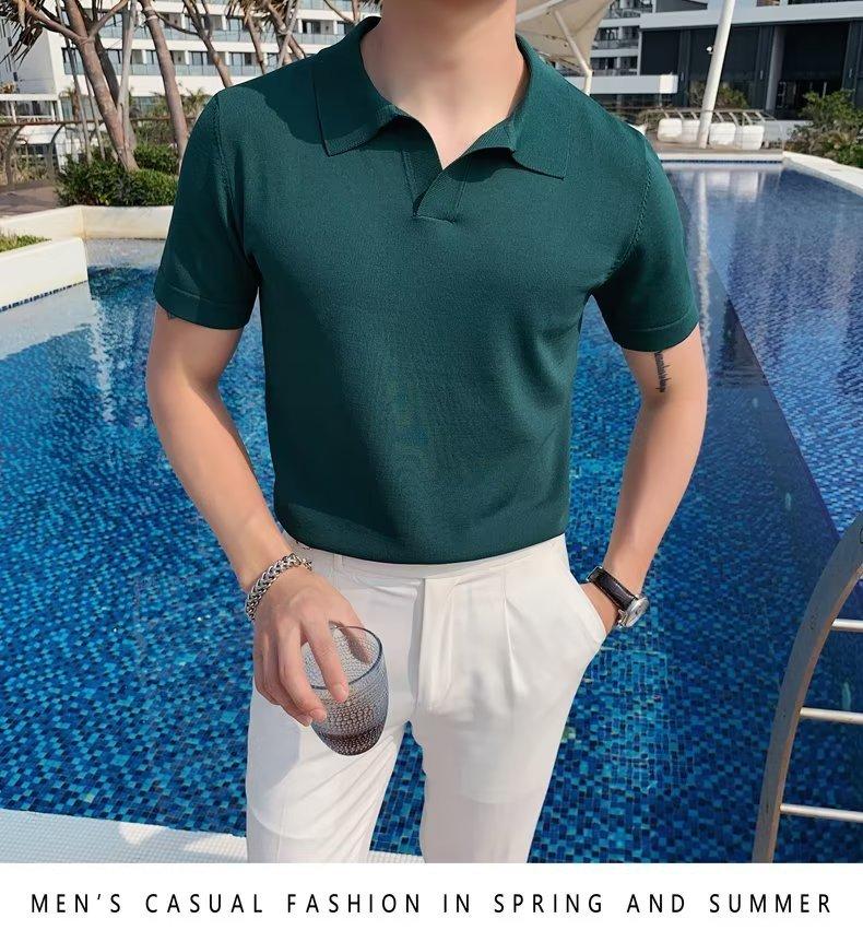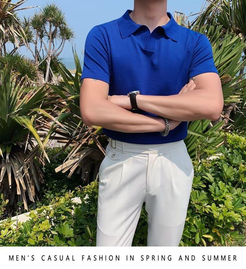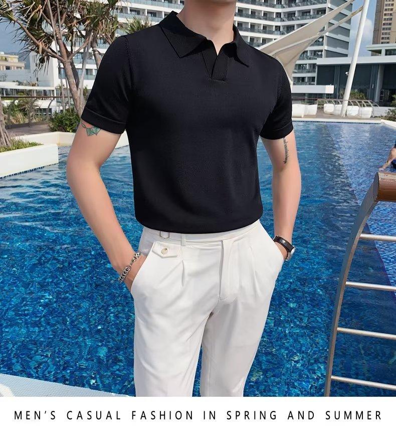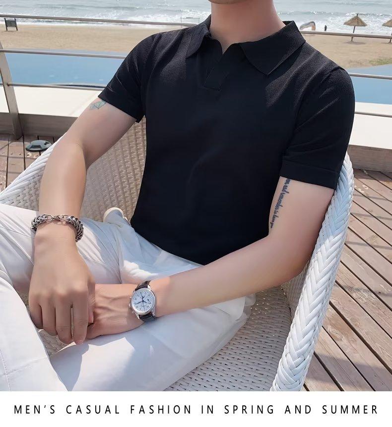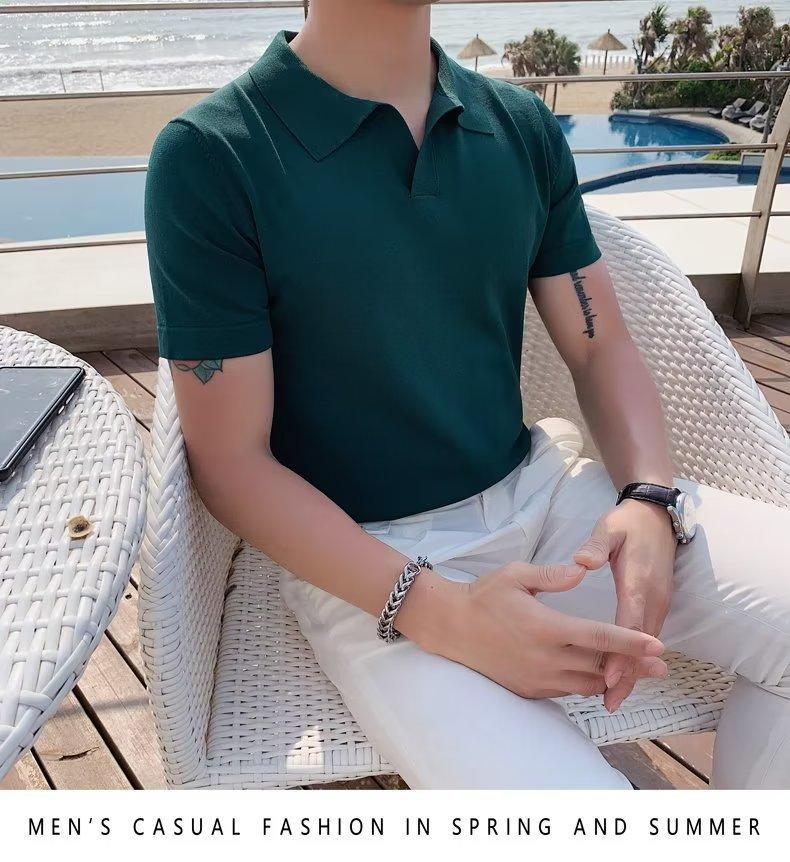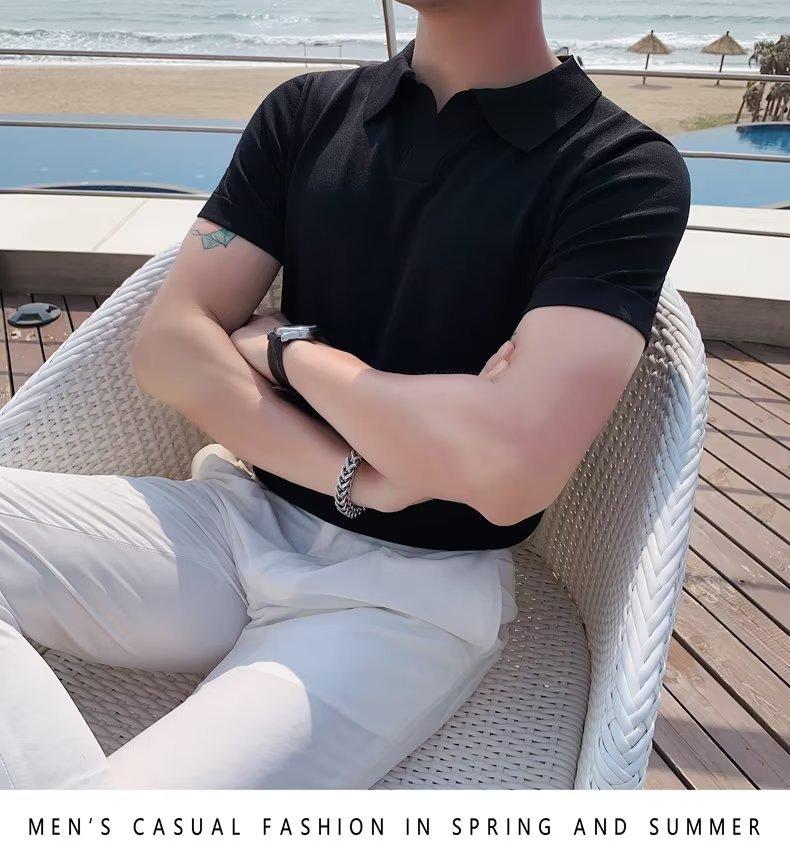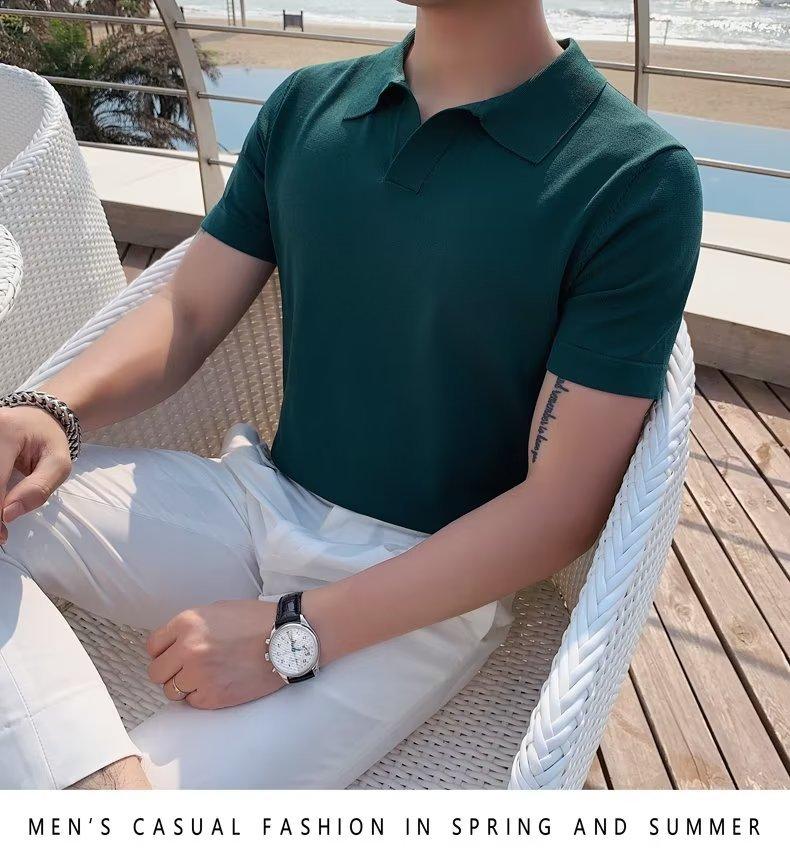 Polo de manga corta de punto con solapa de color liso para hombre, camiseta informal de seda helada de media manga, corte entallado, de moda de verano 2023