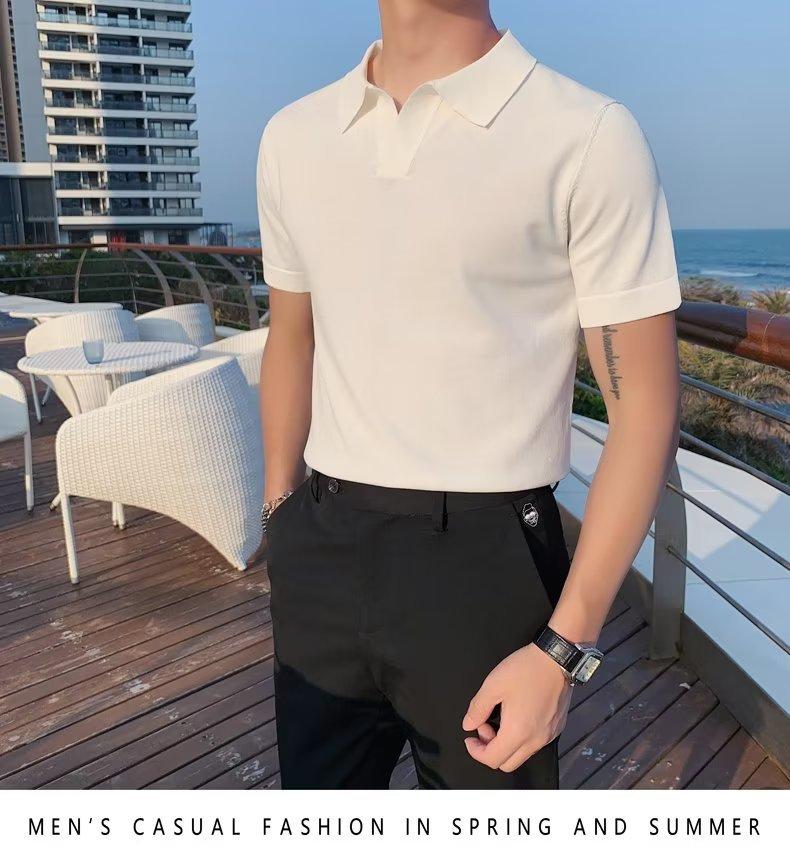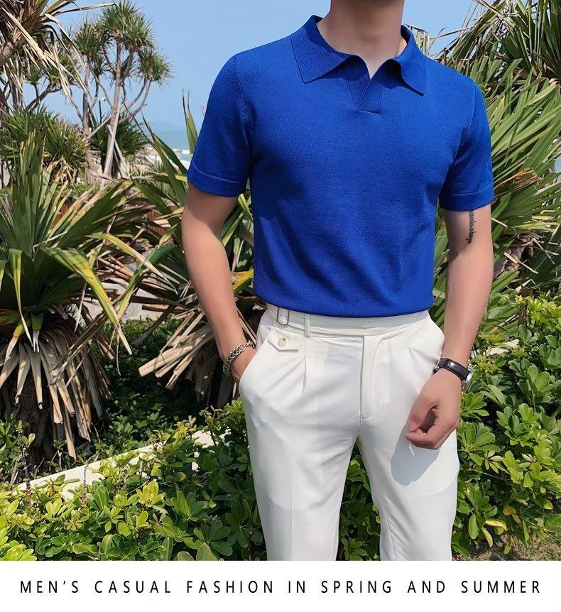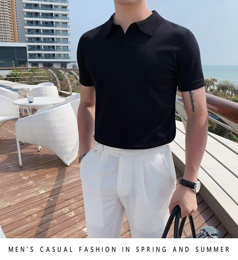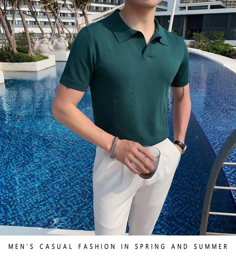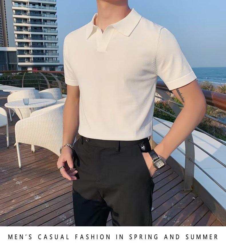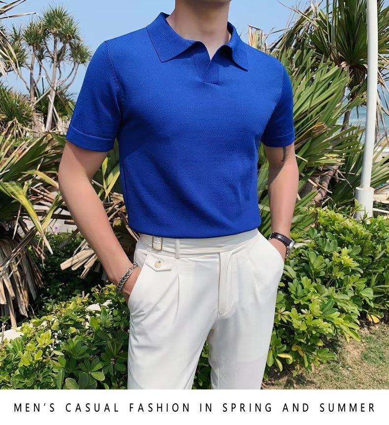 Polo de manga corta de punto con solapa de color liso para hombre, camiseta informal de seda helada de media manga, corte entallado, de moda de verano 2023