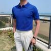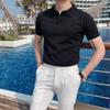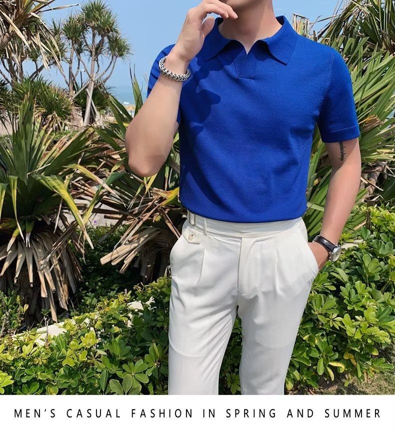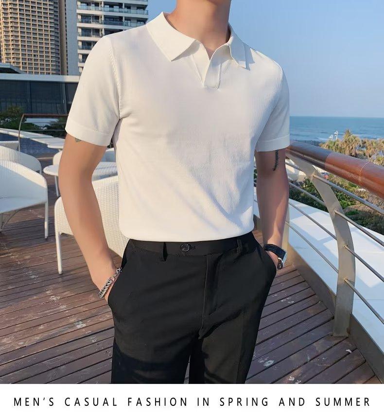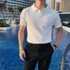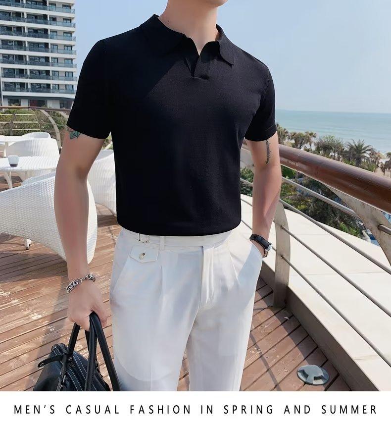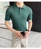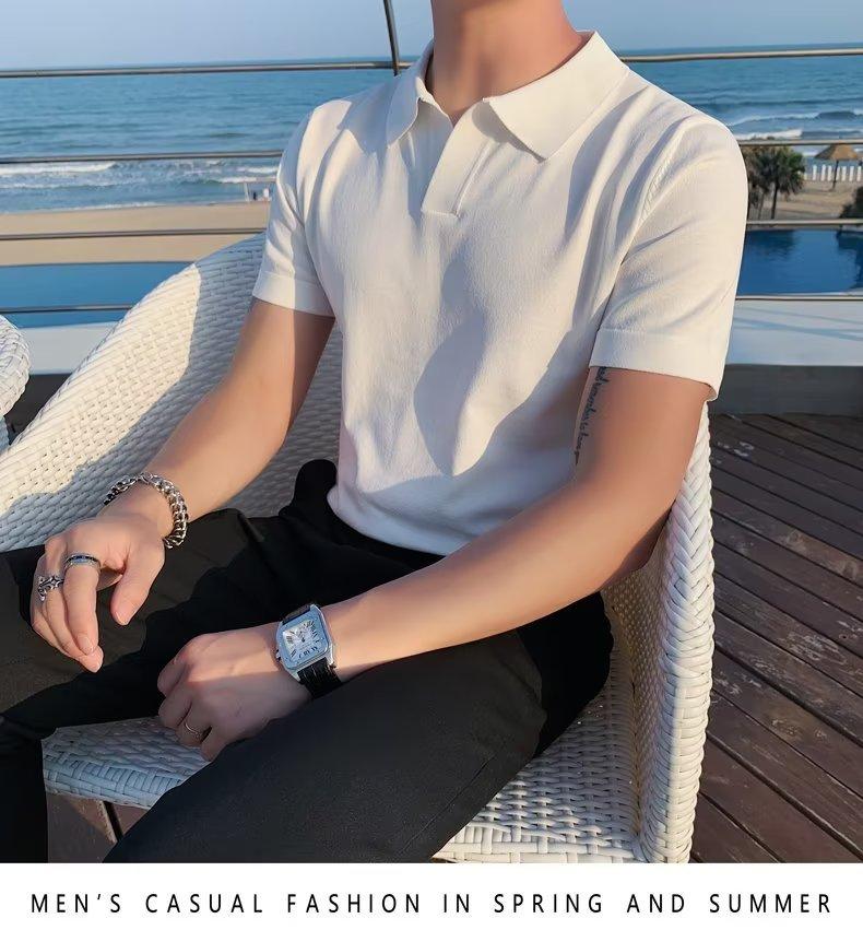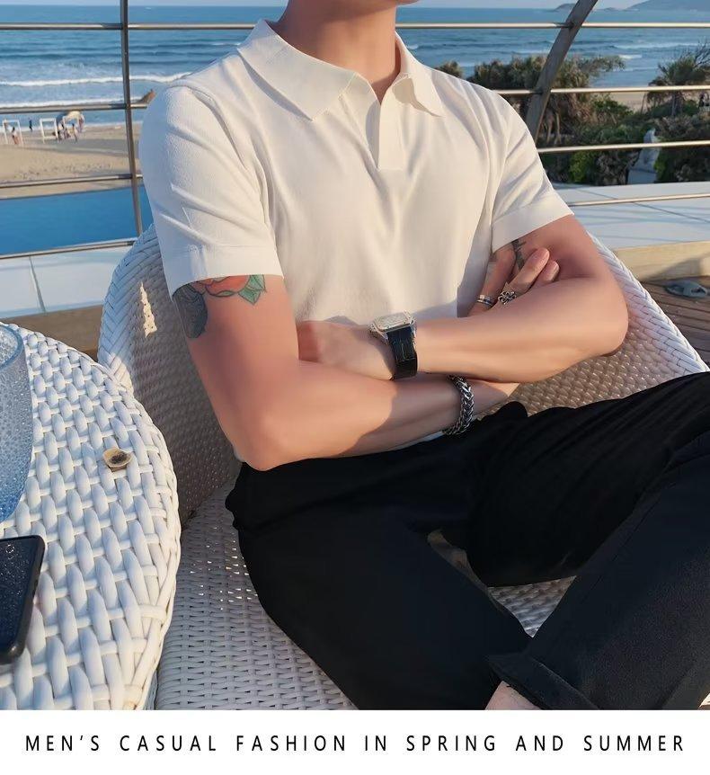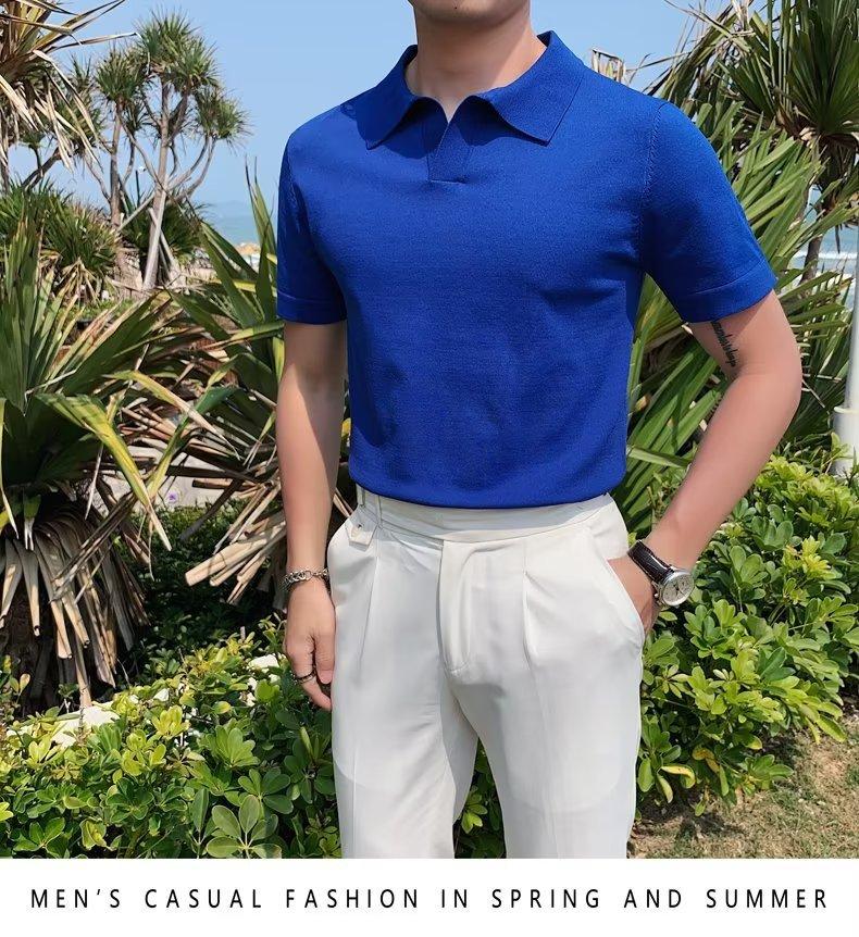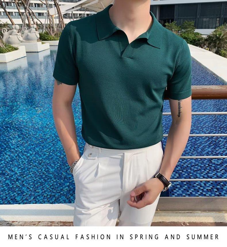 Polo de manga corta de punto con solapa de color liso para hombre, camiseta informal de seda helada de media manga, corte entallado, de moda de verano 2023
