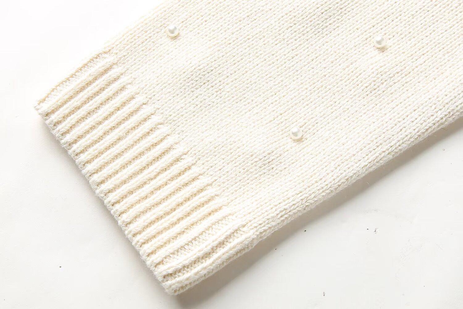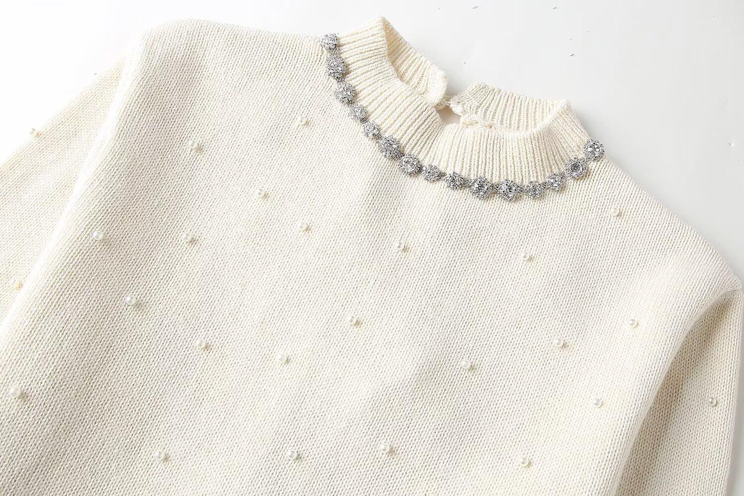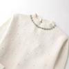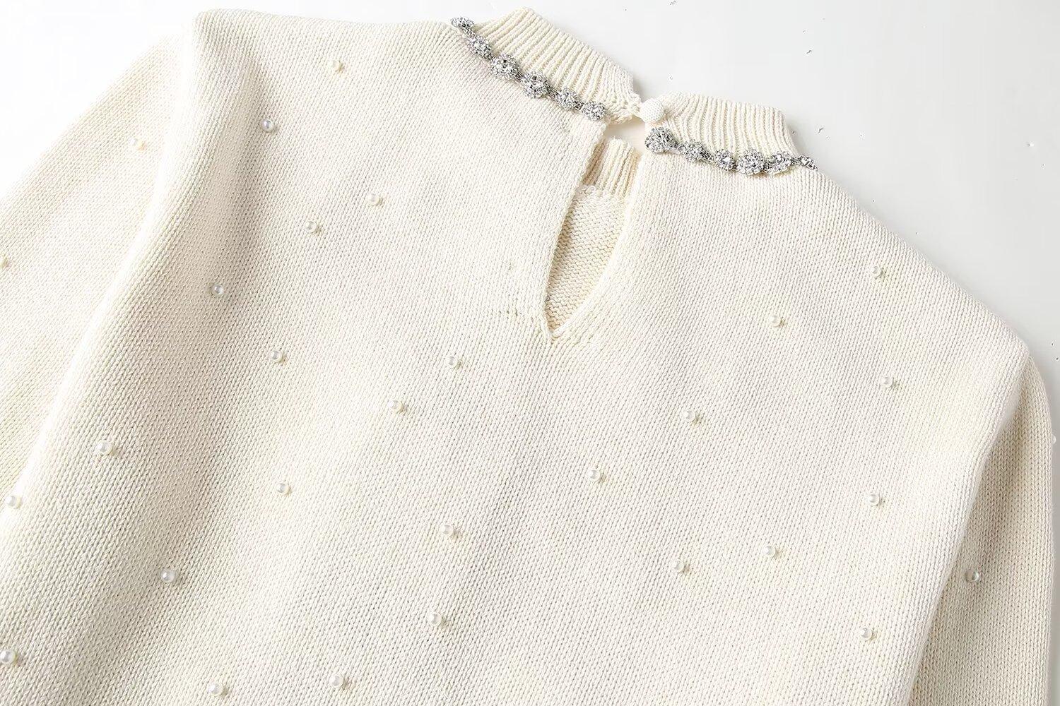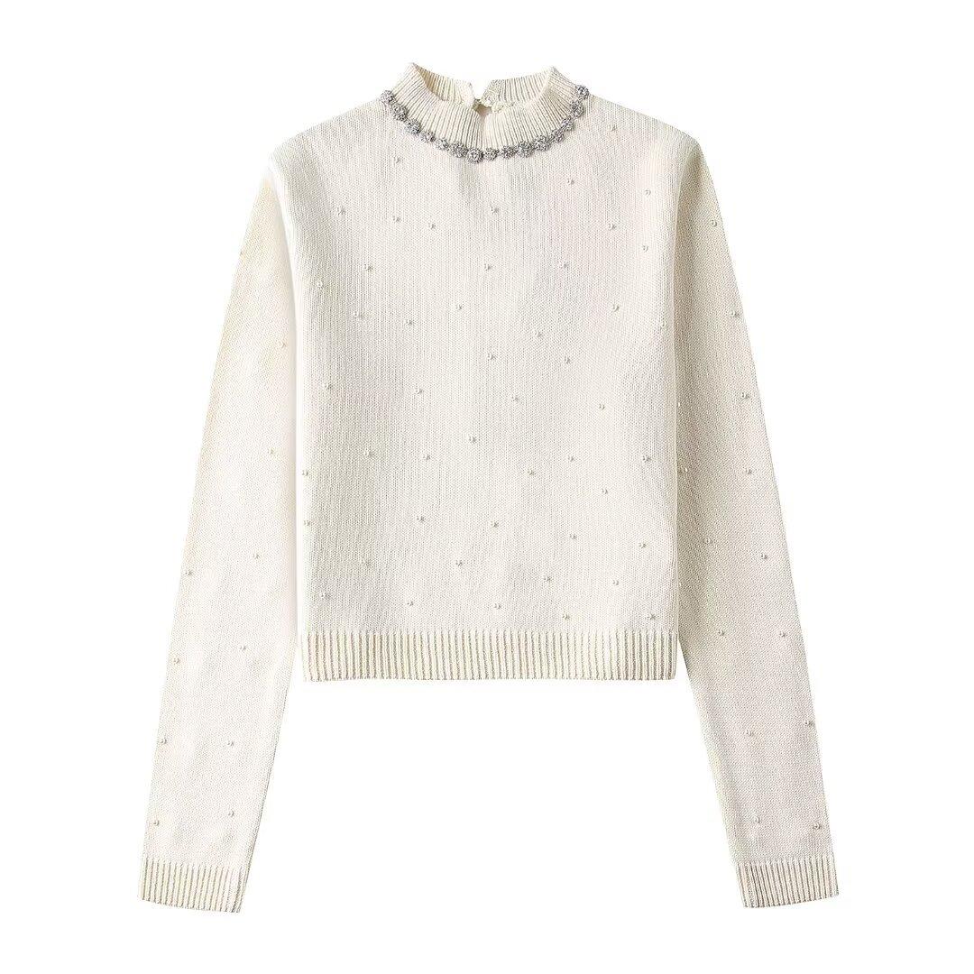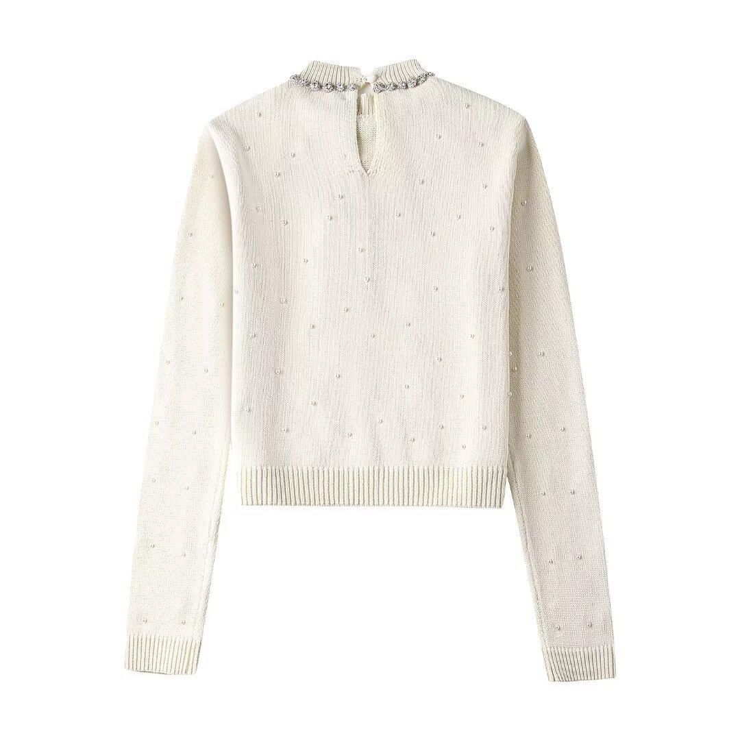 Primavera 2024 Nueva Llegada Moda Femenina Transfronteriza Europea y Americana Jersey Jersey de Cuello Redondo Adorno de Perla Artificial Jersey