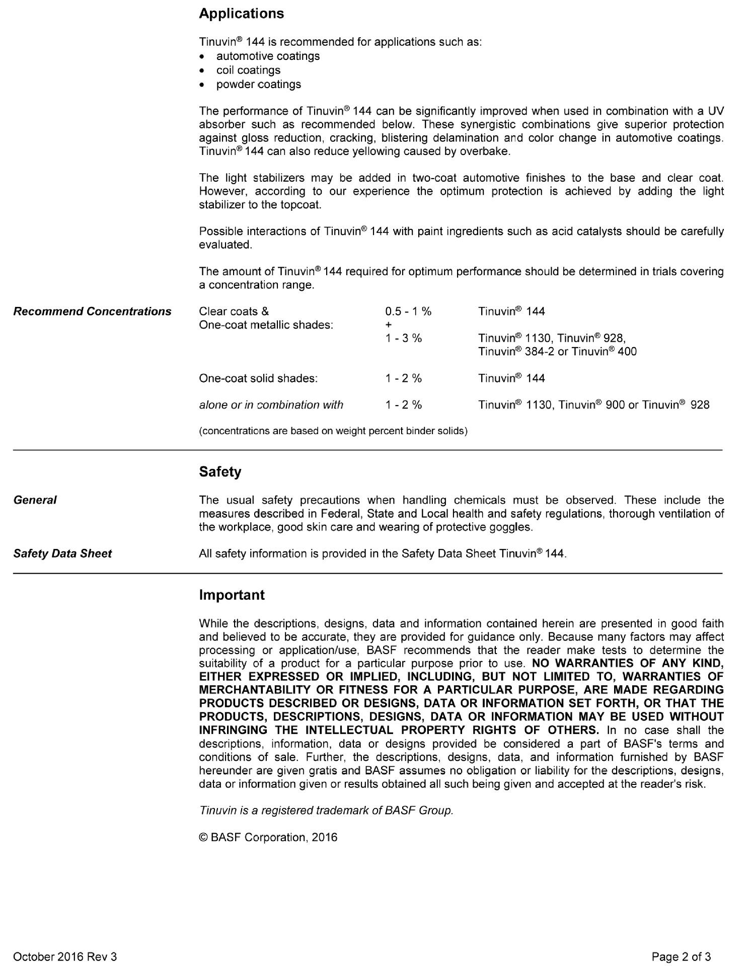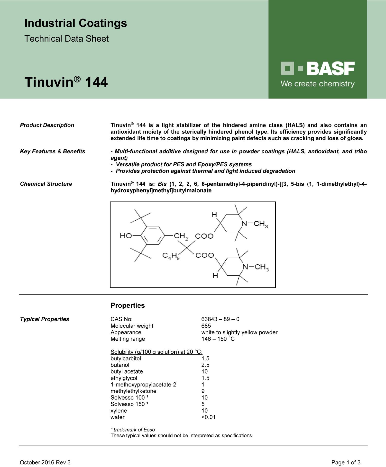 Tinuvin 144 se puede utilizar en recubrimientos automotrices, recubrimientos en bobina, recubrimientos en polvo y resinas epoxi para prevenir la pérdida de brillo, el agrietamiento, las ampollas, la delaminación y el cambio de color en los recubrimientos. También puede reducir el amarilleamiento causado por el sobrehorneado.