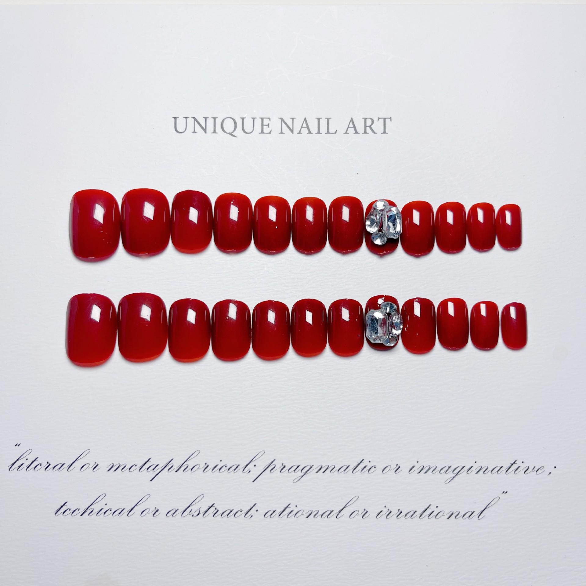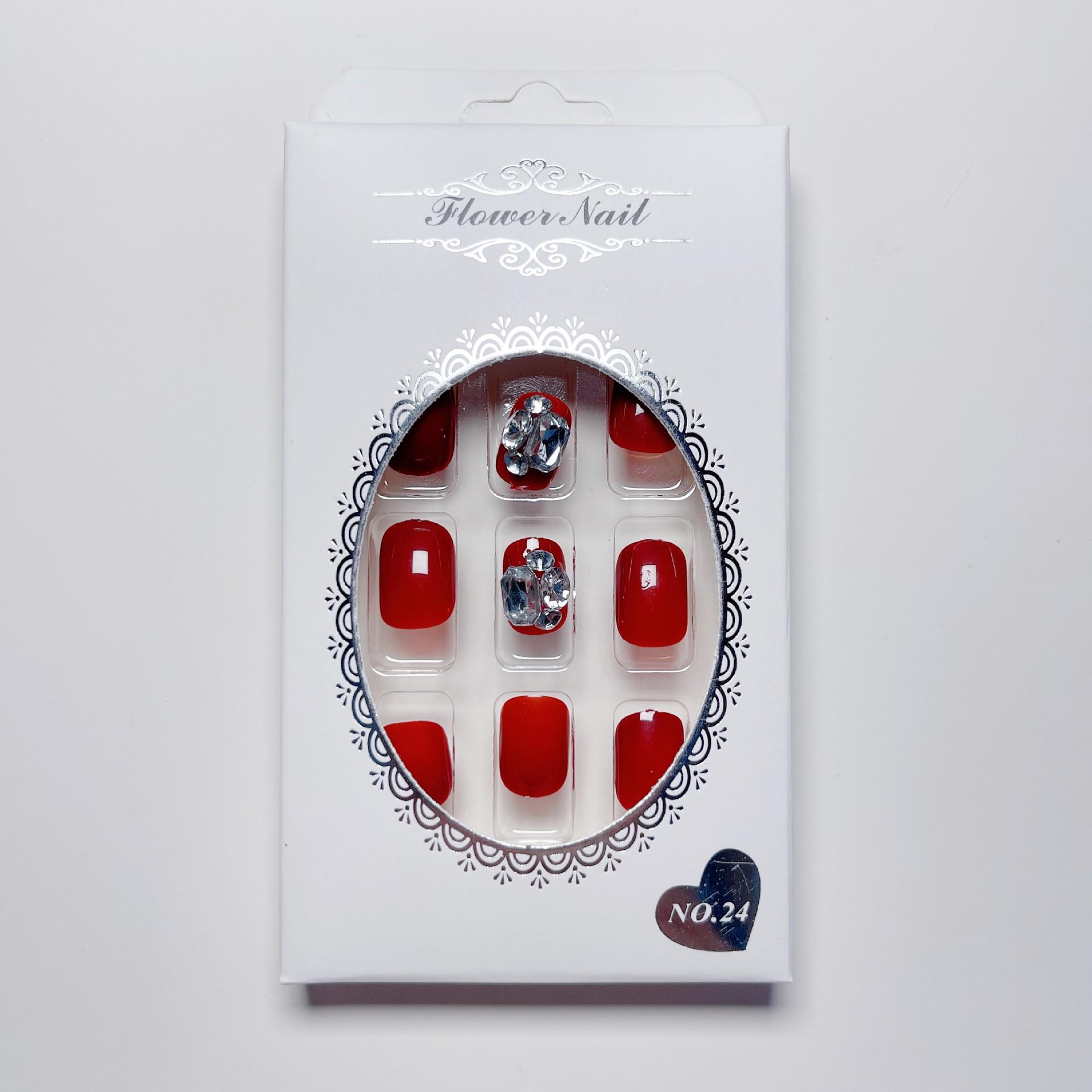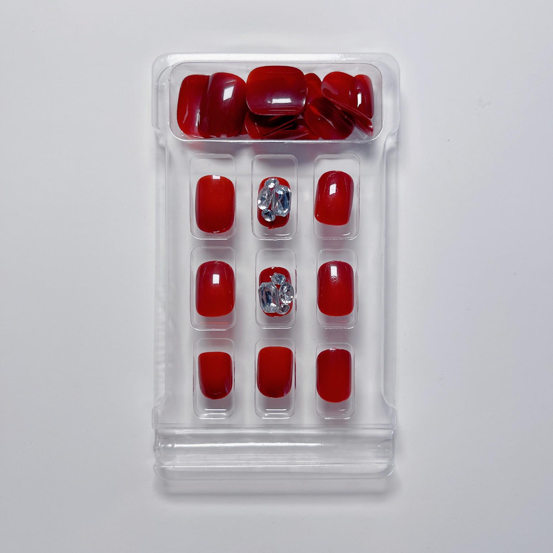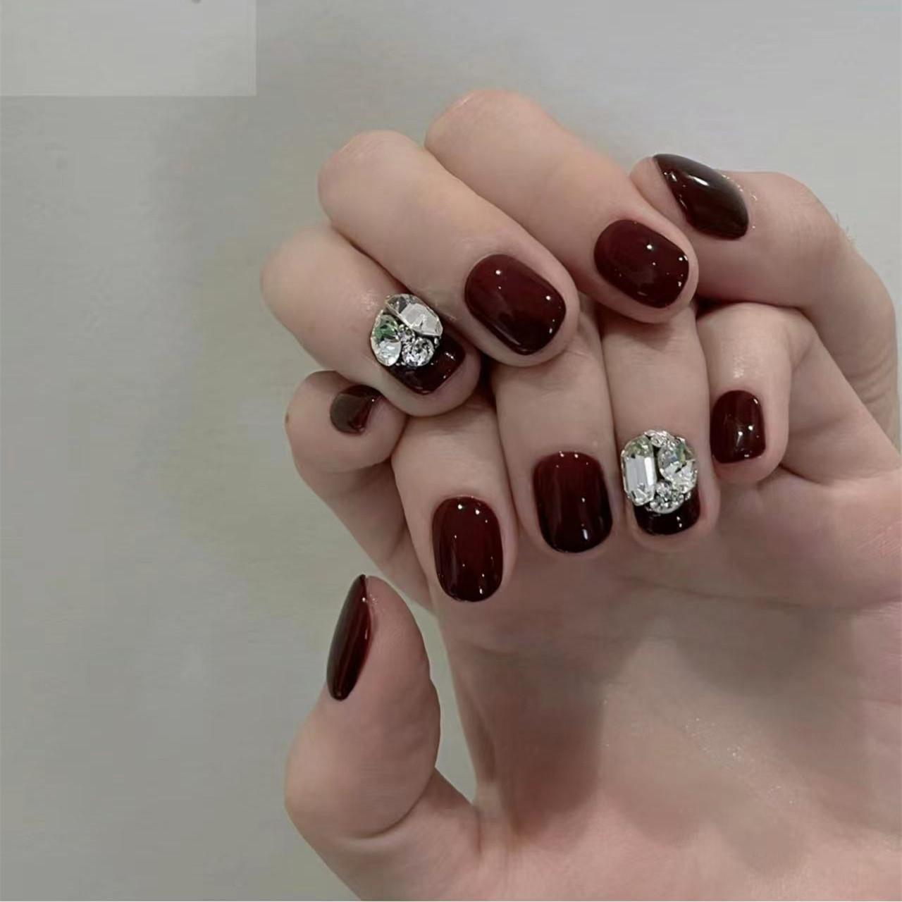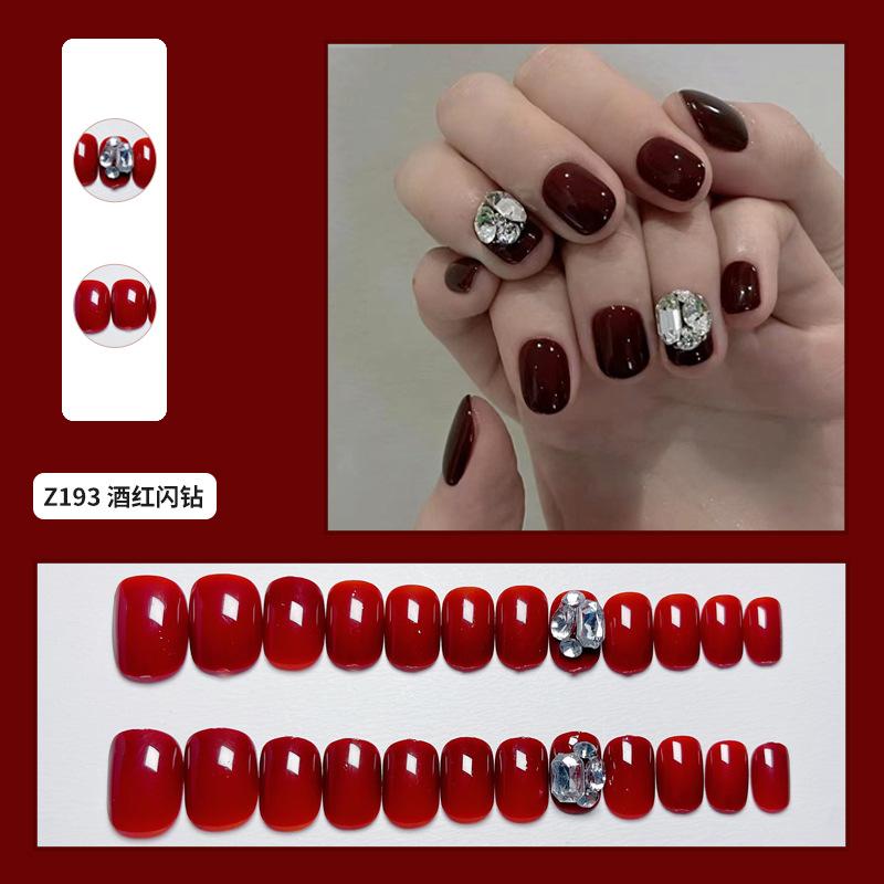 Ropa de año nuevo uña rojo vino flash diamante cuadrado corto blanco uña postiza desmontable manicura terminada pegatina de uña
