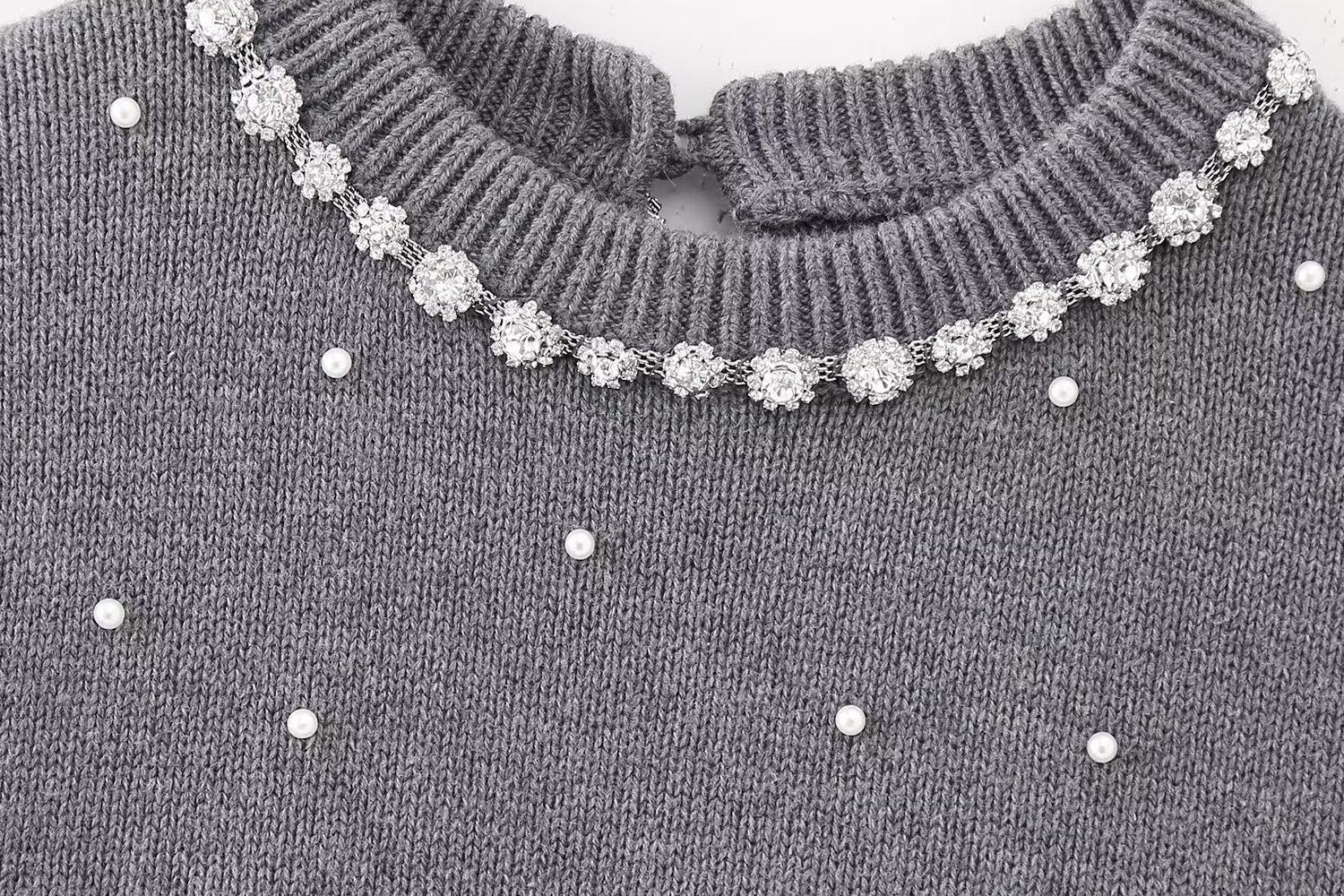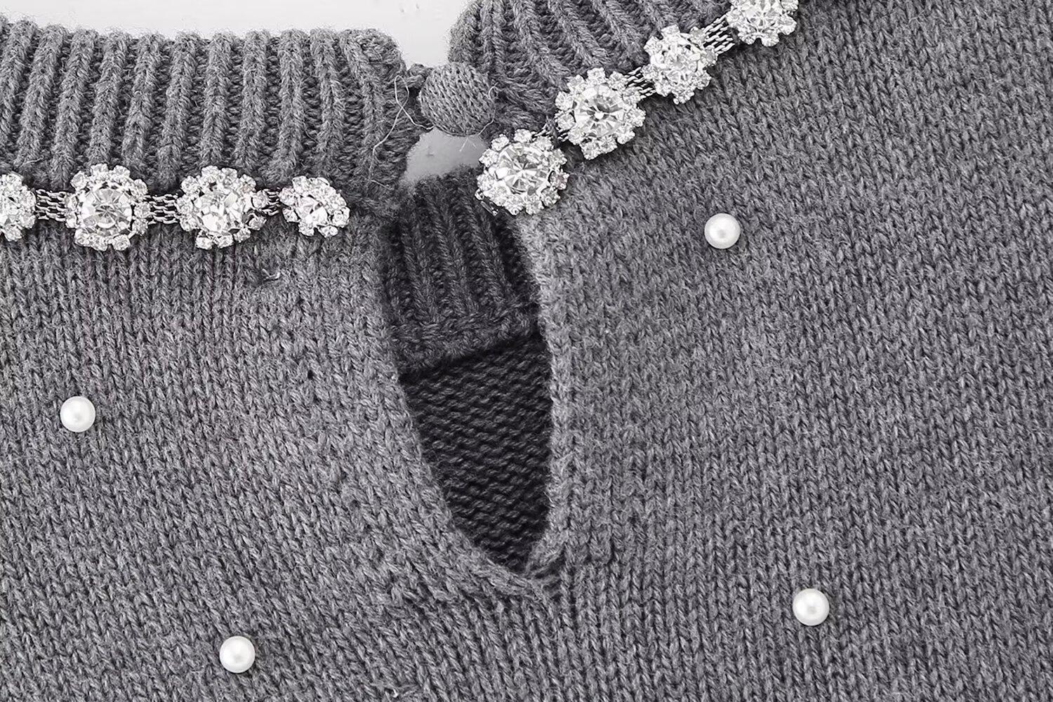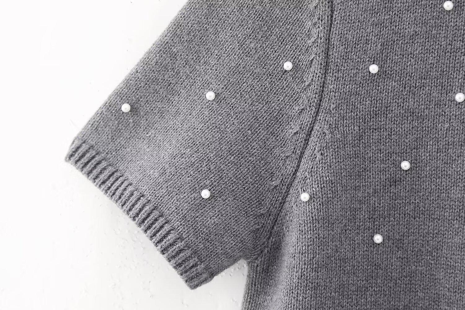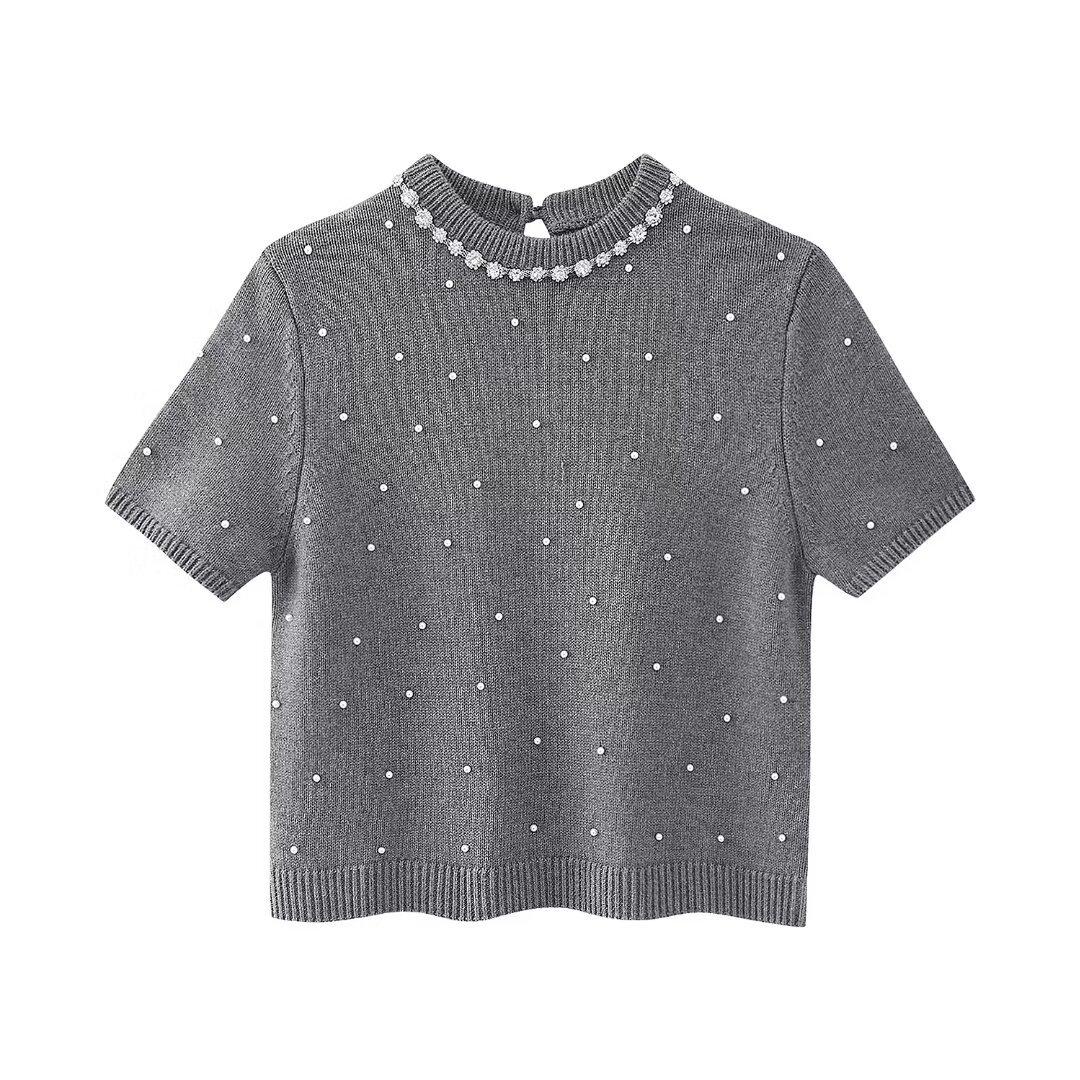 Compra Suéter de punto de manga corta con cuello redondo y perlas artificiales grises de moda transfronteriza europea y americana para mujer primavera y verano 2024 al por mayor en Joom.pro