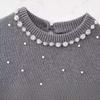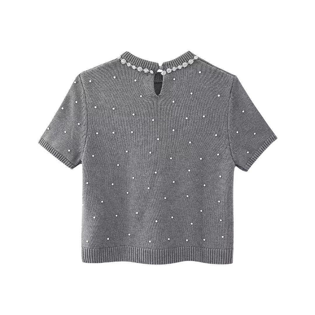 Suéter de punto de manga corta con cuello redondo y perlas artificiales grises de moda transfronteriza europea y americana para mujer primavera y verano 2024