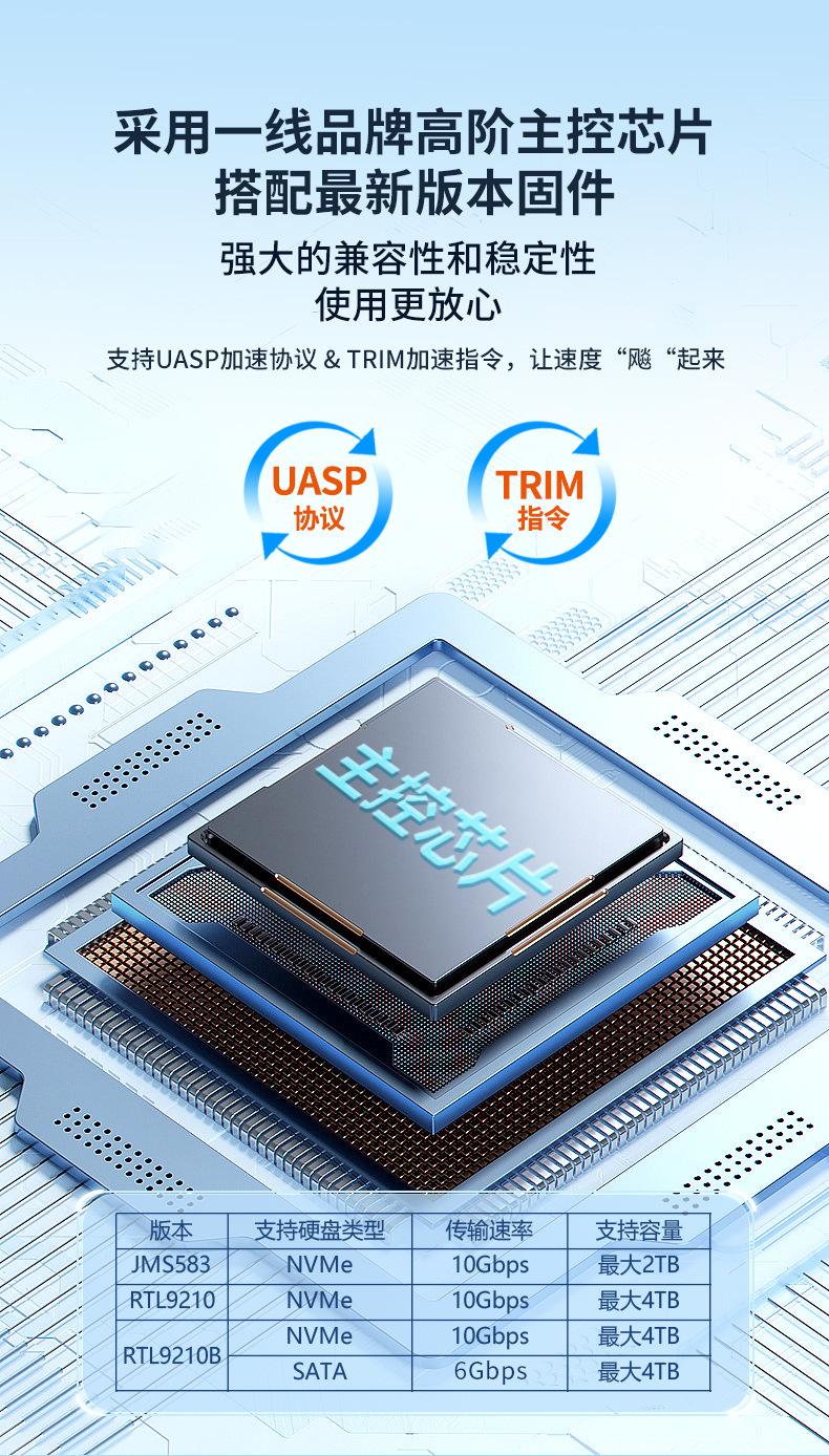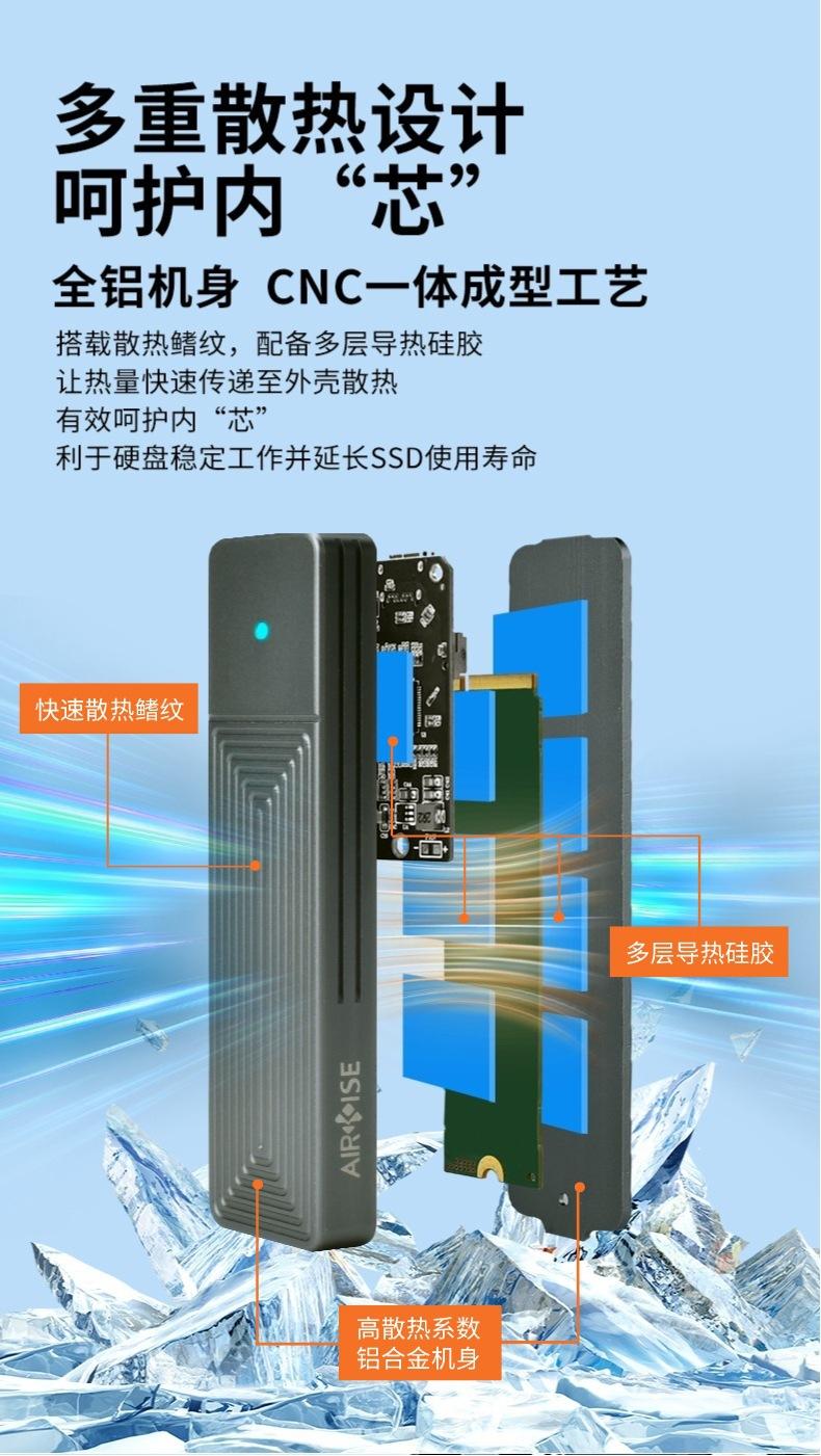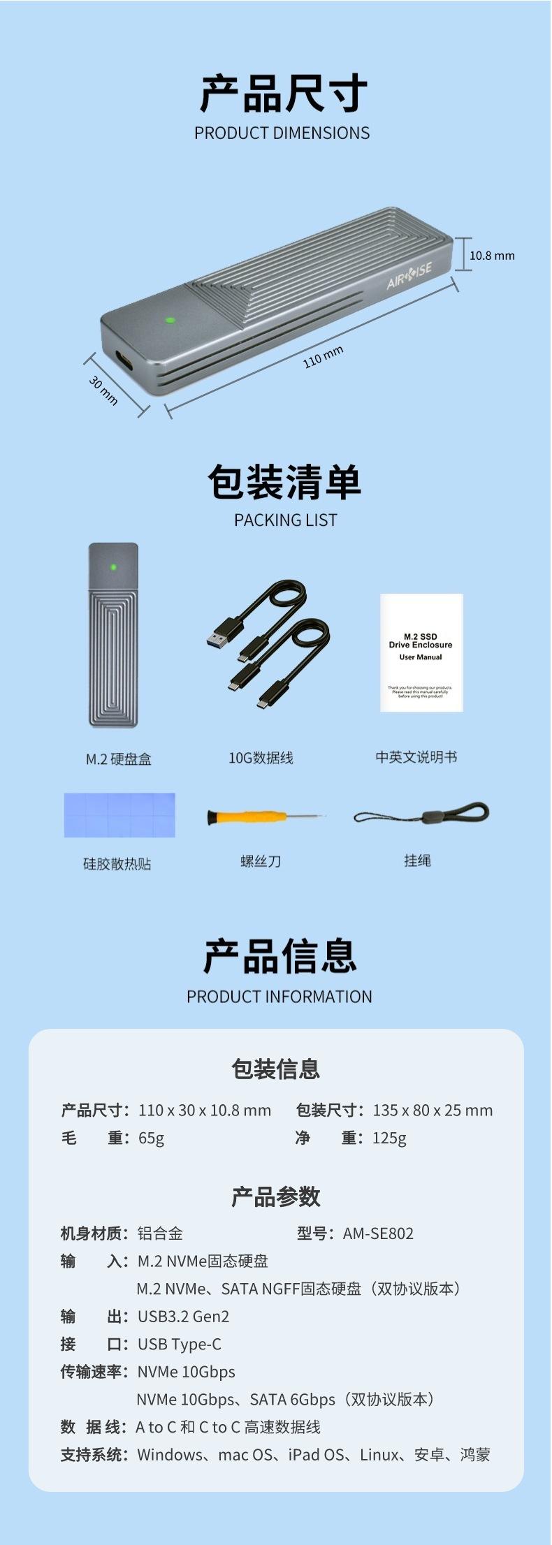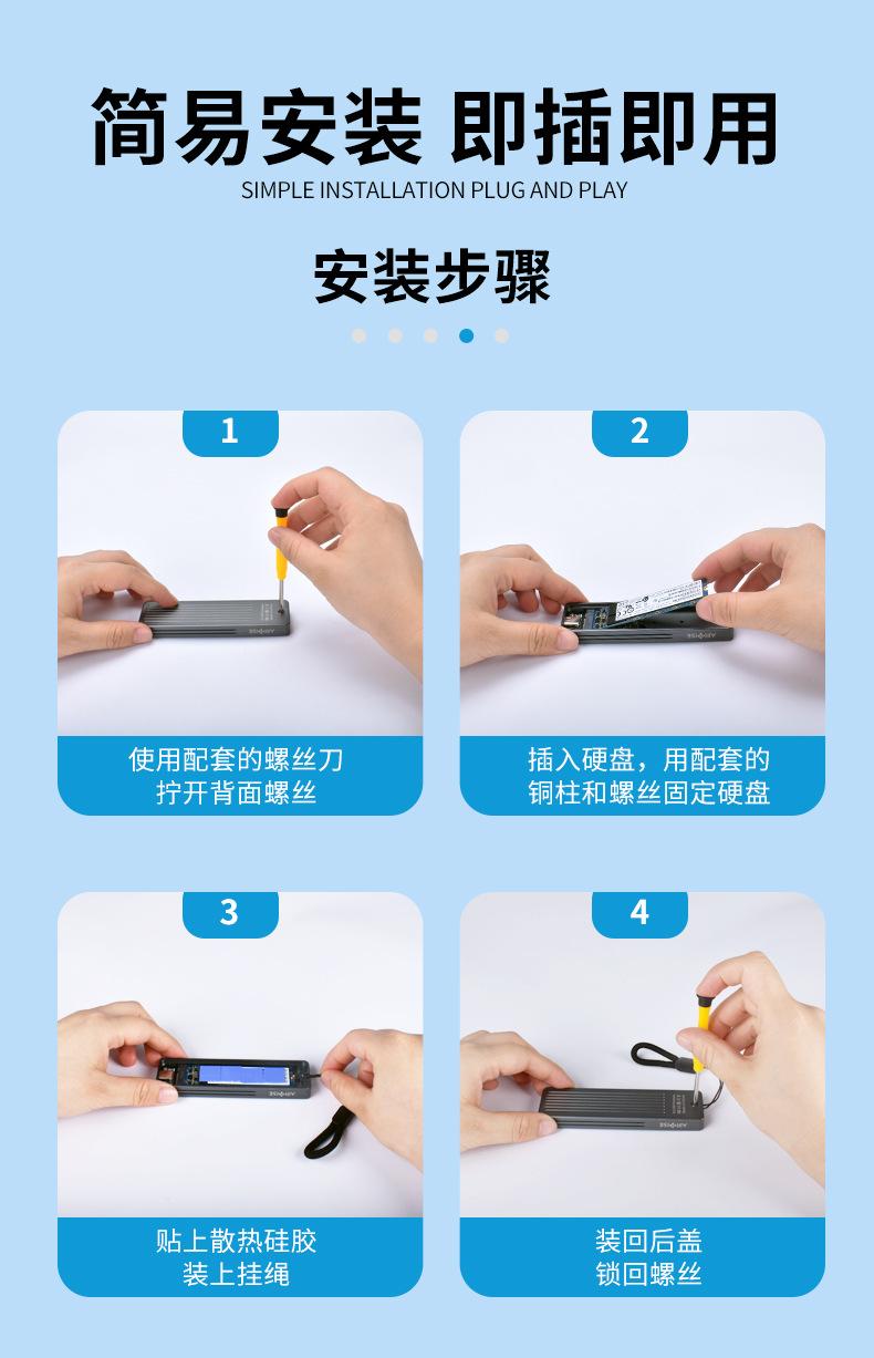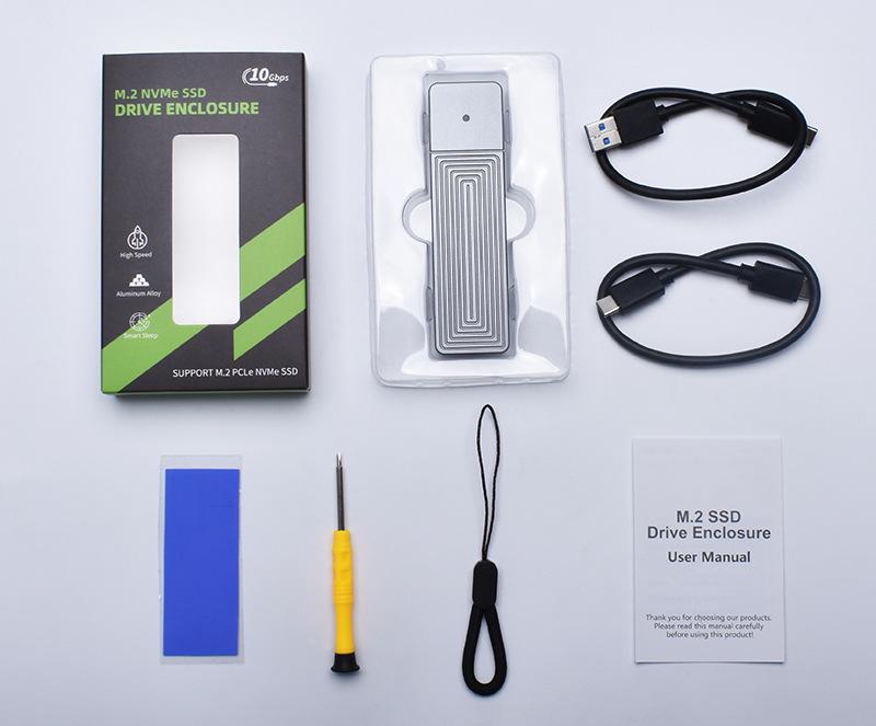 Lista de embalaje: Carcasa SSD M.2, cable de alta velocidad A a C, cable de datos de alta velocidad C a C, almohadilla térmica de silicona, destornillador, cordón, manual de instrucciones en chino e inglés