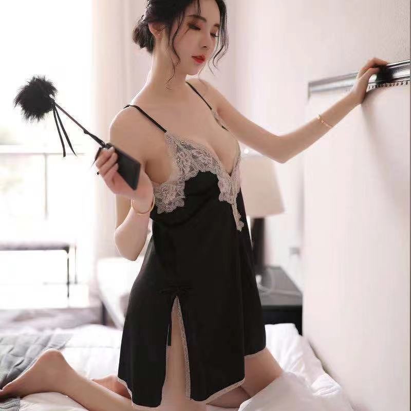 Camisón de encaje con escote en V profundo, lencería sexy, transparente, de seda hielo, pura, sexy, con tirantes y abertura lateral, para llevar en casa