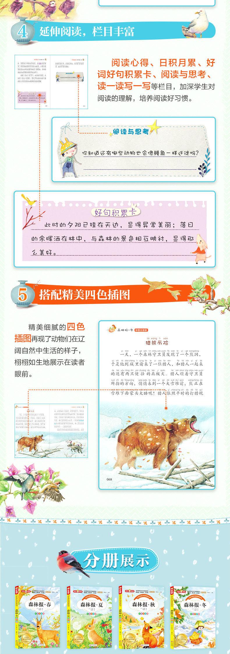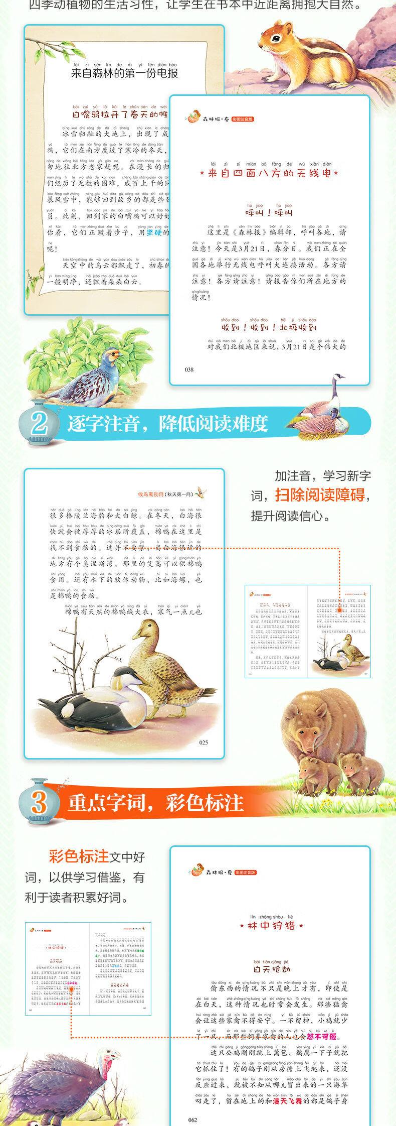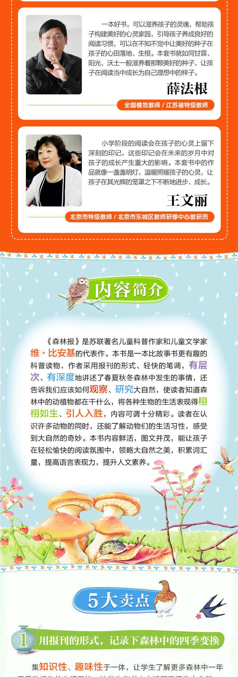 "Periódico del Bosque" es la obra maestra de V. Bianchi, un famoso escritor soviético de ciencia para niños y escritor de literatura infantil. Este libro es un libro de divulgación científica que es más interesante que un libro de cuentos. El autor utiliza la forma de periódicos y un estilo ágil para contar las cosas que suceden en el bosque en primavera, verano, otoño e invierno de manera estratificada y en profundidad. También nos dice cómo observar y estudiar la naturaleza, para que los lectores sepan lo que están haciendo los animales y las plantas del bosque, y la vida de varias criaturas es vívida y fascinante. El contenido es muy emocionante. Mientras los lectores conocen muchos animales, también pueden comprender los hábitos de vida de los animales y sentir las maravillas de la naturaleza. El contenido de este libro es fresco, con imágenes y textos, lo que puede permitir a los niños apreciar la belleza de la naturaleza, acumular vocabulario, mejorar la expresión lingüística y mejorar la alfabetización humanística en un ambiente de lectura relajado y agradable.