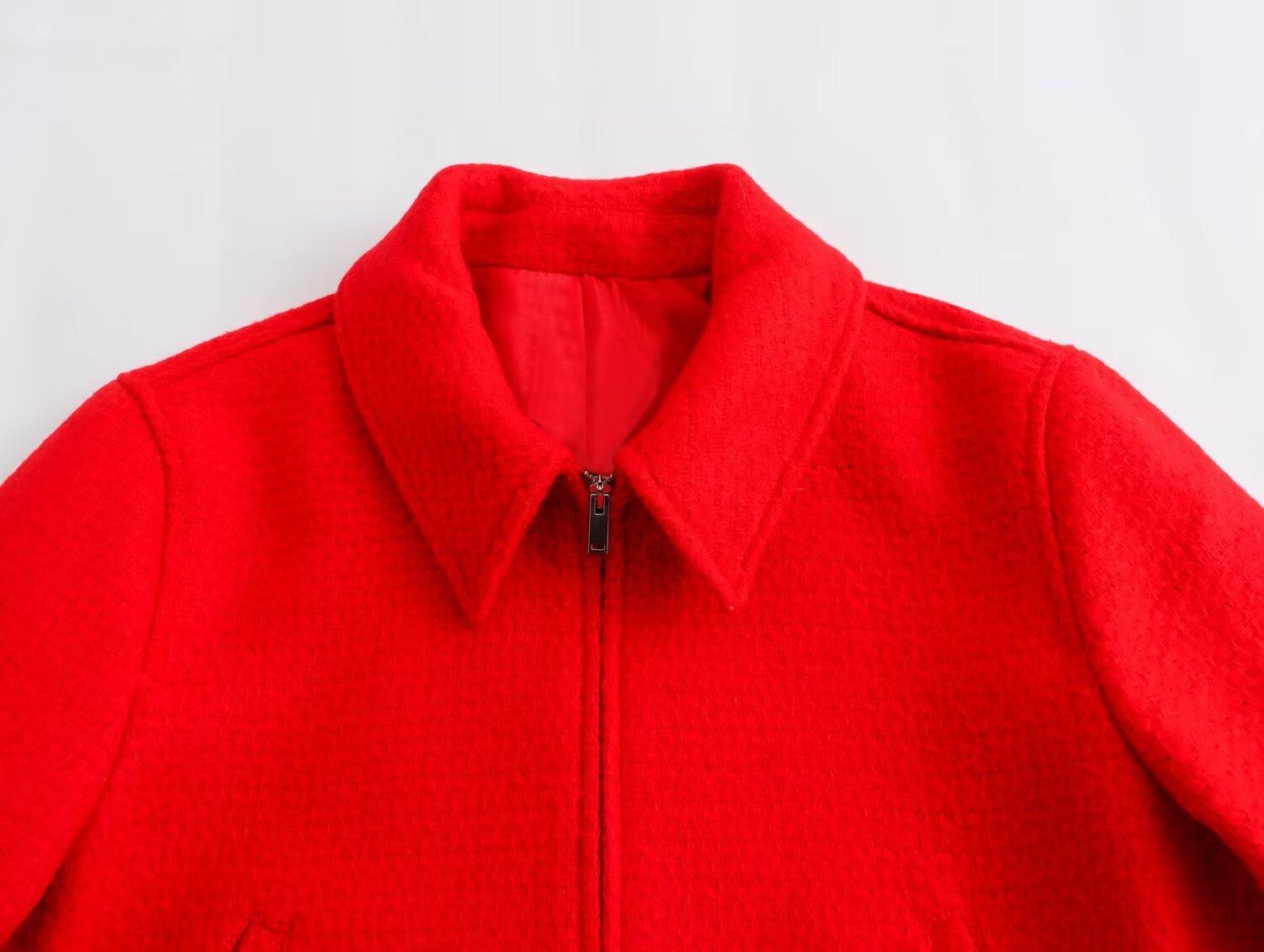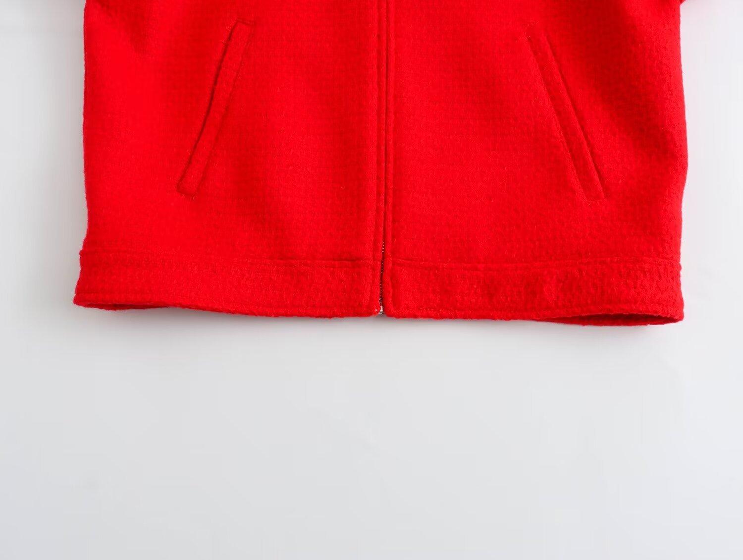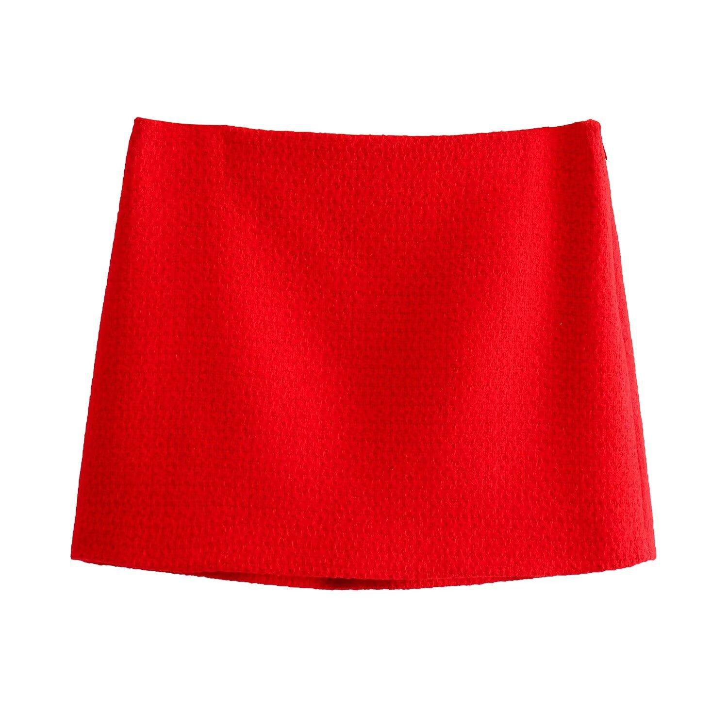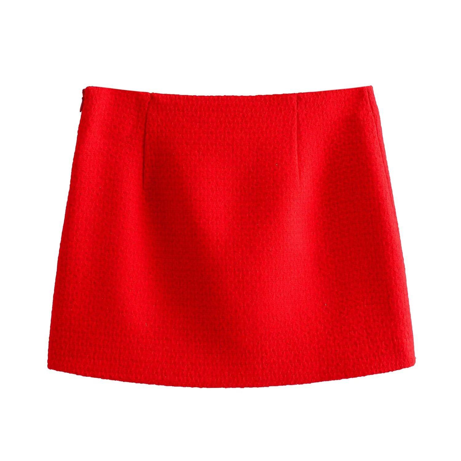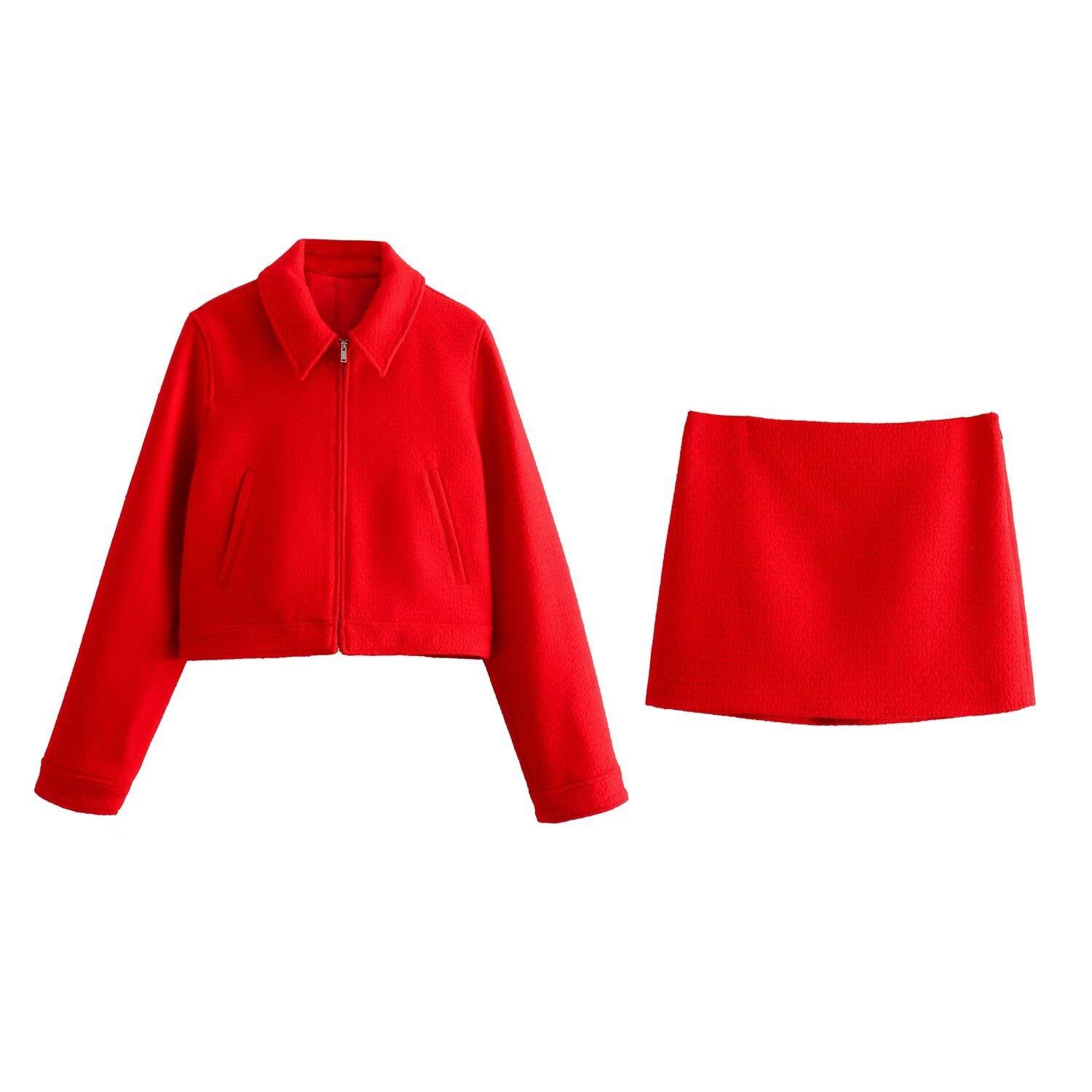 2024 Primavera Nuevo Europeo y Americano Transfronterizo para Mujer Rojo Chaqueta de Solapa Slub a la Moda + Falda Línea A