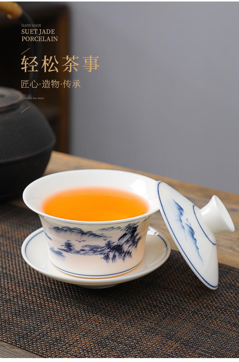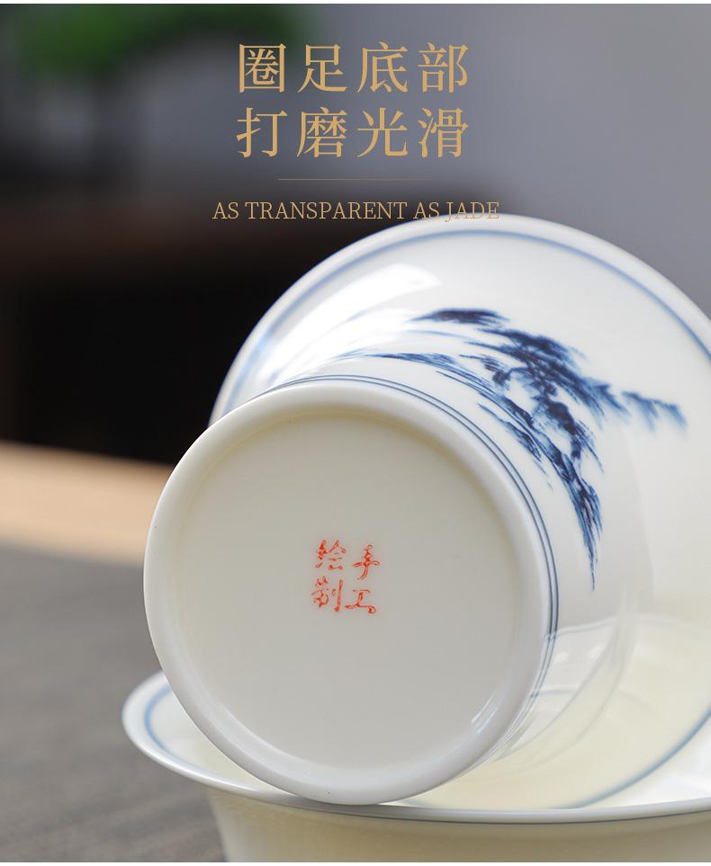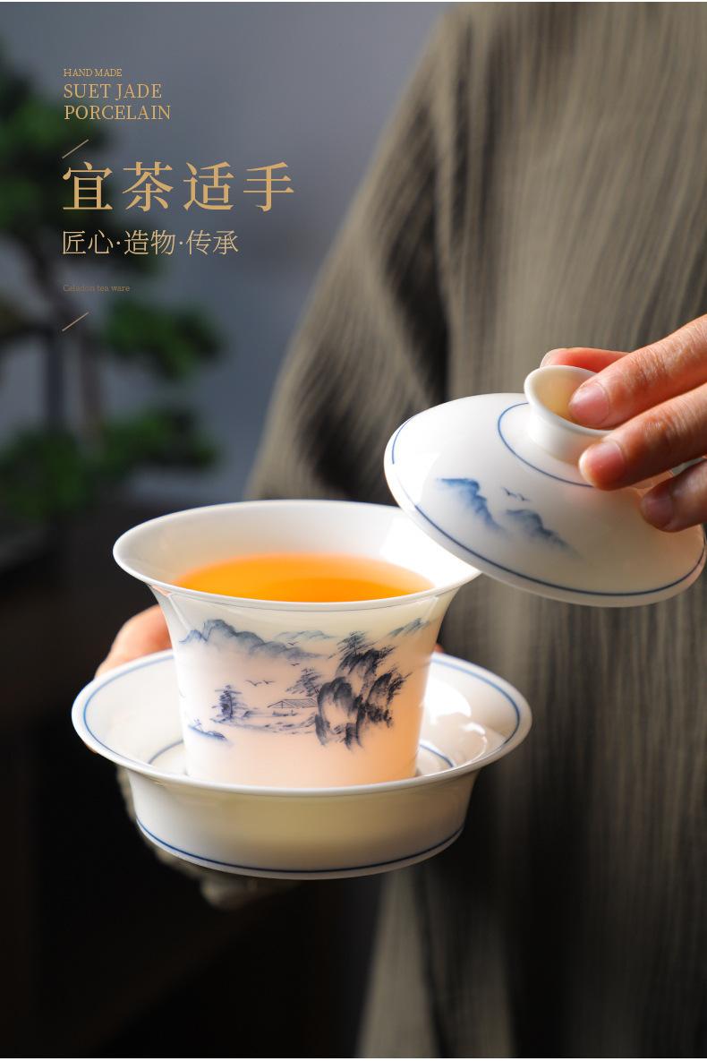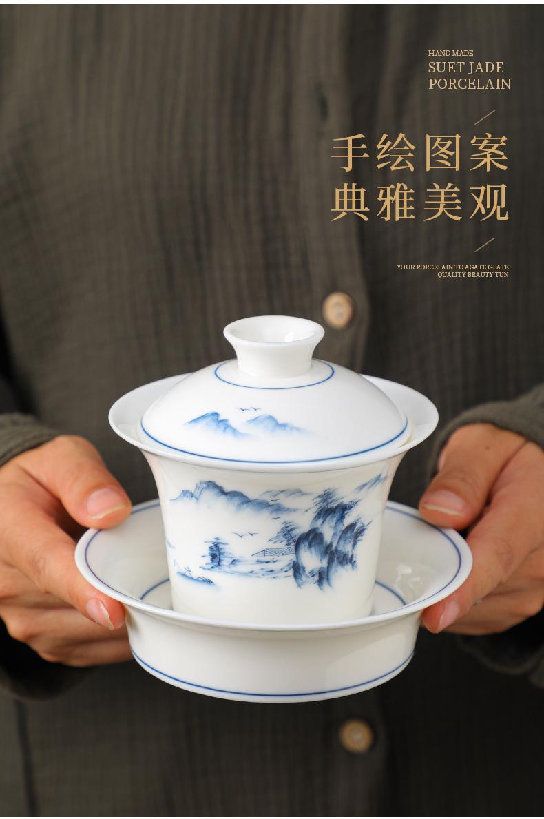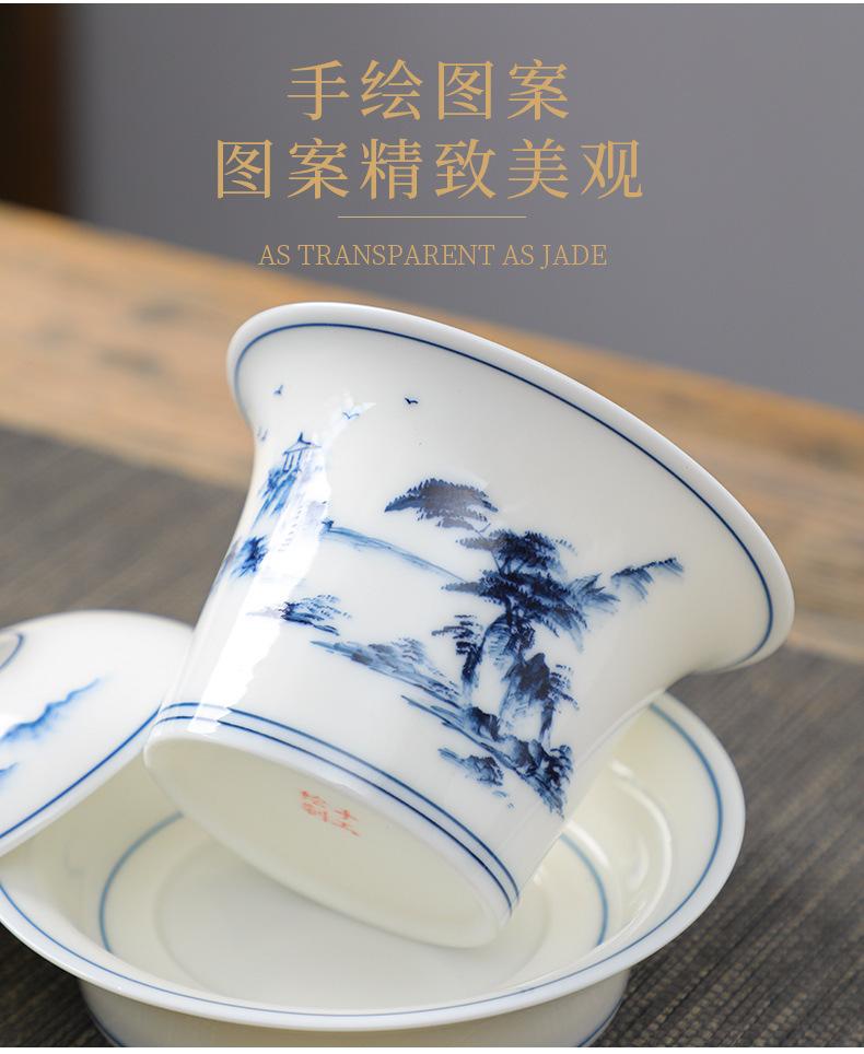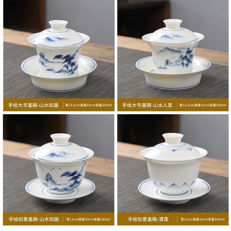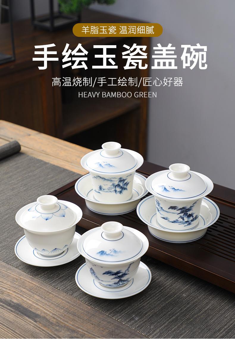 Jade graso de oveja pintado a mano azul y blanco cubierta Tazón sancai juego de té kung fu pintado a mano ceramica tetera tazón de té grande tazón de té individual