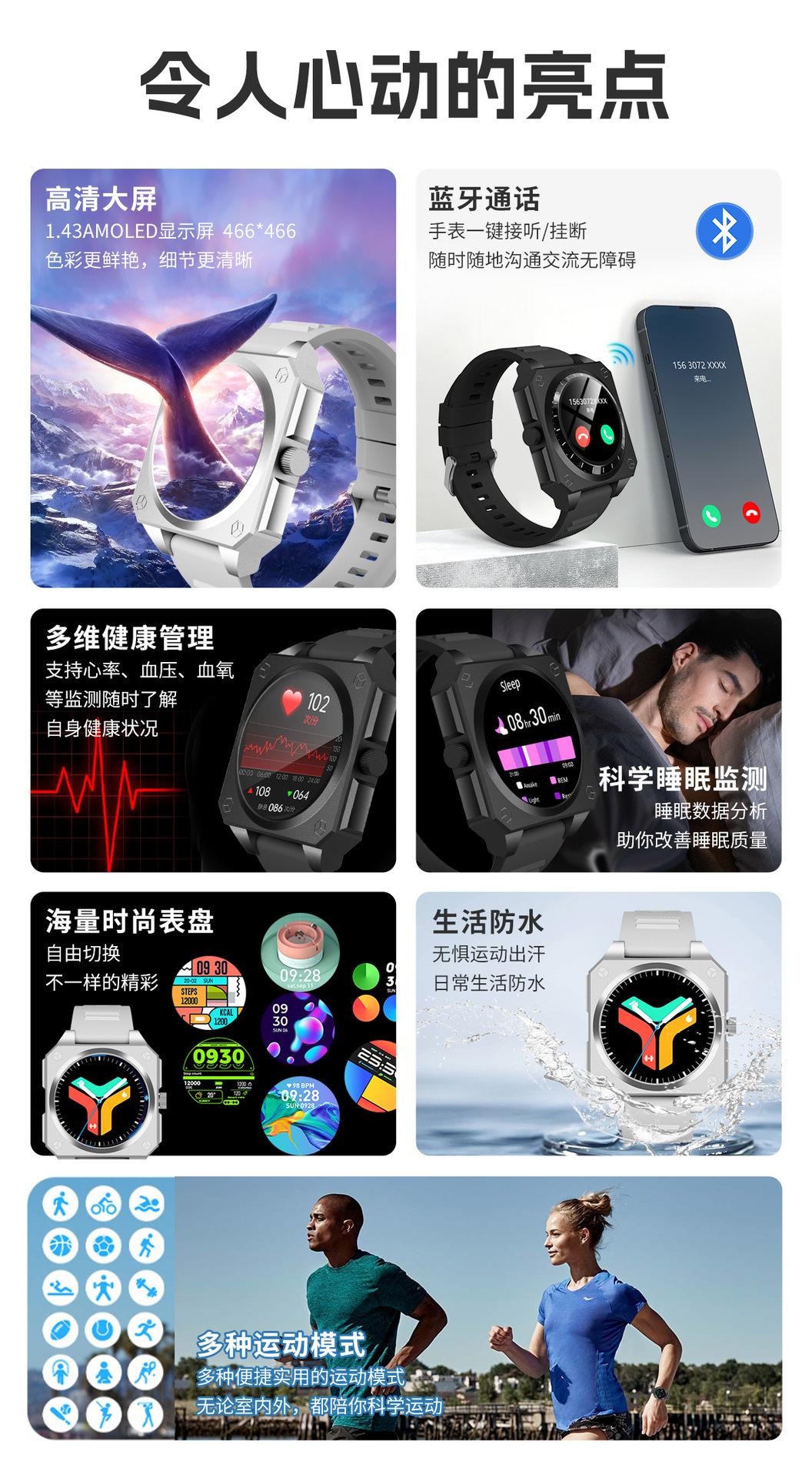Nuevo Reloj Inteligente Transfronterizo con Pantalla AMOLED de 1.43 Pulgadas, Monitoreo de Frecuencia Cardíaca y Oxígeno en Sangre, Llamada Bluetooth, Resistente al Agua