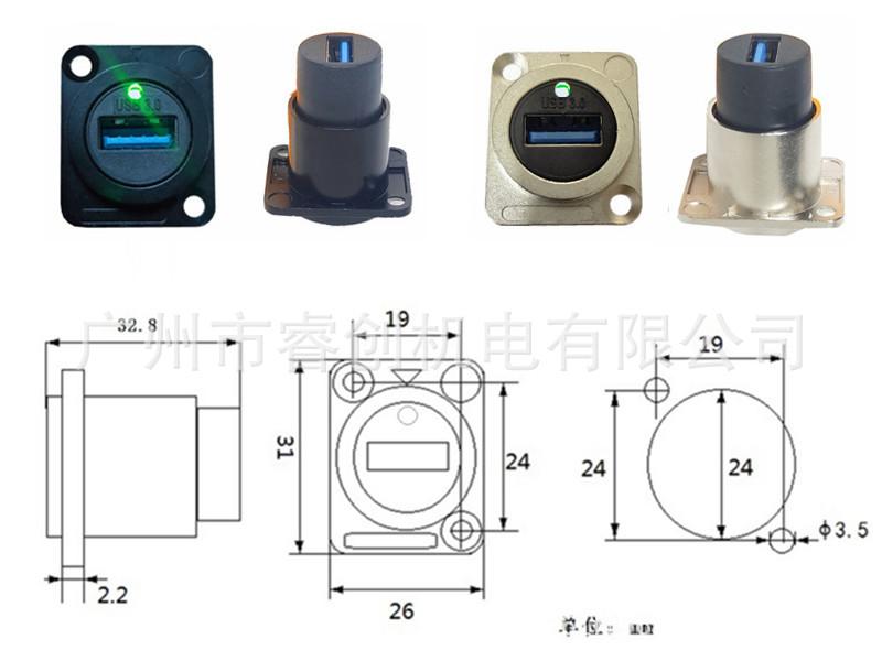 Conector de datos pasante tipo D en línea doble hembra USB 3.0, con luz indicadora, panel fijo negro